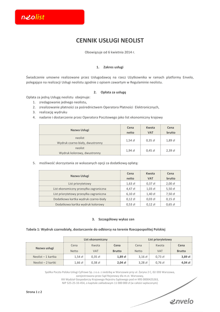 CENNIK USŁUGI NEOLIST Obowiązuje od 6 kwietnia 2014 r. 1. Zakres usługi Świadczenie umowne realizowane przez Usługodawcę na rzecz Użytkownika w ramach platformy Envelo, polegające na realizacji Usługi neolistu zgodnie z opisem zawartym w Regulaminie neolistu. 2. Opłata za usługę Opłata za jedną Usługę neolistu obejmuje: 1. zredagowanie jednego neolistu, 2. zrealizowanie płatności za pośrednictwem Operatora Płatności Elektronicznych, 3. realizację wydruku 4. nadanie i dostarczenie przez Operatora Pocztowego jako list ekonomiczny krajowy Nazwa Usługi Cena netto Kwota VAT Cena brutto neolist Wydruk czarno-biały, dwustronny 1,54 zł 0,35 zł 1,89 zł 1,94 zł 0,45 zł 2,39 zł neolist Wydruk kolorowy, dwustronny 5. możliwość skorzystania ze wskazanych opcji za dodatkową opłatą: Nazwa Usługi Cena netto Kwota VAT Cena brutto List priorytetowy 1,63 zł 0,37 zł 2,00 zł List ekonomiczny przesyłka zagraniczna 4,47 zł 1,03 zł 5,50 zł List priorytetowy przesyłka zagraniczna 6,10 zł 1,40 zł 7,50 zł Dodatkowa kartka wydruk czarno-biały 0,12 zł 0,03 zł 0,15 zł Dodatkowa kartka wydruk kolorowy 0,53 zł 0,12 zł 0,65 zł 3. Szczegółowy wykaz cen Tabela 1: Wydruk czarnobiały, dostarczenie do odbiorcy na terenie Rzeczpospolitej Polskiej List ekonomiczny Nazwa usługi Cena Netto List priorytetowy Kwota Cena Cena VAT Brutto Netto Kwota Cena VAT Brutto Neolist – 1 kartka 1,54 zł 0,35 zł 1,89 zł 3,16 zł 0,73 zł 3,89 zł Neolist – 2 kartki 1,66 zł 0,38 zł 2,04 zł 3,28 zł 0,76 zł 4,04 zł Spółka Poczta Polska Usługi Cyfrowe Sp. z o.o. z siedzibą w Warszawie przy ul. Żaryna 2 C, 02-593 Warszawa, zarejestrowana przez Sąd Rejonowy dla m.st. Warszawy, XIII Wydział Gospodarczy Krajowego Rejestru Sądowego pod nr KRS 0000425263, NIP 525-25-33-454, o kapitale zakładowym 11 000 000 zł (w całości wpłaconym) Strona 1 z 2 Neolist – 3 kartki 1,78 zł 0,41 zł 2,19 zł 3,41 zł 0,78 zł 4,19 zł Neolist – 4 kartki 1,90 zł 0,44 zł 2,34 zł 3,53 zł 0,81 zł 4,34 zł Neolist – 5 kartek 2,02 zł 0,47 zł 2,49 zł 3,65 zł 0,84 zł 4,49 zł Neolist – 6 kartek 2,15 zł 0,49 zł 2,64 zł 3,77 zł 0,87 zł 4,64 zł Tabela 2: Wydruk czarnobiały, dostarczenie do odbiorcy poza Rzeczpospolitą Polską List ekonomiczny Nazwa usługi List priorytetowy Cena Kwota Cena Cena Kwota Cena Netto VAT Brutto Netto VAT Brutto Neolist – 1 kartka 6,01 zł 1,38 zł 7,39 zł 7,63 zł 1,76 zł 9,39 zł Neolist – 2 kartki 6,13 zł 1,41 zł 7,54 zł 7,76 zł 1,78 zł 9,54 zł Neolist – 3 kartki 6,25 zł 1,44 zł 7,69 zł 7,88 zł 1,81 zł 9,69 zł Neolist – 4 kartki 6,37 zł 1,47 zł 7,84 zł 8,00 zł 1,84 zł 9,84 zł Neolist – 5 kartek 6,50 zł 1,49 zł 7,99 zł 8,12 zł 1,87 zł 9,99 zł Neolist – 6 kartek 6,62 zł 1,52 zł 8,14 zł 8,24 zł 1,90 zł 10,14 zł Tabela 3: Wydruk kolorowy, dostarczenie do odbiorcy na terenie Rzeczpospolitej Polskiej List ekonomiczny Nazwa usługi List priorytetowy Cena Kwota Cena Cena Kwota Cena Netto VAT Brutto Netto VAT Brutto Neolist – 1 kartka 1,94 zł 0,45 zł 2,39 zł 3,57 zł 0,82 zł 4,39 zł Neolist – 2 kartki 2,47 zł 0,57 zł 3,04 zł 4,10 zł 0,94 zł 5,04 zł Neolist – 3 kartki 3,00 zł 0,69 zł 3,69 zł 4,63 zł 1,06 zł 5,69 zł Neolist – 4 kartki 3,53 zł 0,81 zł 4,34 zł 5,15 zł 1,19 zł 6,34 zł Neolist – 5 kartek 4,06 zł 0,93 zł 4,99 zł 5,68 zł 1,31 zł 6,99 zł Neolist – 6 kartek 4,59 zł 1,05 zł 5,64 zł 6,21 zł 1,43 zł 7,64 zł Tabela 4: Wydruk kolorowy, dostarczenie do odbiorcy poza Rzeczpospolitą Polską List ekonomiczny Nazwa usługi Cena Netto List priorytetowy Kwota Cena Cena VAT Brutto Netto Kwota Cena VAT Brutto Neolist – 1 kartka 6,41 zł 1,48 zł 7,89 zł 8,04 zł 1,85 zł 9,89 zł Neolist – 2 kartki 6,94 zł 1,60 zł 8,54 zł 8,57 zł 1,97 zł 10,54 zł Neolist – 3 kartki 7,47 zł 1,72 zł 9,19 zł 9,10 zł 2,09 zł 11,19 zł Neolist – 4 kartki 8,00 zł 1,84 zł 9,84 zł 9,63 zł 2,21 zł 11,84 zł Neolist – 5 kartek 8,53 zł 1,96 zł 10,49 zł 10,15 zł 2,34 zł 12,49 zł Neolist – 6 kartek 9,06 zł 2,08 zł 11,14 zł 10,68 zł 2,46 zł 13,14 zł Spółka Poczta Polska Usługi Cyfrowe Sp. z o.o. z siedzibą w Warszawie przy ul. Żaryna 2 C, 02-593 Warszawa, zarejestrowana przez Sąd Rejonowy dla m.st. Warszawy, XIII Wydział Gospodarczy Krajowego Rejestru Sądowego pod nr KRS 0000425263, NIP 525-25-33-454, o kapitale zakładowym 11 000 000 zł (w całości wpłaconym) Strona 2 z 2