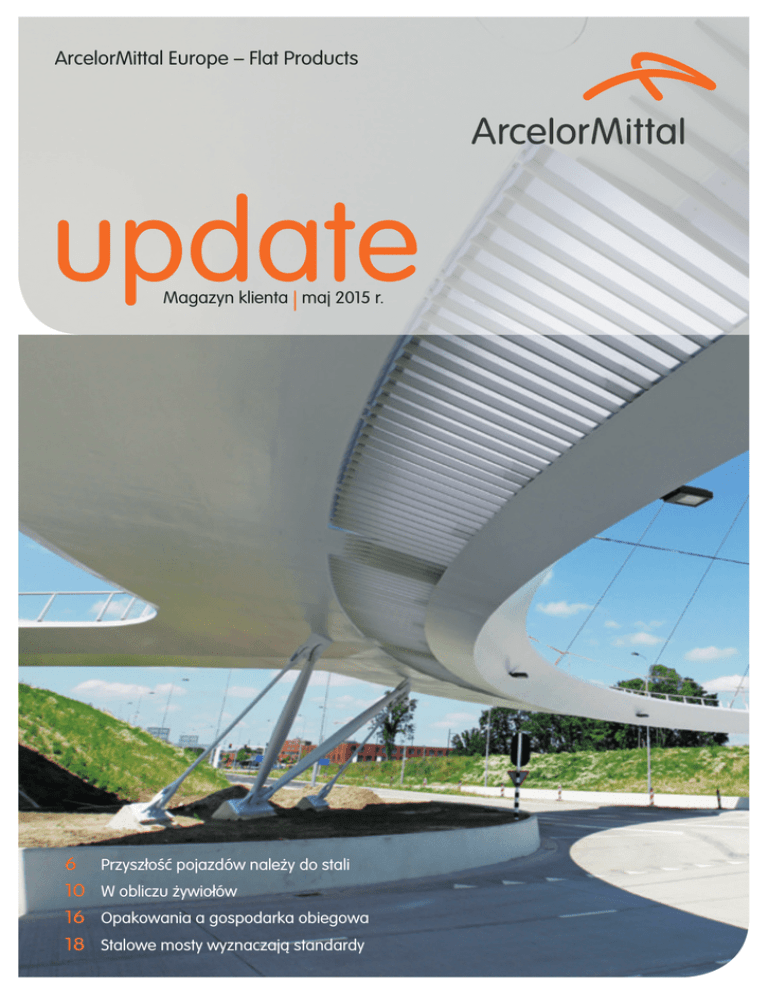 ArcelorMittal Europe – Flat Products update Magazyn klienta | maj 2015 r. 6 Przyszłość pojazdów należy do stali 10 W obliczu żywiołów 16 Opakowania a gospodarka obiegowa 18 Stalowe mosty wyznaczają standardy Contents Spis treści 04 ArcelorMittal Tailored Blanks goes the extra mile Przyłączenie do sieci 4 16 Transforming efciency 16 Opakowania agrain gospodarka obiegowa Improved oriented electrical steels meet 2015 energy efficiency targets. W holistycznym, zrównoważonym podejściu do optymalizacji zasobów stal opakowaniowa może stać się źródłem istotnych korzyści. New ArcelorMittal investments to keep pace with i Corinth Pipeworks carmakers. wypełniają surowe normy i napięte harmonogramy dostaw na budowę nowego gazociągu. 06 Going orange, staying green! 6 PrzyszłośćArcelorMittal pojazdów należy do instali Europe brands coils 18 Increasing the life and load capacity heavywyznaczają equipmentstandardy 18 Staloweofmosty 07 VAMA inaugurates landmark 8 Dotrzeć zautomotive przekazemsteel plant 1921 Meeting the world’s need for energy Fundamenty energii wiatrowej Oil and gas: from steel to solutions. new livery. Proces współinżynierii firmy ArcelorMittal to nieprzerwanie wsparcie klientów z sektora motoryzacyjnego. NewOrganizacje continuous annealing out promująceline stalrolls zwiększają first coil in China. jej udział w rynku budowlanym. 08 In the same boat! 10 W obliczu żywiołów ArcelorMittal Europe presents complete shipbuilding offer instalacji at SMM. solarnych materiał Operatorom Magnelis® zapewnia ponad ćwierć wieku funkcjonowania praktycznie bez konieczności podejmowania jakichkolwiek działań konserwacyjnych. ArcelorMittal promotesgatunki full andstali global Nowe dekoracyjne offer for yellow and green good wysokiej wytrzymałości inspiracją manufacturers. dla twórczych projektów mostów. Navantia, klient firmy ArcelorMittal, wygrywa przetarg na konstrukcję fundamentów morskiej farmy wiatrowej Wikinger. 20 Steel can, and does! 22 Volkswagen wystawia zakładom ArcelorMittal’s steels for beverage cans lower costs and improve sustainability. ArcelorMittal St-Chély d’Apcher najwyższą ocenę 22 Excelling 11 ArcelorMittal to launch new toolbox for architects 12 Inwestycje w przyszłość motoryzacji Steelw Envelope showcases a selection of Europie our aesthetic steels for construction. ArcelorMittal kontynuuje program rozbudowy swych europejskich aktywów z myślą o stworzeniu kolejnej generacji stali dla przemysłu samochodowego. Huta St-Chély d’Apcher firmy ArcelorMittal otrzymała najwyższą możliwą ocenę A w dwóch audytach VDA przeprowadzonych in pre-painted steel przez koncern motoryzacyjny Volkswagen ArcelorMittal strengthens involvement oraz jego bezpośredniego dostawcę, withfirmę ECCA. Kienle + Spiess. 24 Serce urządzenia Elektrotechniczna stal firmy ArcelorMittal źródłem mocy urządzeń AGD firmy Miele. 12 Aluzinc stars in agship of French sport 24 Making it easier to put the right steel in the right place prestigious coating forspod 14 2015 – The Kolejny rokmetal innowacji prestigious projects. ® znaku ArcelorMittal Innowacyjność podstawą polityki handlowej firmy ArcelorMittal. Online Automotive Product Catalogue gets a complete revamp. 14 A local approach, globally 2 Copyright: All rights reserved. No part of this publication may be reproduced in any form or by any means without prior permission in writing. Although care has been taken that the information in this publication is accurate, ArcelorMittal International extends the ArcelorMittal does not accept any liability for errors or omissions. reach of ArcelorMittal Europe – Flat Design & production: Geers Offset nv Products. Dan Smith (MachMedia) Copyright: Wszelkie prawa zastrzeżone. Żadna część niniejszej publikacji nie możeEditor: Opracowanie: ArcelorMittal Europe Communications być w jakiejkolwiek formie i jakąkolwiek metodą powielana bez pisemnej zgody Editor-in-chief: Redakcja: Dieter Vandenhende Editorial responsibility: ArcelorMittal Flat Carbon Europe S.A. wydawcy. Pomimo podjęcia należytych środków dla zapewnienia ścisłości ArcelorMittal Flat Carbon Europe S.A. Vanessa Vanhalst, 19, 24-26 avenueBoulevard de la Liberté, L-2930 Luxembourg informacji zawartych w niniejszej publikacji, frma ArcelorMittal nie ponosi Vanessa Vanhalst, d’Avranches, flateurope.arcelormittal.com odpowiedzialności za ewentualne błędy bądź braki. L-1160 Luxembourg, flateurope.arcelormittal.com Update l Client magazine l November 2014 2 Update l Magazyn klienta l maj 2015 r. N_Update_nov 2014.indd 2 19/11/14 17:01 Opinia Siła globalnej obecności W kolejnych numerach magazynu Update publikujemy wypowiedzi liderów firmy ArcelorMittal. W bieżącym wydaniu jest nim Philippe Aubron, Chief Marketing Officer w ArcelorMittal Automotive Europe. „Ogólnoświatowa obecność firmy ArcelorMittal oraz kultura innowacji ułatwiają producentom samochodów tworzenie lżejszych i bezpieczniejszych pojazdów”. Oferta firmy ArcelorMittal adresowana do producentów samochodów to nie tylko dostawy szerokiej gamy wyrobów stalowych dla branży motoryzacyjnej. Stosując politykę przywództwa opartego na wartościach, odgrywamy również wiodącą rolę w zakresie dystrybucji oraz ułatwiamy klientom pełne wykorzystanie walorów naszych wyrobów. Stal nieodmiennie pozostaje najbardziej efektywnym kosztowo i przyjaznym dla środowiska materiałem, jaki producenci samochodów mogą wybrać z myślą o zmniejszeniu ciężaru pojazdu. Nowatorskie gatunki stali w połączeniu z inteligentnym procesem inżynieryjnym umożliwiają producentom OEM uzyskanie znaczących obniżek ciężaru odpowiadających wartościom uzyskiwanym przez konkurencję, jednakże przy ułamku ponoszonych przez nich kosztów. zatrudnia niemalże 600 osób. Ponadto, 34 inżynierów-rezydentów ulokowanych jest u producentów pojazdów w każdym niemalże regionie świata. Za 
