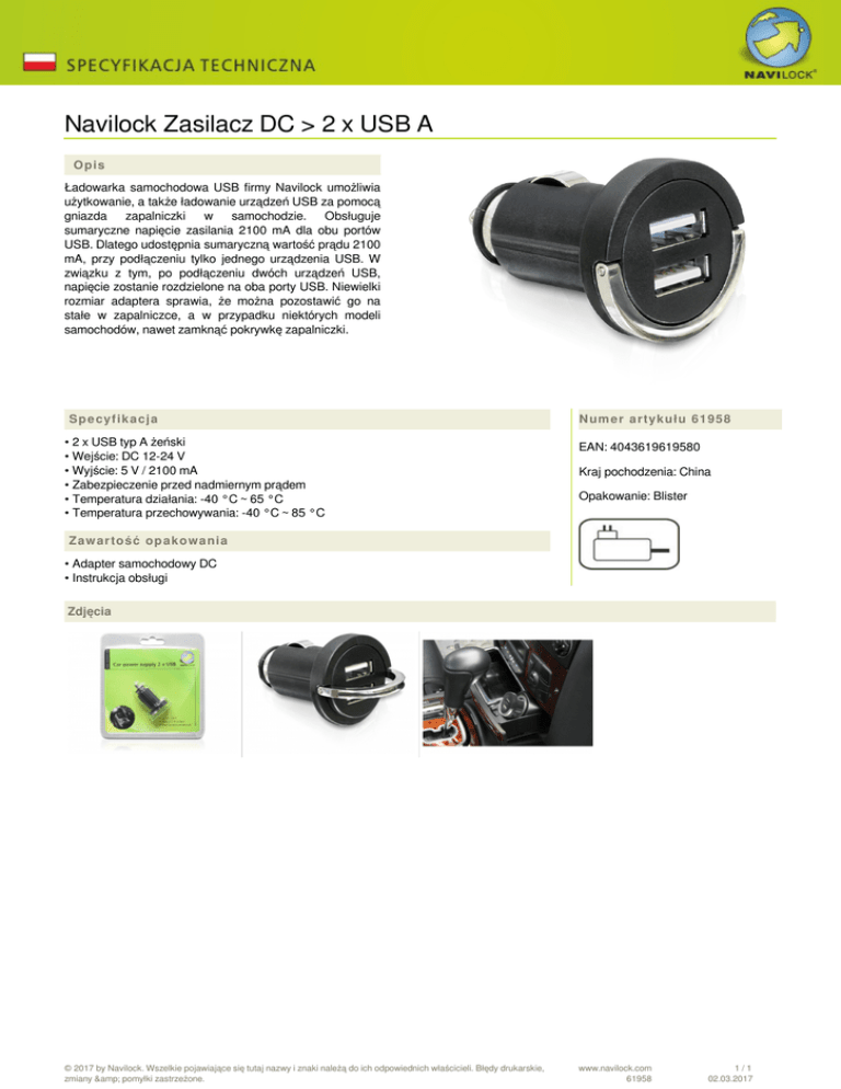 Navilock Zasilacz DC > 2 x USB A Opis Ładowarka samochodowa USB firmy Navilock umożliwia użytkowanie, a także ładowanie urządzeń USB za pomocą gniazda zapalniczki w samochodzie. Obsługuje sumaryczne napięcie zasilania 2100 mA dla obu portów USB. Dlatego udostępnia sumaryczną wartość prądu 2100 mA, przy podłączeniu tylko jednego urządzenia USB. W związku z tym, po podłączeniu dwóch urządzeń USB, napięcie zostanie rozdzielone na oba porty USB. Niewielki rozmiar adaptera sprawia, że można pozostawić go na stałe w zapalniczce, a w przypadku niektórych modeli samochodów, nawet zamknąć pokrywkę zapalniczki. Specyfikacja • 2 x USB typ A żeński • Wejście: DC 12-24 V • Wyjście: 5 V / 2100 mA • Zabezpieczenie przed nadmiernym prądem • Temperatura działania: -40 °C ~ 65 °C • Temperatura przechowywania: -40 °C ~ 85 °C Numer artykułu 61958 EAN: 4043619619580 Kraj pochodzenia: China Opakowanie: Blister Zawartość opakowania • Adapter samochodowy DC • Instrukcja obsługi Zdjęcia © 2017 by Navilock. Wszelkie pojawiające się tutaj nazwy i znaki należą do ich odpowiednich właścicieli. Błędy drukarskie, zmiany & pomyłki zastrzeżone. Powered by TCPDF (www.tcpdf.org) www.navilock.com 61958 1/1 02.03.2017