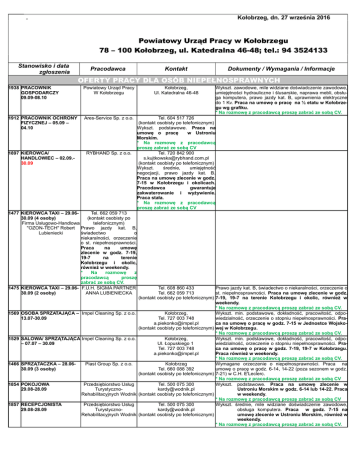 Kołobrzeg, dn. 27 września 2016 Powiatowy Urząd Pracy w Kołobrzegu 78 – 100 Kołobrzeg, ul. Katedralna 46-48; tel.: 94 3524133 Stanowisko i data zgłoszenia Pracodawca Kontakt Dokumenty / Wymagania / Informacje OFERTY PRACY DLA OSÓB NIEPEŁNOSPRAWNYCH 1938 PRACOWNIK GOSPODARCZY 09.09-08.10 Powiatowy Urząd Pracy W Kołobrzegu Kołobrzeg, Ul. Katedralna 46-48 1912 PRACOWNIK OCHRONY FIZYCZNEJ – 05.09 – 04.10 Ares-Service Sp. z o.o. 1897 KIEROWCA/ HANDLOWIEC – 02.09.30.09 RYBHAND Sp. z o.o. Tel. 604 517 726 (kontakt osobisty po telefonicznym) Wykszt. podstawowe. Praca na umowę o pracę w Ustroniu Morskim. * Na rozmowę z pracodawcą proszę zabrać ze sobą CV Tel. 720 842 900 [email protected] (kontakt osobisty po telefonicznym) Wykszt. średnie, umiejętność negocjacji, prawo jazdy kat. B. Praca na umowę zlecenie w godz. 7-15 w Kołobrzegu i okolicach. Pracodawca gwarantuje zakwaterowanie i wyżywienie. Praca stała. * Na rozmowę z pracodawcą proszę zabrać ze sobą CV 1477 KIEROWCA TAXI – 29.06Tel. 662 059 713 30.09 (4 osoby) (kontakt osobisty po Firma Usługowo-Handlowa telefonicznym) "OZON-TECH" Robert Prawo jazdy kat. B, Lubieniecki świadectwo o niekaralności, orzeczenie o st. niepełnosprawności. Praca na umowę zlecenie w godz. 7-19, 19-7 na terenie Kołobrzegu i okolic, również w weekendy. * Na rozmowę z pracodawcą proszę zabrać ze sobą CV. 1475 KIEROWCA TAXI – 29.06- F.U.H. SIGMA PARTNER 30.09 (2 osoby) ANNA LUBIENIECKA 1569 OSOBA SPRZATAJĄCA – Impel Cleaning Sp. z o.o. 13.07-30.09 1529 SALOWA/ SPRZĄTAJĄCA Impel Cleaning Sp. z o.o. – 07.07 – 30.09 1466 SPRZĄTACZKA – 28.0630.09 (3 osoby) Piast Group Sp. z o.o. 1854 POKOJOWA 29.08-28.09 Przedsiębiorstwo Usług TurystycznoRehabilitacyjnych Wodnik 1857 RECEPCJONISTA 29.08-28.09 Przedsiębiorstwo Usług TurystycznoRehabilitacyjnych Wodnik Wykszt. zawodowe, mile widziane doświadczenie zawodowe, umiejętności hydrauliczne i ślusarskie, naprawa mebli, obsługa komputera, prawo jazdy kat. B, uprawnienia elektryczne do 1 Kv. Praca na umowę o pracę na ½ etatu w Kołobrzegu wg grafiku. * Na rozmowę z pracodawcą proszę zabrać ze sobą CV. Tel. 608 860 433 Prawo jazdy kat. B, świadectwo o niekaralności, orzeczenie o Tel. 662 059 713 st. niepełnosprawności. Praca na umowę zlecenie w godz. (kontakt osobisty po telefonicznym) 7-19, 19-7 na terenie Kołobrzegu i okolic, również w weekendy. * Na rozmowę z pracodawcą proszę zabrać ze sobą CV. Kołobrzeg, Wykszt. min. podstawowe, dokładność, pracowitość, odpoTel. 727 003 748 wiedzialność, orzeczenie o stopniu niepełnosprawności. [email protected] ca na umowę o pracę w godz. 7-15 w Jednostce Wojsko(kontakt osobisty po telefonicznym) wej w Kołobrzegu. * Na rozmowę z pracodawcą proszę zabrać ze sobą CV. Kołobrzeg, Wykszt. min. podstawowe, dokładność, pracowitość, odpoUl. Łopuskiego 1 wiedzialność, orzeczenie o stopniu niepełnosprawności. PraTel. 727 003 748 ca na umowę o pracę w godz. 7-19, 19-7 w Kołobrzegu. [email protected] Praca również w weekendy. * Na rozmowę z pracodawcą proszę zabrać ze sobą CV. Kołobrzeg Wymagane orzeczenie o niepełnosprawności. Praca na Tel. 660 088 392 umowę o pracę w godz. 6-14, 14-22 (poza sezonem w godz. (kontakt osobisty po telefonicznym) 7-21) w C.H. E'Leclerc. * Na rozmowę z pracodawcą proszę zabrać ze sobą CV Tel. 500 075 300 Wykszt. podstawowe. Praca na umowę zlecenie w [email protected] Ustroniu Morskim w godz. 6-14 lub 14-22. Praca (kontakt osobisty po telefonicznym) w weekendy. * Na rozmowę z pracodawcą proszę zabrać ze sobą CV Tel. 500 075 300 Wykszt. średnie, mile widziane doświadczenie zawodowe, [email protected] obsługa komputera. Praca w godz. 7-15 na (kontakt osobisty po telefonicznym) umowę zlecenie w Ustroniu Morskim, również w weekendy. * Na rozmowę z pracodawcą proszę zabrać ze sobą CV. 1861 PIELEGNIARKA 29.08 – 28.09 (1/2 etatu) Przedsiębiorstwo Usług Wykszt. średnie zawodowe, Turystycznokonieczne doświadczenie Rehabilitacyjnych Wodnik zawodowe. Praca w Tel. 500 075 300 godz. 8-12 na umowę o [email protected] pracę w Ustroniu (kontakt osobisty po Morskim. telefonicznym) * Na rozmowę z pracodawcą proszę zabrać ze sobą CV. Oferty pracy z ogólnego pośrednictwa SPECJALIŚCI / PRACA BIUROWA 2001 PRACOWNIK DS. OBSŁUGI INWESTYCJI 19.09-18.10 Gmina Kołobrzeg 1987 PRACOWNIK DS. DROGOWNICTWA 19.09-18.10 Gmina Kołobrzeg 1985 DYSPOZYTOR TAXI BAZY 19.09-18.10 1910 FAKTURZYSTA 05.09-30.09 1780 PRACOWNIK BIUROWY DO OBSŁUGI RECEPCJI – 22.08 – 14.10 1923 AGENT UBEZPIECZENIOWY 07.09-06.10 1680 1903 1826 1591 1921 1576 Przewozy Pasażerskie Pol-Taxi Teresa Brudzińska Rybhand Sp. z o.o. Przedsiębiorstwo Usługowo – Handlowe AKCES Andrzej Kornas PZU Zakład Ubezpieczeń SA Kołobrzeg Ul. Trzebiatowska 48 A Tel. 94 35 30 439 wyższe techniczne budowlane, wskazane doświadczenie zawodowe, prawo jazdy kat. B + samochód. Uprawnienia budowlane. Praca na umowę na zastępstwo na 2 m-ce z możliwością przedłużenia w Kołobrzegu w godz. 7:30-15:30. * Na rozmowę z pracodawcą proszę zabrać ze sobą CV. Kołobrzeg Wykszt. wyższe techniczne kierunkowe, mile widziane Ul. Trzebiatowska 48 A doświadczenie zawodowe, prawo jazdy kat. B + Tel. 94 35 30 439 samochód. Praca na umowę o pracę na czas [email protected] określony w Kołobrzegu w godz. 7:30-15:30. * Na rozmowę z pracodawcą proszę zabrać ze sobą CV. Kołobrzeg Wykszt. zawodowe, mile widziane doświadczenie Tel. 509 474 155 zawodowe, obsługa komputera. Praca na (kontakt osobisty po telefonicznym) umowę zlecenie w Kołobrzegu w godz. 6-14, 14-22, 22-6, również w weekendy. * Na rozmowę z pracodawcą proszę zabrać ze sobą CV. Tel. 720 842 900 Wykszt. średnie ogólnokształcące, 2 lata doświadczenia [email protected] zawodowego, dobra organizacja pracy, (kontakt osobisty po telefonicznym) sumienność. Praca w godz. 7-15 na umowę o pracę w Kołobrze