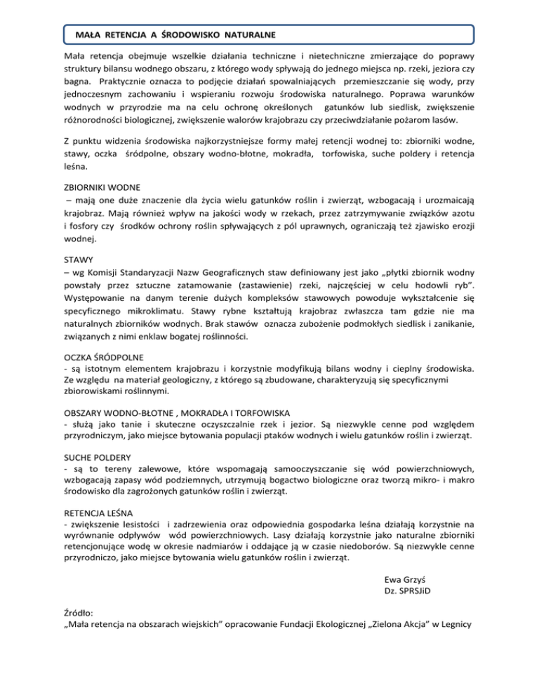 MAŁA RETENCJA A ŚRODOWISKO NATURALNE Mała retencja