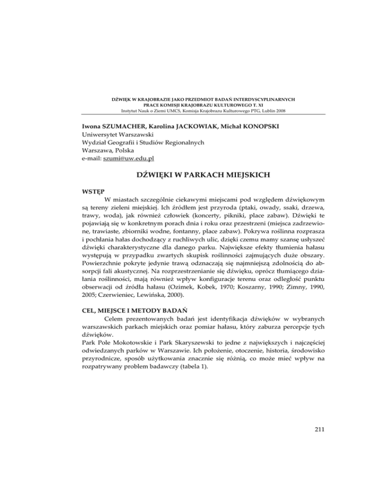 DŹWIĘK W KRAJOBRAZIE JAKO PRZEDMIOT BADAŃ INTERDYSCYPLINARNYCH PRACE KOMISJI KRAJOBRAZU KULTUROWEGO T. XI Instytut Nauk o Ziemi UMCS, Komisja Krajobrazu Kulturowego PTG, Lublin 2008 Iwona SZUMACHER, Karolina JACKOWIAK, Michał KONOPSKI Uniwersytet Warszawski Wydział Geografii i Studiów Regionalnych Warszawa, Polska e-mail: [email protected] DŹWIĘKI W PARKACH MIEJSKICH WSTĘP W miastach szczególnie ciekawymi miejscami pod względem dźwiękowym są tereny zieleni miejskiej. Ich źródłem jest przyroda (ptaki, owady, ssaki, drzewa, trawy, woda), jak również człowiek (koncerty, pikniki, place zabaw). Dźwięki te pojawiają się w konkretnym porach dnia i roku oraz przestrzeni (miejsca zadrzewione, trawiaste, zbiorniki wodne, fontanny, place zabaw). Pokrywa roślinna rozprasza i pochłania hałas dochodzący z ruchliwych ulic, dzięki czemu mamy szansę usłyszeć dźwięki charakterystyczne dla danego parku. Największe efekty tłumienia hałasu występują w przypadku zwartych skupisk roślinności zajmujących duże obszary. Powierzchnie pokryte jedynie trawą odznaczają się najmniejszą zdolnością do absorpcji fali akustycznej. Na rozprzestrzenianie się dźwięku, oprócz tłumiącego działania roślinności, mają również wpływ konfiguracje terenu oraz odległość punktu obserwacji od źródła hałasu (Ozimek, Kobek, 1970; Koszarny, 1990; Zimny, 1990, 2005; Czerwieniec, Lewińska, 2000). CEL, MIEJSCE I METODY BADAŃ Celem prezentowanych badań jest identyfikacja dźwięków w wybranych warszawskich parkach miejskich oraz pomiar hałasu, który zaburza percepcje tych dźwięków. Park Pole Mokotowskie i Park Skaryszewski to jedne z największych i najczęściej odwiedzanych parków w Warszawie. Ich położenie, otoczenie, historia, środowisko przyrodnicze, sposób użytkowania znacznie się różnią, co może mieć wpływ na rozpatrywany problem badawczy (tabela 1). 211 Tab. 1. Charakterystyka parków Tab. 1. Park’s characteristic Pole Mokotowskie Powierzchnia 60 ha Położenie Lewobrzeżna Warszawa, na pograniczu dzielnic Śródmieście, Ochota, Mokotów; Równina Warszawska. Otoczenie Ul. Żwirki i Wigury (W), Al. Niepodległości (E), Biblioteka Narodowa i Stadion Gromada (N), ogródki działkowe i luźna zabudowa (S). Historia Od 1818 r. Mokotowskie Pola Wojenne (300 ha), a potem ogrody publiczne i pole wyścigowe. Od 1910 lotnisko wojskowe, a w latach 1921-1933 cywilny port lotniczy. Po wojnie część terenu stopniowo zabudowywany gmachami m.in. WSH, SGGW, GUS, Biblioteki Narodowej. Sposób użytkowania Rodzaj zieleni Fauna Imprezy plenerowe (Dzień Ziemi, koncerty, Sprzątanie Świata, Warsztaty Animacyjne); jogging, jazda na rowerze, spacery; puby, restauracje. Duże powierzchnie trawiaste z pojedynczymi drzewami (39 ha), w tym trawniki odporne na wydeptywanie (w części wschodniej), zwarte zadrzewienie z przewagą lipy, grabu, kasztanowca, klonu, topoli, klomby kwiatowe. Wiewiórka pospolita, 40 gatunków ptaków lęgowych (m. in. wróbel, słowik szary, bażant, dzięcioł duży, świstunka, gajówka). Park Skaryszewski 58 ha Prawobrzeżna Warszawa, na pograniczu dzielnic Grochowa i Saskiej Kępy; dolina Wisły. Ul. Zieleniecka (W), ul. Międzynarodowa (E), al. J. Waszyngtona (S), Fabryka Wedel i osiedle mieszkalne (N). Od XVII do XIX w. łąki okresowo zalewane. Do początku XX w. Miejskie Pastwisko Skaryszewskie. Od 1905 r. realizacja założenia parkowego wg projektu F. Szaniora. Wybudowano również obiekty sportowe (boisko gimnastyczne, korty tenisowe, pływalnie na Jeziorku Kamionkowskim). W czasie II wojny światowej park uległ całkowitemu zniszczeniu na skutek prowadzonych na jego terenie walk. W 1977 wpisany w rejestr zabytków jako park krajobrazowy. Głównie spacery, czasami imprezy sportowe (biegi, łucznictwo), inscenizacje wydarzeń historycznych. 50 % powierzchni grupy drzew i krzewów o różnorodnym składzie gatunkowym (280 gat.). Dominuje lipa, jesion, klon, grab, dąb, wiąz, topola, platan. Ponadto trawniki i klomby kwiatowe. 11 ha to wodne stawy i Jezioro Kamionkowskie. Wiewiórki, tchórze, jeże, 49 gat. ptaków lęgowych, w tym: kaczka krzyżówka, sikora modra, gołąb, zięba, słowik szary. W jeziorze wiele gat. ryb (płoć, leszcz, lina). Badania składały się z dwóch etapów. Pierwszy etap polegał na zmierzeniu natężenia hałasu – jako czynnika zakłócającego. Natężenie hałasu zostało pomierzone w dwóch sezonach – w okresie wegetacji roślin (październik) i po opadnięciu liści z drzew (listopad) w 20 miejscach w Parku Skaryszewskim i 29 miejscach w zachodniej części parku Pole Mokotowskie. Pomiary zostały wykonane decybelomierzem 212 elektrycznym (analogowym) z dokładnością do pełnej jednostki. Zmierzone wartości poziomu dźwięku A wyrażone są w dB. Pomiary wykonane zostały w różnych częściach parków oraz poza ich granicami przy głównych trasach komunikacyjnych. Aby wyniki pomiarów z dwóch terminów mogły być porównywalne musiały być zachowane podobne warunki. W obu wyznaczonych terminach pomiar odbywał się o tej samej porze dnia, o godzinie 9:00 rano, przy pogodzie słonecznej. Uzyskane wyniki pomiarów były podstawą do wykonania mapy poziomu dźwięku na terenie Parku Skaryszewskiego i Pola Mokotowskiego (Jackowiak, 2007; Konopski, 2007). Drugi etap badań polegał na zarejestrowaniu i klasyfikacji dźwięków w badanych parkach w miejscach, gdzie brak zakłócającego szumu dochodzącego z otaczających ulic. WYNIKI BADAŃ Wyniki pomiarów poziomu dźwięku przeprowadzonych na terenie parków potwierdzają fakt, że zwarte obszary zieleni są skuteczną barierą dla rozprzestrzeniającego się hałasu. W Parku Skaryszewskim, w punktach znajdujących się przy głównych trasach komunikacyjnych poziom dźwięku zarówno w pierwszym, jak i drugim terminie pomiarowym był zbliżony i wynosił średnio 75 dB(A). Najbardziej komfortowe warunki dla przebywających w park
