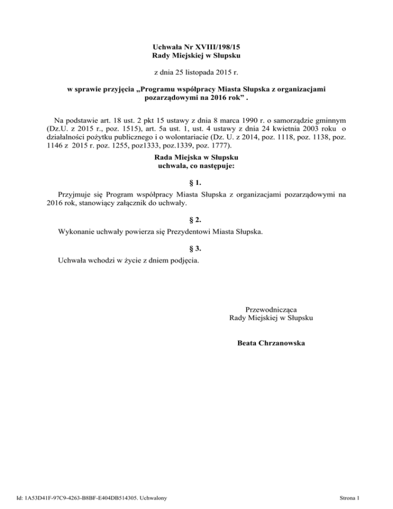 Uchwała Nr XVIII/198/15 Rady Miejskiej w Słupsku z dnia 25 listopada 2015 r. w sprawie przyjęcia „Programu współpracy Miasta Słupska z organizacjami pozarządowymi na 2016 rok” . Na podstawie art. 18 ust. 2 pkt 15 ustawy z dnia 8 marca 1990 r. o samorządzie gminnym (Dz.U. z 2015 r., poz. 1515), art. 5a ust. 1, ust. 4 ustawy z dnia 24 kwietnia 2003 roku o działalności pożytku publicznego i o wolontariacie (Dz. U. z 2014, poz. 1118, poz. 1138, poz. 1146 z 2015 r. poz. 1255, poz1333, poz.1339, poz. 1777). Rada Miejska w Słupsku uchwala, co następuje: § 1. Przyjmuje się Program współpracy Miasta Słupska z organizacjami pozarządowymi na 2016 rok, stanowiący załącznik do uchwały. § 2. Wykonanie uchwały powierza się Prezydentowi Miasta Słupska. § 3. Uchwała wchodzi w życie z dniem podjęcia. Przewodnicząca Rady Miejskiej w Słupsku Beata Chrzanowska Id: 1A53D41F-97C9-4263-B8BF-E404DB514305. Uchwalony Strona 1 Załącznik do Uchwały Nr XVIII/198/15 Rady Miejskiej w Słupsku z dnia 25 listopada 2015 r. PROGRAM WSPÓŁPRACY MIASTA SŁUPSKA Z ORGANIZACJAMI POZARZĄDOWYMI NA 2016 ROK WSTĘP Program współpracy Miasta Słupska z organizacjami pozarządowymi oraz innymi podmiotami prowadzącymi działalność pożytku publicznego został opracowany na podstawie ustawy z dnia 24 kwietnia 2003 r. o działalności pożytku publicznego i o wolontariacie w celu określenia zakresu współdziałania. Za celowe uznaje się coroczne wskazywanie wybranych obszarów i priorytetowych grup zadań po to, aby na ich realizację kierować środki finansowe. Głównymi kryteriami selekcji tych grup są - z jednej strony potrzeby mieszkańców Słupska, zaś z drugiej strony potencjał organizacji pozarządowych. Współpraca samorządu Miasta Słupsk z organizacjami pozarządowymi realizowana na podstawie corocznego Programu współpracy to trwałe wkomponowanie organizacji pozarządowych w strukturę działań samorządu i przykład dobrej praktyki współpracy, polegającej nie tylko na przekazywaniu przez samorząd środków finansowych, lecz przede wszystkim na partnerskiej wymianie doświadczeń i dążeniu do rozwoju Słupska. „Program współpracy Miasta Słupska z organizacjami pozarządowymi na 2016 rok” zwany w dalszej części Programem - jest podstawowym dokumentem określającym zasady współpracy pomiędzy Miastem Słupsk, a działającymi na jego terenie organizacjami pozarządowymi, a także wyznaczającym priorytetowe zadania publiczne, których realizacja związana będzie z udzieleniem pomocy publicznej. Rozdział 1. POSTANOWIENIA OGÓLNE § 1. Program określa: 1) cel główny i cele szczegółowe programu; 2) zasady współpracy; 3) zakres przedmiotowy; 4) formy współpracy; 5) priorytetowe zadania publiczne; 6) okres realizacji programu; 7) wysokość środków przeznaczonych na realizację programu; 8) sposób oceny realizacji programu; 9) informacja o sposobie tworzenia programu oraz o przebiegu konsultacji; Id: 3237D515-47E7-4EE8-9366-C15FA0D5AC8C. Uchwalony Strona 1 10) tryb powoływania i zasady działania komisji konkursowych do opiniowania ofert w otwartych konkursach ofert. § 2. Ilekroć w programie jest mowa o: 1) ustawie – należy przez to rozumieć ustawę z dnia 24 kwietnia 2003 r. o działalności pożytku publicznego i o wolontariacie (Dz.U. 2014 poz. 1118 z późn. zm.); 2) działalności pożytku publicznego – należy przez to rozumieć działalność społecznie użyteczną, prowadzoną przez organizacje pozarządowe w sferze zadań publicznych określonych w art. 4 ustawy; 3) Prezydencie – należy przez to rozumieć Prezydenta Miasta Słupska; 4) Radzie Miejskiej – należy rozumieć Radę Miejską w Słupsku; 5) Mieście – należy przez to rozumieć Miasto Słupsk; 6) organizacjach – należy przez to rozumieć organizacje, i jednostki organizacyjne, o których mowa w art. 3 ust. 2 ustawy; osoby prawne 7) dotacji – rozumie się przez to dotacje w rozumieniu art. 127 ust. 1 pkt. 1 lit. e ustawy z dnia 27 sierpnia 2009 r. o finansach publicznych (Dz. U. z 2013 r. poz. 885, z późn. zm.) 8) Programie – należy przez to rozumieć niniejszy Program; 9) Komisjach Konkursowych – należy przez to rozumieć komisje opiniujące oferty o udzielenie dotacji na realizację zadań publicznych miasta; 10) konkursie ofert – rozumie się przez to otwarty konkurs na realizację zadań publicznych, o których mowa w art. 11 ust. 2 ustawy z dnia 24 kwietnia 2003 r. o działalności pożytku publicznego i o wolontariacie; 11) małych grantach – rozumie się przez to zlecanie organizacji na podstawie oferty realizacji zadań publicznych o charakterze lokalnym z pominięciem otwartego konkursu ofert, zgodnie z art. 19a ustawy z dnia 24 kwietnia 2003 r. o działalności pożytku publicznego i o wolontariacie (Dz. U. z 2014, poz. 1118 ze zm.); 12) mieszkańcach – rozumie się przez to mieszkańców i mieszkanki Słupska; 13) Słupskiej Radzie Pożytku – rozumie się przez to Słupską Radę Pożytku Publicznego powołaną i funkcjonującą na podstawie uchwały Rady Miejskiej w Słupsku Nr XII/100/15 z dnia 27 maja 2015 r. 14) Radzie Organizacji Pozarządowych – należy przez to rozumieć gremium wyłonione przez konferencję słupskich organizacji pozarządowych i będące ich reprezentantem. 15) SCOPiES – należy przez to rozumieć Słupskie Centrum Organizacji Pozarządowych i Ekonomii Społecznej. § 3. 1. Przedmiotem Programu jest realizacja części zadań publicznych o charakterze lokalnym, realizowana przez Miasto Słupsk, nie zastrzeżona ustawami na rzecz innych organów administracji. Id: 3237D515-47E7-4EE8-9366-C15FA0D5AC8C. Uchwalony Strona 2 2. Przedmiotem współpracy Miasta Słupsk z podmiotami prowadzącymi działalność pożytku publicznego jest: realizacja zadań Miasta określonych w ustawie, podwyższanie efektywności działań kierowanych do mieszkańców miasta Słupska, tworzenie systemowych rozwiązań w