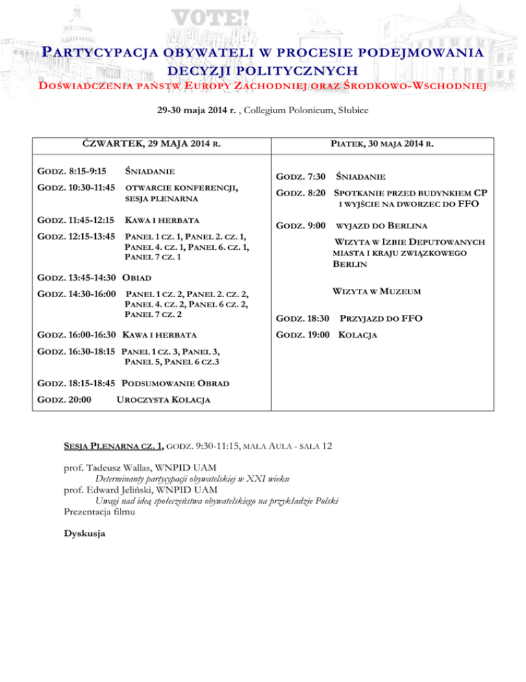 P ARTYCYPACJA OBYWATELI W PROCESIE PODEJMOWANIA DECYZJI POLITYCZNYCH D OŚWIADCZENIA PAŃSTW E UROPY Z ACHODNIEJ ORAZ Ś RODKOWO -W SCHODNIEJ 29-30 maja 2014 r. , Collegium Polonicum, Słubice ĆZWARTEK, 29 MAJA 2014 R. GODZ. 8:15-9:15 ŚNIADANIE GODZ. 10:30-11:45 OTWARCIE KONFERENCJI, SESJA PLENARNA GODZ. 11:45-12:15 KAWA I HERBATA PIATEK, 30 MAJA 2014 R. GODZ. 7:30 ŚNIADANIE GODZ. 8:20 SPOTKANIE PRZED BUDYNKIEM CP I WYJŚCIE NA DWORZEC DO FFO GODZ. 9:00 GODZ. 12:15-13:45 PANEL 1 CZ. 1, PANEL 2. CZ. 1, WYJAZD DO BERLINA WIZYTA W IZBIE DEPUTOWANYCH PANEL 4. CZ. 1, PANEL 6. CZ. 1, PANEL 7 CZ. 1 MIASTA I KRAJU ZWIĄZKOWEGO BERLIN GODZ. 13:45-14:30 OBIAD GODZ. 14:30-16:00 PANEL 1 CZ. 2, PANEL 2. CZ. 2, WIZYTA W MUZEUM PANEL 4. CZ. 2, PANEL 6 CZ. 2, PANEL 7 CZ. 2 GODZ. 18:30 PRZYJAZD DO FFO GODZ. 16:00-16:30 KAWA I HERBATA GODZ. 19:00 KOLACJA GODZ. 16:30-18:15 PANEL 1 CZ. 3, PANEL 3, PANEL 5, PANEL 6 CZ.3 GODZ. 18:15-18:45 PODSUMOWANIE OBRAD GODZ. 20:00 UROCZYSTA KOLACJA SESJA PLENARNA CZ. 1, GODZ. 9:30-11:15, MAŁA AULA - SALA 12 prof. Tadeusz Wallas, WNPID UAM Determinanty partycypacji obywatelskiej w XXI wieku prof. Edward Jeliński, WNPID UAM Uwagi nad ideą społeczeństwa obywatelskiego na przykładzie Polski Prezentacja filmu Dyskusja Panel 1. cz. 1 Partycypacja na poziomie lokalnym, GODZ. 12:15-13:45, SALA 15 dr Mirosław Natanek, Uniwersytet Jagielloński Gotowość do aktywności politycznej i społecznej na poziomie gminy w kontekście zaufania obywateli do działań samorządu terytorialnego w Polsce dr Jacek Pokładecki, WNPiD UAM Rola organów konsultacyjnych jako instrument partycypacji obywatelskiej w samorządzie lokalnym w Polsce mgr Jarosław Kola, WNPiD UAM Fasadowość partycypacji społecznej w polskim systemie prawnym w kontekście praktyki funkcjonowania form uczestnictwa obywateli w kształtowaniu polityki finansowej organów władzy publicznej mgr Patrycja Ścibor-Jońska, Uniwersytet Wrocławski Inicjatywa lokalna i budżet partycypacyjny jako formy partycypacji społeczności lokalnych Dyskusja Panel 1. cz. 2 Partycypacja na poziomie lokalnym, GODZ. 14:30-16:00, SALA 15 dr Marcin Rachwał, WNPiD UAM Budżet partycypacyjny na przykładzie Poznania dr Aneta Krzewińska, Uniwersytet Łódzki Od konsultacji do partycypacji - łódzki budżet miasta dr Katarzyna Walkowiak, Wyższa Szkoła Bankowa, Poznań Fundusz sołecki jako forma budżetu partycypacyjnego dr Paweł Antkowiak, WNPiD UAM Od partycypacji do manipulacji – rzecz o budżetach obywatelskich na poziomie lokalnym w Polsce Dyskusja Panel 1. cz. 3 Partycypacja na poziomie lokalnym, GODZ. 16:30-18:15, SALA 15 prof. Robert Kmieciak, WNPiD UAM Partycypacja środowiska przedsiębiorców w procesie podejmowania decyzji na poziomie lokalnym dr Maciej Drzonek, Uniwersytet Szczeciński Rywalizacyjność w wyborach prezydenta miasta a partycypacja wyborcza. Wybrane przypadki lat 2002-2010 dr Maciej Magiera, WNPiD UAM Straż miejska i gminna w obliczu demokracji partycypacyjnej dr Ryszard Bodziacki, WNPiD UAM Rola organizacji pozarządowych w kształtowaniu demokracji na poziomie lokalnym Dyskusja Panel 2. cz. 1. Udział obywateli w procedurach demokracji bezpośredniej, GODZ. 12:15-13:45, SALA 16 prof. Marek Żyromski Demokracja bezpośrednia i partycypacja polityczna - rzeczywistość czy mit? mgr Krzysztof Duda, WNPiD UAM Landsgemeinde w szwajcarskich kantonach – stan aktualny i perspektywy funkcjonowania mgr Ewa Kapuścińska-Książek,Uniwersytet Opolski Volksabstimmung jako forma demokracji bezpośredniej zagrażająca podejmowaniu decyzji politycznych w Szwajcarii Dyskusja Panel 2. cz. 2. Udział obywateli w procedurach demokracji bezpośredniej , GODZ. 14:30-16:00, SALA 16 dr hab. Anita Adamczyk, WNPiD UAM Obywatelskie inicjatywy w kwestiach moralnych i społecznych dr Krzysztof Urbaniak, UAM Referendum w brytyjskiej praktyce konstytucyjnej dr Małgorzata Podolak, WNPiD UAM Referenda w Europie Środkowej i Wschodnie – bilans 25 lat (1989-2014) Dyskusja Panel 3. Demokracja i partycypacja obywateli – wymiary zmian, GODZ. 16:30-18:15, SALA 16 dr Remigiusz Rosicki, WNPiD UAM Democratia – deus ex machina dr Marcin Tobiasz, Uniwersytet Warszawski Od agregacji do deliberacji. Uczestnictwo polityczne w teorii i praktyce demokracji deliberatywnej dr Maciej Potz, Uniwersytet Łódzki Ograniczenia koncepcji demokracji asocjacyjnej dr Marcin Piechocki, WNPiD UAM Koncepcja płynnej demokracji w programie Partii Piratów Dyskusja Panel 4.cz 1. Formy partycypacji obywateli w państwach europejskich, GODZ. 12:15-13:45, SALA 17 prof. Wojciech Nowiak, WNPiD UAM Nowe grupy interesów w tradycyjnych systemach politycznych. Wnioski z doświadczeń Państw Nordyckich dr Małgorzata Mieczkowska, Uniwersytet Szczeciński, Partycypacja polityczna mniejszości narodowych w Europie w komparatywnej perspektywie mgr Marcin Łukaszewski, WNPiD UAM Geneza i specyfika partii politycznych demokratycznych mikropaństw europejskich wobec doświadczeń środkowoeuropejskich mgr Ewa Kaja, WNPiD UAM Metody wykorzystania założeń demokracji deliberatywnej w praktyce politycznej Dyskusja Panel 4.cz 2. Formy partycypacji obywateli w państwach europejskich, GODZ. 14:30-16:00, SALA 17 dr Izabela Kapsa, UKW, Budgoszcz Partycypacja Brytyjczyków w procesie decydowania politycznego lic. Natalia Kusa, WNPiD UAM Uliczna partycypacja. Próba analizy aktywności społeczeństwa rosyjskiego w ramach protestów po wyborach do Dumy Państwowej w grudniu 2011 roku mgr Swietłana Bałtromiuk Czynnik regionalny w wyborach prezydenckich na Ukrainie Dyskusja Panel 5. Partycypacja obywatelska w Polsce, GODZ. 16:30-18:15, SALA 17 dr Szymon Ossowski, WNPiD UAM Partycypacja obywateli i jakość demokracji. Polska na tle innych państw europejskich dr Agnieszka Bejma, Uniwersytet Warszawski Formy partycypacji obywatelskiej Polaków dr Cezary Trosiak, WNPiD UAM Partycypacja w życiu politycznym jako wskaźnik patriotyzmu w świetle wyników badań dr Bogdan Naw