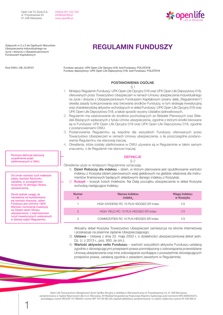 Open Life TU Życie S.A. ul. Przyokopowa 33 01-208 Warszawa infolinia 801 222 333 [email protected] www.openlife.pl REGULAMIN FUNDUSZY Załącznik nr 2 z 2 do Ogólnych Warunków Ubezpieczenia indywidualnego na życie i dożycie z Ubezpieczeniowym Funduszem Kapitałowym Kod OWU: UB_OLIR101 Fundusz opcyjny: UFK Open Life Opcyjny 018, kod Funduszu: FOLOC018 Fundusz depozytowy: UFK Open Life Depozytowy 018, kod Funduszu: FOLDT018 1. 2. 3. 4. Poniższe definicje stanowią uzupełnienie pojęć zdefiniowanych w OWU. Od zmian wartości tych indeksów zależy wartość Rachunku udziałów, w szczególności na koniec 15-letniego Okresu ubezpieczenia. Zwróć jednak uwagę, że niezależnie od kształtowania się wartości Koszyka, celem Funduszu jest ochrona 130% Wartości nominalnej inwestycji na Ostatni dzień Okresu ubezpieczenia, z zastrzeżeniem ryzyk inwestycyjnych wskazanych w dalszej części Regulaminu. POSTANOWIENIA OGÓLNE § 1 Niniejszy Regulamin Funduszy: UFK Open Life Opcyjny 018 oraz UFK Open Life Depozytowy 018, oferowanych przez Towarzystwo Ubezpieczeń w ramach Umowy ubezpieczenia indywidualnego na życie i dożycie z Ubezpieczeniowym Funduszem Kapitałowym (zwany dalej „Regulaminem”) określa zasady funkcjonowania oraz lokowania środków Funduszy, w tym strategię inwestycyjną oraz charakterystykę aktywów wchodzących w skład Funduszy: UFK Open Life Opcyjny 018 oraz UFK Open Life Depozytowy 018, a także sposób wyceny Udziałów jednostkowych. Regulamin ma zastosowanie do środków pochodzących ze Składek Pierwszych oraz Składek Bieżących wpłacanych z tytułu Umów ubezpieczenia, zgodnie z którymi środki lokowane są w Fundusze: UFK Open Life Opcyjny 018 oraz UFK Open Life Depozytowy 018, zgodnie z postanowieniami OWU. Postanowienia Regulaminu są wspólne dla wszystkich Funduszy oferowanych przez Towarzystwo Ubezpieczeń w ramach Umowy ubezpieczenia, o ile poszczególne postanowienia Regulaminu nie stanowią inaczej. Określenia, które zostały zdefiniowane w OWU używane są w Regulaminie w takim samym znaczeniu, o ile Regulamin nie stanowi inaczej. DEFINICJE § 2 Określenia użyte w niniejszym Regulaminie oznaczają: 1) Dzień Roboczy dla indeksu – dzień, w którym planowane jest opublikowanie wartości indeksu z Koszyka (dzień planowanych sesji giełdowych na giełdzie właściwej dla instrumentów finansowych będących składowymi danego indeksu z Koszyka); 2) Koszyk – koszyk trzech Indeksów. Na Datę początku ubezpieczenia w skład Koszyka wchodzą następujące Indeksy: Numer k Nazwa indeksu indeksk Waga indeksu w Koszyku 1 HIGH DIVIDEND RC 10 PLN HEDGED ER Index 1/3 2 HIGH YIELD RC 10 PLN HEDGED ER Index 1/3 3 COMMODITIES RC 10 PLN HEDGED ER Index 1/3 Aktualny skład Koszyka Towarzystwo Ubezpieczeń zamieszcza na stronie internetowej i przekazuje na pisemne żądanie Ubezpieczającego; 3) Ustawa – Ustawę z dnia 22. maja 2003 r. o działalności ubezpieczeniowej (tekst jedn. Dz. U. z 2013 r., poz. 950. ze zm.); 4) Wartość aktywów netto Funduszu – wartość wszystkich aktywów Funduszu ustalaną zgodnie z obowiązującymi przepisami prawa pomniejszoną o zobowiązania przewidziane Umową ubezpieczenia oraz inne zobowiązania wynikające z powszechnie obowiązujących przepisów prawa, ustalaną zgodnie z zasadami zawartymi w Regulaminie; 1 Open Life Towarzystwo Ubezpieczeń Życie Spółka Akcyjna z siedzibą w Warszawie przy ul. Przyokopowej 33, 01-208 Warszawa, zarejestrowana w Sądzie Rejonowym dla m.st. Warszawy, XII Wydział Gospodarczy Krajowego Rejestru Sądowego pod numerem KRS 0000292551, posiadająca numer REGON 141186640 i numer NIP 107-00-08-220, kapitał zakładowy zarejestrowany i w całości wpłacony wynosi 95 500 000 zł. Open Life TU Życie S.A. ul. Przyokopowa 33 01-208 Warszawa infolinia 801 222 333 [email protected] www.openlife.pl 5) Wartość udziału jednostkowego – wartość aktywów netto danego Funduszu podzieloną przez liczbę Udziałów jednostkowych zgromadzonych w danym Funduszu, obliczana zgodnie z poniższym wzorem: WUJT = WANT LUJT -1 gdzie: WUJT – Wartość udziału jednostkowego na Dzień wyceny (T), WANT – Wartość aktywów netto Funduszu na Dzień wyceny (T), LUJT-1 – liczba wszystkich Udziałów jednostkowych na dzień (T-1). Wartość udziału jednostkowego na dany Dzień wyceny ustalana jest w najbliższym Dniu roboczym następującym po tym Dniu wyceny. Jeżeli ustalenie Wartości udziału jednostkowego w najbliższym Dniu roboczym nie jest możliwe, Towarzystwo Ubezpieczeń dokona ustalenia Wartość udziału jednostkowego nie później niż w 12. Dniu roboczym następującym po Dniu wyceny; 6) Wystawca – Bank inwestycyjny, od którego Towarzystwo Ubezpieczeń nabywa instrument pochodny, o ratingu minimum inwestycyjnym na dzień zakupu. Towarzystwo Ubezpieczeń zamieszcza na stronie internetowej nazwę Wystawcy instrumentu pochodnego i przekazuje ją na pisemne żądanie Ubezpieczającego. STRATEGIA INWESTYCYJNA I CHARAKTERYSTYKA AKTYWÓW FUNDUSZU OPCYJNEGO § 3 1. Fundusz opcyjny powstaje z alokowanej Składki Pierwszej. 2. Celem Funduszu opcyjnego jest powiększanie Wartości aktywów netto Funduszu w wyniku wzrostu wartości lokat Funduszu. 3. Celem Funduszu opcyjnego na Ostatni dzień Okresu ubezpieczenia jest osiągniecie Wartości aktywów netto Funduszu określonej zgodnie z poniższym wzorem. Cel ten jest realizowany przez zakup instrumentu pochodnego, o którym mowa w ust. 4 - 5. Cel ten realizowany jest z zastrzeżeniem ryzyk, o których mowa w § 6. KWIP = WNI X MAX (0; Koszykkońcowy Koszykpoczątkowy - 130%) gdzie: KWIP – końcowa wartość instrumentu pochodnego (profil wypłaty instrumentu), będąca równocześnie celem Funduszu opcyjnego, WNI – wartość nominalna instrumentu pochodnego odpowiadająca Wartości nominalnej inwestycji, Koszykpoczątkowy – początkowa wartość Koszyka wyznaczana jako najniższa z wartości Koszyka w datach obserwacji t(i) dla
