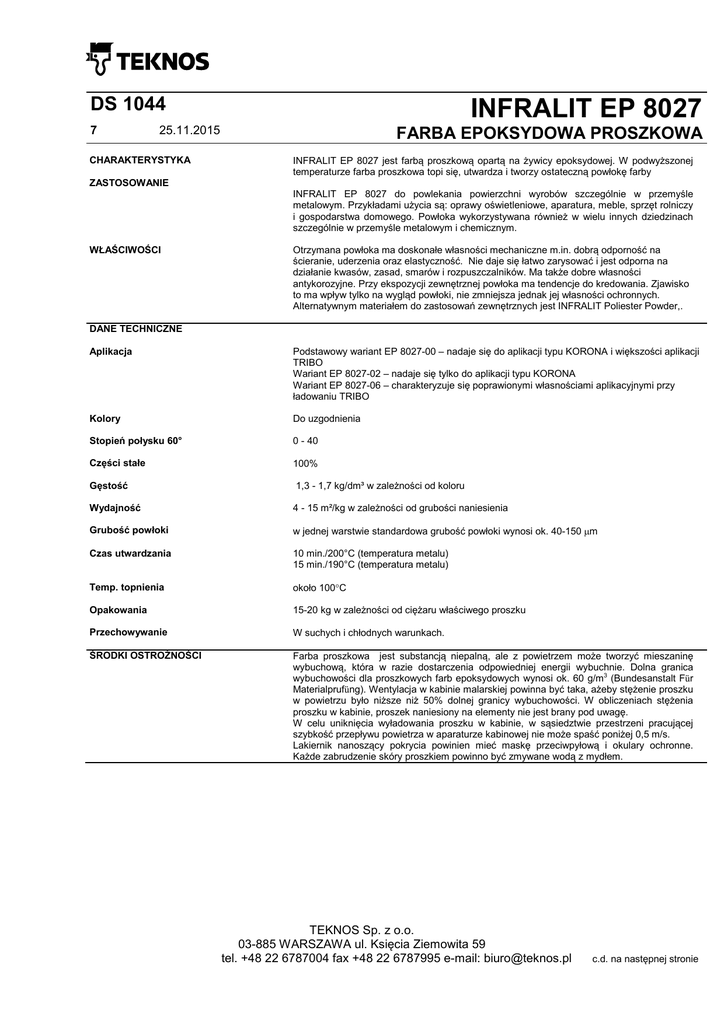 DS 1044 7 INFRALIT EP 8027 25.11.2015 CHARAKTERYSTYKA FARBA EPOKSYDOWA PROSZKOWA INFRALIT EP 8027 jest farbą proszkową opartą na żywicy epoksydowej. W podwyższonej temperaturze farba proszkowa topi się, utwardza i tworzy ostateczną powłokę farby ZASTOSOWANIE INFRALIT EP 8027 do powlekania powierzchni wyrobów szczególnie w przemyśle metalowym. Przykładami użycia są: oprawy oświetleniowe, aparatura, meble, sprzęt rolniczy i gospodarstwa domowego. Powłoka wykorzystywana również w wielu innych dziedzinach szczególnie w przemyśle metalowym i chemicznym. WŁAŚCIWOŚCI Otrzymana powłoka ma doskonałe własności mechaniczne m.in. dobrą odporność na ścieranie, uderzenia oraz elastyczność. Nie daje się łatwo zarysować i jest odporna na działanie kwasów, zasad, smarów i rozpuszczalników. Ma także dobre własności antykorozyjne. Przy ekspozycji zewnętrznej powłoka ma tendencje do kredowania. Zjawisko to ma wpływ tylko na wygląd powłoki, nie zmniejsza jednak jej własności ochronnych. Alternatywnym materiałem do zastosowań zewnętrznych jest INFRALIT Poliester Powder,. DANE TECHNICZNE Aplikacja Podstawowy wariant EP 8027-00 – nadaje się do aplikacji typu KORONA i większości aplikacji TRIBO Wariant EP 8027-02 – nadaje się tylko do aplikacji typu KORONA Wariant EP 8027-06 – charakteryzuje się poprawionymi własnościami aplikacyjnymi przy ładowaniu TRIBO Kolory Do uzgodnienia Stopień połysku 60° 0 - 40 Części stałe 100% Gęstość 1,3 - 1,7 kg/dm³ w zależności od koloru Wydajność 4 - 15 m²/kg w zależności od grubości naniesienia Grubość powłoki w jednej warstwie standardowa grubość powłoki wynosi ok. 40-150 µm Czas utwardzania 10 min./200°C (temperatura metalu) 15 min./190°C (temperatura metalu) Temp. topnienia około 100°C Opakowania 15-20 kg w zależności od ciężaru właściwego proszku Przechowywanie W suchych i chłodnych warunkach. ŚRODKI OSTROŻNOŚCI Farba proszkowa jest substancją niepalną, ale z powietrzem może tworzyć mieszaninę wybuchową, która w razie dostarczenia odpowiedniej energii wybuchnie. Dolna granica wybuchowości dla proszkowych farb epoksydowych wynosi ok. 60 g/m3 (Bundesanstalt Für Materialprufüng). Wentylacja w kabinie malarskiej powinna być taka, ażeby stężenie proszku w powietrzu było niższe niż 50% dolnej granicy wybuchowości. W obliczeniach stężenia proszku w kabinie, proszek naniesiony na elementy nie jest brany pod uwagę. W celu uniknięcia wyładowania proszku w kabinie, w sąsiedztwie przestrzeni pracującej szybkość przepływu powietrza w aparaturze kabinowej nie może spaść poniżej 0,5 m/s. Lakiernik nanoszący pokrycia powinien mieć maskę przeciwpyłową i okulary ochronne. Każde zabrudzenie skóry proszkiem powinno być zmywane wodą z mydłem. TEKNOS Sp. z o.o. 03-885 WARSZAWA ul. Księcia Ziemowita 59 tel. +48 22 6787004 fax +48 22 6787995 e-mail: [email protected] c.d. na następnej stronie INFRALIT EP 8027 DS 1044 - 7 strona 2 SPOSÓB STOSOWANIA Przygotowanie powierzchni Usunąć wszelkie zabrudzenia. Odtłuścić np. w oparach trójchloroetylenu lub kąpieli alkalicznej. Powierzchnie zardzewiałe oczyścić metodą obróbki strumieniowo-ściernej lub wytrawić i poddać fosforanowaniu. Profil powierzchni po obróbce strumieniowo-ściernej musi być przynajmniej średni (G). Patrz norma ISO 8503-2. Powierzchnie zimno-walcowane: Odtłuszczanie w oparach trichloroetylenu lub w kąpieli alkalicznej. Nanosić elektrostatycznie do grubości ok. 80-150µm. Powierzchnie aluminiowe: Odtłuścić np. w kąpieli alkalicznej. Powierzchnie atmosferycznych muszą być chromianowane. narażone na działanie czynników Powierzchnie cynkowane ogniowo lub galwanicznie: Usunąć wszelkie zanieczyszczenia i sole aluminium z malowanej powierzchni przy użyciu np. kąpieli alkalicznej. W zależności od warunków eksploatacji zalecane jest fosforanowanie lub chromianowanie. Powierzchnie walcowane na gorąco i odlewane: Usunąć tłuszcz i brud. Powierzchnie należy oczyścić strumieniowo do stopnia co najmniej Sa 21/2. Profil powierzchni minimum G (ISO 8503-2). Usunąć pył. Obróbka strumieniowo-ścierna jest zalecana również do przygotowania innego rodzaju podłoża takiego jak żeliwo, ponieważ zapewnia doskonałą przyczepność proszku epoksydowego. WŁASNOŚCI POWŁOKI Rezultaty podane poniżej odnoszą się do powłoki wykonanej na stali zimno-walcowanej i utwardzanej w czasie 10 min./200°C, o grubości 50µm. Własności fizyczne Elastyczność (Erichsen, ISO 1520) Odporność na uderzenia (SFS EN ISO 6272) -bezpośrednia -wsteczna Odporność na zginanie (SFS ISO 6860) Przyczepność (test nacięć krzyżowych, SFS EN ISO 2409) >7 mm >20 kgcm >20 kgcm < 5 mm GT 0 Informacje zawarte w karcie danych zostały stworzone w oparciu o badania laboratoryjne i praktyczne doświadczenia. Nie mając wpływu na warunki aplikacji jak również sposób postępowania możemy brać odpowiedzialność wyłącznie za jakość wyrobu i gwarantować, że odpowiada on naszym normom. Nie bierzemy również odpowiedzialności za straty lub uszkodzenia powstałe w wyniku nanoszenia wyrobów niezgodnie z zaleceniami lub z powodu niewłaściwego ich użycia. Produkt przeznaczony jest do użytku profesjonalnego. Oznacza to, że użytkownik posiada wystarczającą wiedzę do korzystania z produktu przestrzegając ściśle warunków technicznych i bezpieczeństwa pracy. Najnowsze wersje kart danych technicznych i charakterystyki znajdują się na stronie: www.teknos.com. TEKNOS Sp. z o.o. 03-885 WARSZAWA ul. Księcia Ziemowita 59 tel. +48 22 6787004 fax +48 22 6787995 e-mail: [email protected]