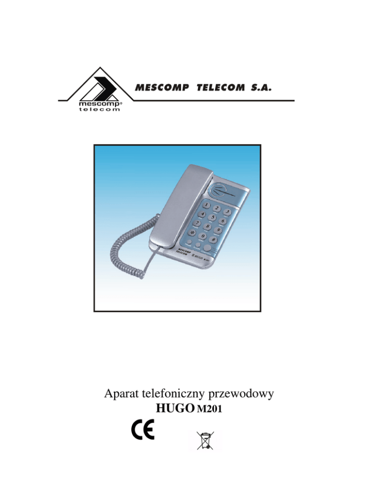 Aparat telefoniczny przewodowy HUGO M201 OPIS RYSUNKU: 1. Gniazdo linii telefonicznej. 2. Przełącznik głośności dzwonienia. 3. Przełącznik TONE/PULSE ( trybu wybierania numerów ). 4. Przełącznik główny aparatu. 5. Przycisk PAUZA. 6. Przycisk FLASH. 7. Przycisk POWTÓRZ. 8. Mikrotelefon ( słuchawka ). 9. Gniazda w aparacie i słuchawce do zamocowania przewodu słuchawkowego. 10. Optyczny wskaźnik dzwonienia. 11. Wieszaki umożliwiające umocowanie telefonu na ścianie. 1. Przeczytaj uważnie wszystkie wskazówki dla lepszego użycia produktu. 2. Nie używaj produktu w miejscach wilgotnych oraz w pobliżu wody. 3. Urządzenie należy ustawić z dala od źródeł ciepła: np. kaloryferów, kratek cieplnych, piecyków itp. 4. Poza przypadkami opisanymi w instrukcji – rozdział ROZWIĄZYWANIE PROSTYCH PROBLEMÓW - urządzenia nie należy samodzielnie naprawiać. W przypadku problemów z urządzeniem, usterką proszę zgłosić w serwisie Mescomp Telcom lub w serwisie autoryzowanym ( lista serwisów dostępna na stronie internetowej Mescomp Telcom ). Otwarcie lub próba rozkręcenia zewnętrznej obudowy urządzenia powoduje utratę gwarancji. INSTALACJA: UWAGA: Jeżeli linia telefoniczna jest linią napowietrzna wskazane jest zainstalowanie układu zabezpieczającego aparat przed przepięciami i przetężeniami. Gwarancja nie obejmuje uszkodzeń wynikłych np. z wyładowań atmosferycznych. 1. Połączyć przewodem słuchawkowym ( skręconym ) słuchawkę ( gniazdo [9] w dolnej części słuchawki ) - z aparatem ( gniazdo [9] od spodu aparatu ) Sprawdzić, czy wtyki zatrzasnęły się na gniazdach. 2. Przewód liniowy aparatu włożyć w gniazdo [1] umieszczone w górnej ściance aparatu, a drugi koniec zakończony właściwą wtyczką do gniazda telefonicznego. 3. Podnieść słuchawkę i sprawdzić, czy jest słyszalny sygnał zgłoszenia centrali. Przy wybieraniu trybu wybierania DTMF wybrać dowolną cyfrę. Jeżeli sygnał centrali nie zniknie, należy wybrać tryb PULSE i powtórzyć próbę. FUNKCJE PRZYCISKÓW I PRZEŁĄCZNIKÓW: RINGER [2] - przełącznik służący do ustalenia głośności dzwonka. HI - głośny LO - cichy TONE/PULSE [3] - przycisk służący do przejścia systemu pulsowego na tonowy ( w sytuacji, gdy telefon ustawiony jest w systemie pulsowym ). TONE/PULSE - przełącznik określający sposób wybierania numerów abonentów. P( pulse ) - wybieranie dekadowe. T( tone ) - wybieranie częstotliwościowe ( DTMF ), stosowane przy współpracy z centralami elektronicznymi oraz przy zdalnym dostępie do np. automatycznej sekretarki. PAUZA [5] - przycisk służący do programowania ( zapamiętywania przez aparat dostępu między wybieranymi cyframi numeru abonenta ). Przycisk jest stosowany, gdy wybieramy numer zamiejscowy i przewidujemy używanie przycisku POWTÓRZ. FLASH [6] - przyciski do generowania przerwy w linii ( tzw. przerwa kalibrowana ). POWTÓRZ [7] - przycisk służący do ponownego wybierania ostatnio wybieranego numeru: Po podniesieniu mikrotelefonu i usłyszeniu sygnału zgłoszenia centrali, nacisnąć przycisk POWTÓRZ, ostatnio wybrany numer zostanie ponownie wybrany. UWAGA: Jeżeli chcemy użyć funkcję POWTÓRZ przy połączeniu międzymiastowym należy: Wybrać cyfrę „0”przycisnąć przycisk PAUZA, a następnie wybrać numer kierunkowy abonenta. Po przyciśnięciu przycisku POWTÓRZ telefon wybierze cyfrę „0”, poczekaj na zgłoszenie centrali, a następnie wybierze kolejne cyfry. Jeżeli połączenie nie zostało zrealizowane należy: odłożyć słuchawkę, podnieść ją, ponownie wcisnąć przycisk POWTÓRZ. OPTYCZNY WSKAŹNIK DZWONIENIA[10] - wskaźnik świeci w momencie dzwonienia telefonu. Uwagi eksploatacyjne: Dla aparatu szkodliwa jest wilgoć i kurz. Aparat można czyścić jedynie wilgotną ściereczką. Do mycia nie należy używać benzyny, rozpuszczalników oraz proszków. ROZWIAZYWANIE PROSTYCH PROBLEMÓW Brak sygnału Sprawdź, czy słuchawka jest prawidłowo podłączona do telefonu, lub czy linia telefoniczna nie jest uszkodzona. Zakłócenia Sprawdź, czy wtyczka nie jest uszkodzona. Wymień wtyczkę na nową. Sprawdź, czy gniazdo nie jest wilgotne lub zardzewiałe. UWAGA: Producent MESCOMP TELECOM S.A. zastrzega sobie możliwość wprowadzenia zmian w osprzęcie i oprogramowaniu wynikające z postępu technicznego. Symbol CE oznacza, że niniejszy produkt spełnia europejskie wymagania w zakresie bezpieczeństwa, ochrony zdrowia, środowiska i konsumenta. Oznacza, że produkt został poddany odpowiedniej procedurze oceny zgodności i spełnia zasadnicze wymagania dyrektyw podanych w deklaracji zgodności Przedstawiony symbol ( przekreślony wizerunek kosza na kółkach zgodnie z dyrektywą WEEE ) skazuje na zalecenia obowiązujące w Unii Europejskiej dotyczące oddzielnego zbierania odpadów elektrycznych i sprzętu elektronicznego. Prosimy nie wrzucać niniejszego sprzętu do kosza razem z odpadami domowymi. Pozbywając się tego urządzenia skontaktuj się z lokalnymi władzami, służbami likwidacji odpadów, sklepem gdzie dokonano zakupu sprzętu lub z nasza firmą. Oddzielna zbiórka i prawidłowy odzysk zużytego sprzętu elektrycznego i elektronicznego podczas likwidacji pozwoli nam przyczynić się do oszczędzania zasobów naturalnych. Masa sprzętu: 0,32kg Kupon A karty gwarancyjnej Aparat telefoniczny GT-125 Data naprawy ............................................................. Rodzaj naprawy ............................................................. ............................................................. ............................................................. ............................................................. Zakład serwisowy Kupon B karty gwarancyjnej Aparat telefoniczny GT-125 Data naprawy ............................................................. Rodzaj naprawy ............................................................. ..................................