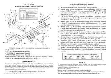 INSTRUKCJA MontaŜu i eksploatacji zaczepu kulowego Oznaczenie zacisku wg ISO PN 1 L 2 + 3 31 4 R 5 58R 6 54 7 58L 12 5 12 7 5 Kolejność czynności przy montaŜu Łączenie przewodów Kierunkowskazy lewe Tylne światła przeciwmgłowe Masa Kierunkowskazy prawe Światła pozycyjne prawe Światła hamowania Światła pozycyjne lewe 16 13 6 7 B D 4 9 C 1 8 14 11 A 10 6 22 16 13 14 8 3 2 Niniejszy zaczep kulowy przeznaczony jest do zamontowania w samochodach: • • • FIAT DUCATO (zabudowany-blaszak) PEUGEOT J5 (zabudowany-blaszak) CITROËN C25 (zabudowany-blaszak) produkowanych od 1984 do 04.1994 i słuŜy do ciągnięcia przyczep o masie całkowitej do 1500 kg i nacisku na kulę max 80 kg. OD PRODUCENTA Dziękujemy za wybór produkowanego przez naszą firmę zaczepu kulowego. Jego niezawodność została potwierdzona licznymi testami oraz opiniami zadowolonych klientów. JednakŜe niezawodność zaczepów kulowych jest zaleŜna równieŜ od prawidłowego montaŜu oraz prawidłowej eksploatacji. Z tego powodu prosimy Państwa o staranne przeczytanie niniejszej instrukcji montaŜu oraz przestrzeganie właściwych wskazówek. Zaczep kulowy naleŜy zamontować w miejscach do tego celu przeznaczonych przez producenta samochodu. 1. Do zamontowania haka nie jest konieczne zdjęcie zderzaka. 2. Skręcić belkę główną zaczepu (po. 1) ze wspornikiem (poz. 4) dwoma śrubami M12x70mm (poz. 11) z wyposaŜenia haka. UWAGA! W środek rury wspornika naleŜy włoŜyć tulejkę dystansową IV (poz. 9) jak pokazano na rysunku. 3. Tak złoŜony zespół przyłoŜyć do ramy samochodu i odznaczyć otwory zaczepu (poz. A, B, C i D), a następnie przewiercić poprzez ramę samochodu wiertłem ø11mm. 4. Otwory (poz. A i D) od wewnętrznej strony ramy rozwiercić wiertłem ø18mm. W rozwiercone otwory włoŜyć tulejki dystansowe I (L= 50mm, poz. 6) z wyposaŜenia zaczepu. 5. Otwory (poz. C i D) od strony części bagaŜowej rozwiercić wiertłem ø18mm, a następnie włoŜyć w te otwory tulejki dystansowe II (L = 82mm, poz. 7) oraz przyłoŜyć nakładki (poz. 5). 6. Powtórnie przyłoŜyć zaczep do ramy samochodu i poprzez otwory haka (poz. A i B) oraz włoŜone uprzednio w ramę tulejki skręcić śrubami M10x80mm (poz. 13) z wyposaŜenia. 7. Od części bagaŜowej poprzez nakładki (poz. 5), tulejki dystansowe II oraz otwory haka (poz. C i D) skręcić śrubami M10x110mm (poz. 12). 8. Przykręcić część kulistą zaczepu (poz. 2) wraz z blachą pod gniazdo, śrubami M12x75mm (poz. 10) oraz M12x70mm (poz. 11) z wyposaŜenia. 9. Dokręcić wszystkie śruby z momentem, jak pokazano w tabeli. 10. Podłączyć przewody z gniazdka 7 – bieg. do instalacji elektrycznej zgodnie z instrukcją fabryczną samochodu (zaleca się wykonanie w ASO). 11. Uzupełnić ewentualne ubytki powłoki malarskiej haka powstałe w trakcie montaŜu. Zalecany moment skręcający dla śrub i nakrętek 8,8: M6 - 11 Nm M8 - 25 Nm M10 - 50 Nm M12 - 87 Nm M14 - 138 Nm M16 - 210 Nm UWAGA Po zamontowaniu zaczepu kulowego naleŜy uzyskać wpis w dowodzie rejestracyjnym pojazdu na „stacji kontroli pojazdów” właściwej dla miejsca zamieszkania. Samochód powinien być wyposaŜony w: -kierunkowskazy boczne -lusterka boczne o rozstawie co najmniej szerokości przyczepy Sprawdzić śruby mocujące zaczepu kulowego po około 1 000 km przebiegu eksploatacji. Kula zaczepu musi być utrzymana w czystości i konserwowana smarem stałym. PPUH AUTO-HAK S.J. WyposaŜenie zaczepu kulowego: Produkcja Zaczepów Kulowych Henryk & Zbigniew Nejman 76-200 SŁUPSK ul. Słoneczna 16K tel./fax. (059) 8-414-414; 8-414-413 E-mail: [email protected] www. autohak.com.pl Zaczep kulowy bez wyposaŜenia elektrycznego R06 Klasa: A50-X Nr kat. Przeznaczony do zamontowania w samochodzie: FIAT DUCATO (zabudowany-blaszak) produkowanego od 1984 do 04.1994 PEUGEOT J5 (zabudowany-blaszak) produkowanego od 1984 do 04.1994 CITROËN C25 (zabudowany-blaszak) produkowanego od 1984 do 04.1994 Dane techniczne: wartość siły D: 11,8 kN maksymalna masa przyczepy: 1500 kg maksymalny nacisk na kulę: 80 kg Certyfikat zgodności nr : 5/09 KARTA GWARANCYJNA Producent udziela gwarancji niniejszą kartą gwarancyjną na okres 24 miesięcy licząc od dnia zakupu zaczepu kulowego do samochodów: FIAT DUCATO (zabudowany-blaszak) produkowanego od 1984 do 04.1994 PEUGEOT J5 (zabudowany-blaszak) produkowanego od 1984 do 04.1994 CITROËN C25 (zabudowany-blaszak) produkowanego od 1984 do 04.1994 Data produkcji .............................. Data zakupu............................................. Zakres gwarancji obejmuje wyłącznie wady jakościowe wynikające z winy producenta. Gwarancja nie obejmuje natomiast uszkodzeń zawinionych przez nabywcę, wynikających z niewłaściwego montaŜu, uŜytkowania lub konserwacji, uszkodzeń mechanicznych, normalnego zuŜycia podczas eksploatacji itp. Gwarancja udzielona na zakupiony towar nie wyłącza, nie ogranicza ani nie zawiesza uprawnień kupującego wynikających z niezgodności towaru z umową. Reklamacje naleŜy zgłaszać w punkcie sprzedaŜy, składając jednocześnie kartę gwarancyjną. Usunięcie "wady" następuje po stwierdzeniu przez punkt sprzedaŜy wspólnie z producentem słuszności złoŜonej reklamacji. Reklamacja powinna być załatwiona w ciągu 14 dni od dnia uznania reklamacji. Karta gwarancyjna jest niewaŜna, jeŜeli nie jest wypełniona i podpisana. Data zgłoszenia reklamacji: ................................................................... INFORMACJA WSTĘPNA Niniejszy zaczep kulowy jest skonstruowany zgodnie z zasadami bezpieczeństwa ruchu drogowego. Zaczep kulowy jest elementem wpływającym na bezpieczeństwo jazdy i moŜe zostać zainstalowany wyłącznie przez personel wyspecjalizowany. Niedopuszczalne jest dokonywanie jakichkolwiek zmian w konstrukcji zaczepu. Powoduje to wygaśniecie dopuszczenia do stosowania. W przypadku obecności masy izolacyjnej lub osłony podwozia w miejscu przylegania zaczepu