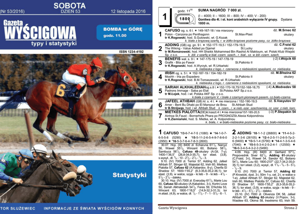 godz. 11 1 1 2 3 4 5 6 7 00 SUMA NAGRÓD 7 000 zł. (I – 4000; II – 1600; III – 800; IV – 400; V - 200) Gonitwa dla 4l. i st. koni arabskich wyłącznie IV grupy. Dystans 1800 m. CAFUSO og. s. 6 l. 149-167-18 / nie mierzony dŜ. M.Srnec 62 Polon - Canzona po Penthagonn St.Max-Plast okulary tr K.Rogowski, hod. S.Gutowski, wł. G.Kozak k. biała z brązową szarfą, r. w Ŝółto-brązowe poziome pasy, cz. Ŝółto-brązowa dŜ. C.Fraisl 62 ADDING (GB) og. gn. 9 l. 152-177-19,5 / 152-179-19,5 The Wiking - Value Added po Djamel St.Lucky okulary tr M.Romanowski, hod. HH Sheikk Mohammed Bin Rashid Al Maktoum, wł. Polski Klub Wiejski Sp. z o.o. k. Ŝół. z szarfą w biał.-czarn. szach., r. biał., cz. w Ŝół.-czarn. szach. (-2) I.Wójcik 60 BENEFIS wał. s. 9 l. 147-175-19 / 147-178-19 Grafik - Bila po Fawor St.Palkinto II tr K.Rogowski, hod. A.Wyrzyk, wł. R.Urbański k. niebieska z logo, r. czerwone z niebieskimi opaskami, cz. niebieska dŜ. M.Březina 62 IRISH og. s. 5 l. 152-187-19 / 154-182-19 Moshh - Irta po Espadero St.Palkinto II okulary tr K.Rogowski, hod. B.M.Tomaszewski, wł. R.Urbański k. niebieska z logo, r. czerwone z niebieskimi opaskami, cz. niebieska (-4) A.Medvedev 58 SARIAH ALKHALEDIAHog.s.8 l.152-170-18,75/152-168-18,75 Padrons Immage - Saba po Etat St.Polska AKF Sp.z o.o. tr M.Łojek, hod. i wł. Polska AKF Sp. z o.o. k.biała z czarnym V, r.białe z czarnym pionowym pasem, cz.biało-czarna dŜ. S.Vasyutov 57 JAFEEL ATHBAH (GB) kl. s. 4 l. nie mierzona / 152-190-19,5 Amer - Bent Bu Dhabi po El Mansour de Brou St.Athbah Stud tr B.Strójwąs, hod. i wł. Athbah Stud k. czarn., r. w nieb.-szar. szachownicę, cz. szar. z nieb. karo (-3) P.Stepakin 54 MIETKES PIALOTTA(DE)kl.kaszt.4 l.nie mierzona/157-185-20,5 Ainhoa St.Faust - Bornerhofs Phara po PROGNOZSt.Alexia Kolpondinou tr K.Ziemiański, hod. S. Mietke, wł. A. Kolpondinou k. biała, r. w biało-niebieskie poziome pasy, cz. biało-niebieska 1 CAFUSO ’13-6-7-4-7-5 (1080) ’14-1-0-76-5-5-8 (5290) ’15-5-11-2-6-5-4-9-7-8-6-0 (2950) ’16-5-3-7-6-4-7-8-3 (2600) 30.07. Hcp. (III) 8400 zł. Echaruna 611/2, Narcyz 58, Wawel 551/2, Wincent 60, Boitano 581/2, Sambuca 561/2, Cafuso 49-okulary (A.Gil, 7-y); 1400-1’36,5” (26,8-34,0-35,7); tor elast. (3,8), s.wysył., dł. 3/4 - 10 - 21/2 - 21/2 - 3/4 - 3. 9.10. (IV) 7000 zł. Terrior 57, Adding 62, Jafeel Athbah 57, Stinger 62, Majestat 62, Irish 60, Mietkes Pialotta 57, Cafuso 62 (A.Kabardov, 8-y), Cherifa El Shadow 57; 1600-1’55,2” (8,3-35,6-35,2-36,1); tor elast. (3,9), w walce, szyja - kr.łeb - 9 - kr.łeb - 41/2 51/2 - 21/2 - daleko. 30.10. Hcp. (IV) 7000 zł. Everyday 611/2, Marie Lou 60, Cafuso 53-okulary (A.Kabardov, 3-i), Kortni Love 50, Sariah Alkhalediah 541/2, Feres 59, D'Achila 53, Wincent 63; 1800-1’18,5” (14,9-32,3-31,3); tor m.elast. (4,9), w walce, dł. 1/2 - 11/2 - 7 - 1 - 51/2 - 6 - 1. Gazeta Wyscigowa 2 ADDING ’10-1-1-2 (26800) ’11-4-5-22-2-1-3-6 (26105) ’12-4-2-5-11-2-6-5-7p-26 (9400) ’13-5-1-4 (5790) ’14-4-1-3-5-4-6 (7040) ’15-6-5-3-4-2-5-2-4-1 (12550) ’16-6-3-4-5-4-3-2-3 (5490) 4.09. Hcp. (III) 8400 zł. Gerhard 571/2, Propovednik Siver 621/2, Adding 61-okulary (C.Fraisl, 3-i), Wawel 54, Sandor 62, Boitano 541/2, Marie Lou 60; 1800-2’07” (22,7-34,2-35,035,1); tor l.elast. (3,2), wysył., dł. 11/4 - 3/4 - 5 - 51/2 - 1/2 - 9. 9.10. (IV) 7000 zł. Terrior 57, Adding 62 (P.Krowicki, dyst. 3-i, 50m 1-y, cel. 2-i, w walce o 1-e), Jafeel Athbah 57, Stinger 62, Majestat 62, Irish 60, Mietkes Pialotta 57, Cafuso 62, Cherifa El Shadow 57; 1600-1’55,2” (8,3-35,6-35,236,1); tor elast. (3,9), w walce, szyja - kr.łeb - 9 kr.łeb - 41/2 - 51/2 - 21/2 - daleko. 23.10. (IV) 7000 zł. Olivenza DK 58, Jafeel Athbah 57, Adding 62-okulary (V.Popov, 3-i), Wasilew 63, Okima 58, Inextremo 63, Irish 59; Strona 2 2000-2’31,1” (39,4-37,8-35,4-38,5); tor cięŜki (5,1), s.wysył., kr.łeb - 51/2 - 2 - 11/2 - daleko - 8. 3 BENEFIS ’11-8-6-6-3-1-1-3-4 (8260) ’124-2-2-2-6-1-3-2-1-3-7-7-3-1 (21040) ’13-7-1-53-6-2-2-9-5-4-5-4 (16270) ’14-2-1-7-5-2-8-4-66-9 (10480) ’15-7-2-6-2-4-3-4-6-9-7-7 (6700) ’16-8-7-6-6-4-7-9 (400) 11.09. (IV) 7000 zł. Tollee Dust 62, Mietkes Pialotta 56, Sariah Alkhalediah 60, Benefis 61okulary (K.Mazur, dyst. 2-i, 200m 4-y), Majestat 62; 2000-2’26,6” (38,5-36,6-34,4-37,1); tor elast. (3,4), w walce, dł. 0. 1.10. Hcp. (IV) 7000 zł. Riad Hibah 571/2, Kankan 61, Pendragon 551/2, Okima 62, Flower Power 581/2, M Gemma Joules 60, Benefis 57-okulary (S.Mazur, 7-y), Sariah Alkhalediah 60, Orbitale 54, Admet 59, Portman 511/2, Gazi 601/2; 1800-2’06,9” (22,8-34,633,8-35,7); tor elast. (3,5), wysył., dł. 11/4 - 21/2 - 7 11/2 - 1 - 11/4 - szyja - 41/2 - 1 - 6 - 1. 30.10. Hcp. (IV) 7000 zł. Pendragon 551/2, Kankan 62, Terrior 63, M Gemma Joules 581/2, Stinger 531/2, Kaas Al Khalediah 52, Flower Power 56, Mietkes Pialotta 551/2, Benefis 551/2-okulary (A.Kabardov, 9y); 1800-2’13,1” (21,8-35,6-37,3-38,4); tor m.elast. (4,9), wysył., dł. 11/4 - 3/4 - 4 - daleko - 1/2 - 6 - 11/2 13. 4 IRISH ’14-5-6-6-5-1-4-6-6-6 (8850) ’15-84-5-6-4-4-5 (2300) ’16-4-4-9-5-6-7-6-5-5-6-7 (1740) 25.09. (III) 8400 zł. Belgazal 62, Narcyz 59, Olivenza DK 57, Nawigator 58, Irish 57-okulary (J.Wyrzyk, dyst. 7-y, 150m 5-y), Ebenos 59, Kaas Al Khalediah 57; 1400-1’38,3” (28,8-34-35,5); tor elast. (3,2), łatwo, dł. 31/2 - 11/4 - 11/2 - 4 - 11/2 - 3. 9.10. (IV) 7000 zł. Terrior 57, Adding 62, Jafeel Athbah 57, Stinger 62, Majestat 62, Irish 60 (J.Wyrzyk, dyst. 8-y, 100m 6-y), Mietkes Pialotta 57, Cafuso 62, Cherifa El Shadow 57; 1600-1’55,2” (8,335,6-35,2-36,1); tor elast. (3,9), w walce, szyja kr.łeb - 9 - kr.łeb - 41/2 - 51/2 - 21/2 - daleko. 23.10. (IV) 7000 zł. Olivenza DK 58, Jafeel Athbah 57, Adding 62, Wasilew 63, Okima 58, Inextremo 63, Irish 59-okulary (P.Stepakin, 7-y); 2000-2’31,1” (39,4-37,8-35,4-38,5); tor cięŜki (5,1), s.wysył., kr.łeb - 51/2 - 2 - 11/2 - daleko - 8. 5 SARIAH ALKHALEDI