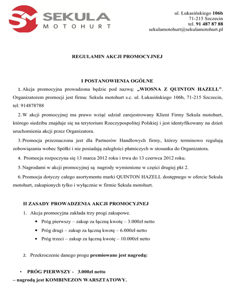 ul. Łukasińskiego 106b 71-215 Szczecin tel. 91 487 87 88 [email protected] REGULAMIN AKCJI PROMOCYJNEJ I POSTANOWIENIA OGÓLNE 1. Akcja promocyjna prowadzona będzie pod nazwą: „WIOSNA Z QUINTON HAZELL”. Organizatorem promocji jest firma: Sekula motohurt s.c. ul. Łukasińskiego 106b, 71-215 Szczecin, tel: 914878788 2. W akcji promocyjnej ma prawo wziąć udział zarejestrowany Klient Firmy Sekula motohurt, którego siedziba znajduje się na terytorium Rzeczypospolitej Polskiej i jest identyfikowany na dzień uruchomienia akcji przez Organizatora. 3. Promocja przeznaczona jest dla Partnerów Handlowych firmy, którzy terminowo regulują zobowiązania wobec Spółki i nie posiadają zaległości płatniczych w stosunku do Organizatora. 4. Promocja rozpoczyna się 13 marca 2012 roku i trwa do 13 czerwca 2012 roku. 5. Nagrodami w akcji promocyjnej są nagrody wymienione w części drugiej pkt 2. 6. Promocja dotyczy całego asortymentu marki QUINTON HAZELL dostępnego w ofercie Sekula motohurt, zakupionych tylko i wyłącznie w firmie Sekula motohurt. II ZASADY PROWADZENIA AKCJI PROMOCYJNEJ 1. Akcja promocyjna zakłada trzy progi zakupowe. ▪ Próg pierwszy – zakup za łączną kwotę – 3.000zł netto ▪ Próg drugi – zakup za łączną kwotę – 6.000zł netto ▪ Próg trzeci – zakup za łączną kwotę – 10.000zł netto 2. Przekroczenie danego progu premiowane jest nagrodą: • PRÓG PIERWSZY - 3.000zł netto – nagrodą jest KOMBINEZON WARSZTATOWY. PRÓG DRUGI - 6.000zł netto – nagroda o wartości 400zł netto do wyboru: • a) Propozycja pierwsza - V2461 ZESTAW KLUCZY NASADOWYCH 1/2" 1/4" 3/8" 172 CZĘŚCIOWY, b) Propozycja druga - Urządzenie rozruchowe z kompresorem GYSPACK AIR 400 c) Propozycja trzecia - V1031 ZESTAW KLUCZY PŁ-OCZKOWYCH Z GRZECHOTKĄ 12 ELEMENTÓW + V1463 LAMPA WARSZTATOWA DIODOWA 28 LED Z ŁADOWARKĄ d) Propozycja czwarta – Nawigacja samochodowa • PRÓG TRZECI - 10.000zł netto - nagroda o wartości 1.000zł netto do wyboru: a) Propozycja pierwsza - Zestaw narzędzi VIGOR - V2542 ZESTAW NARZĘDZI UNIWERSALNYCH 143 CZĘŚCIOWY b) Propozycja druga - Zestaw narzędzi pneumatycznych HAZET: HZT 9012MG/4 Klucz pneumatyczny 1/2" z nasadkami + HZT 9022-2 Klucz pneumatyczny kątowy z mechanizmem zapadkowym 1/2" 70 Nm c) Propozycja trzecia - NORTEC 10900L Zlewarko-wysysarka ze zbiornikiem kontrolnym 90l. d) Propozycja czwarta – Konsola gier wideo Sony PS3 z dodatkiem kontrolera ruchu Sony MOVE 3. W promocji bierze udział pełna gama produktów marki QUINTON HAZELL. 4. Przekroczenie danego progu gwarantuje otrzymanie jednej nagrody z danego progu, tj. jeżeli klient przekroczy zakupy obejmujące próg trzeci, otrzymuje nagrodę TYLKO z progu trzeciego. 5. Towar zakupiony w okresie promocji nie podlega zwrotowi, wyłączając ewentualne reklamacje. 6. Wartość obrotów aktualizowana będzie raz w miesiącu lub na życzenie uczestnika. 7. Warunkiem otrzymania nagrody jest uregulowanie wszelkich należności płatniczych wobec Sekula motohurt s.c. III POSTANOWIENIA KOŃCOWE 1. Sekula motohurt zastrzega sobie prawo do zmiany niniejszego regulaminu w czasie trwania promocji. 2. Wzięcie udziału w promocji oznacza zgodę na warunki promocji określone jej regulaminem. 4. Sekula motohurt nie przewiduje możliwości wypłacenia ekwiwalentu pieniężnego lub rzeczowego w zamian za rezygnację z nagrody, lub przekazania jej osobie trzeciej. 5. Zdjęcia zawarte w ulotce mają charakter wyłącznie poglądowy. 6. Dokładne informację na temat nagród można uzyskać u Przedstawicieli handlowych oraz pod adresem mailowym [email protected] 7. Wydanie nagród nastąpi w dwa tygodnie po zakończeniu akcji promocyjnej. www.sekulamotohurt.pl