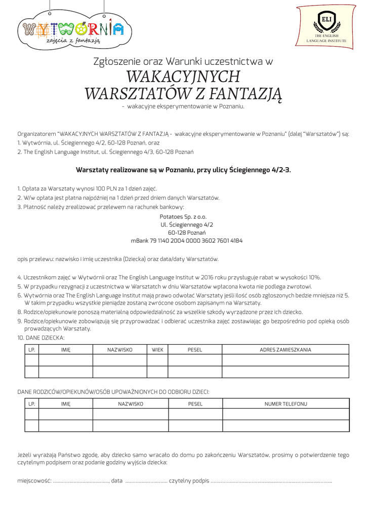 Zgłoszenie oraz Warunki uczestnictwa w WAKACYJNYCH WARSZTATÓW Z FANTAZJĄ - wakacyjne eksperymentowanie w Poznaniu. Organizatorem “WAKACYJNYCH WARSZTATÓW Z FANTAZJĄ - wakacyjne eksperymentowanie w Poznaniu” (dalej “Warsztatów”) są: 1. Wytwórnia, ul. Ściegiennego 4/2, 60-128 Poznań, oraz 2. The English Language Institut, ul. Ściegiennego 4/3, 60-128 Poznań Warsztaty realizowane są w Poznaniu, przy ulicy Ściegiennego 4/2-3. 1. Opłata za Warsztaty wynosi 100 PLN za 1 dzień zajęć. 2. W/w opłata jest płatna najpóźniej na 1 dzień przed dniem danych Warsztatów. 3. Płatność należy zrealizować przelewem na rachunek bankowy: Potatoes Sp. z o.o. Ul. Ściegiennego 4/2 60-128 Poznań mBank 79 1140 2004 0000 3602 7601 4184 opis przelewu: nazwisko i imię uczestnika (Dziecka) oraz data/daty Warsztatów. 4. Uczestnikom zajęć w Wytwórnii oraz The English Language Institut w 2016 roku przysługuje rabat w wysokości 10%. 5. W przypadku rezygnacji z uczestnictwa w Warsztatch w dniu Warsztatów wpłacona kwota nie podlega zwrotowi. 6. Wytwórnia oraz The English Language Institut mają prawo odwołać Warsztaty jeśli ilość osób zgłoszonych bedzie mniejsza niż 5. W takim przypadku wszystkie pieniądze zostaną zwrócone osobom zapisanym na Warsztaty. 8. Rodzice/opiekunowie ponoszą materialną odpowiedzialność za wszelkie szkody wyrządzone przez ich dziecko. 9. Rodzice/opiekunowie zobowiązują się przyprowadzać i odbierać uczestnika zajęć zostawiając go bezpośrednio pod opieką osób prowadzących Warsztaty. 10. DANE DZIECKA: LP. IMIĘ NAZWISKO WIEK PESEL ADRES ZAMIESZKANIA DANE RODZICÓW/OPIEKUNÓW/OSÓB UPOWAŻNIONYCH DO ODBIORU DZIECI: LP. IMIĘ NAZWISKO PESEL NUMER TELEFONU Jeżeli wyrażają Państwo zgodę, aby dziecko samo wracało do domu po zakończeniu Warsztatów, prosimy o potwierdzenie tego czytelnym podpisem oraz podanie godziny wyjścia dziecka: miejscowość: ……………………….…….…, data ………………….……. czytelny podpis …………………………….................…………………….………. 11. Uwagi o zdrowiu dziecka, o których powinien wiedzić opiekun: ………………………………………………………………………………………………………………………………………..……………………………………………… Czy dziecko cierpi na? (proszę zaznaczyć): omdlenia * napady drgawek * duszności * zawroty głowy * wymioty, inne dolegliwości (jakie?) ..............................................................................................................................………………………………………………………………………................... 12. Termin i tematyka Warsztatów (proszę zaznaczyć wybrany termin/terminy): ROBOTYKA I EKSPERYMENTY PN: Lego WeDo i/lub Mindstroms - składanie i programowanie | Jak zrobić płyn magnetyczny | Zabawy Lego na makietach. WT: Lego WeDo i/lub Mindstroms - składanie i programowanie | Jak zrobić baterie z wody | Zabawy Lego na makietach. ŚR: Lego WeDo i/lub Mindstroms - składanie i programowanie | Skamieliny | Zabawy Lego na makietach. C ZW: Lego WeDo i/lub Mindstroms - składanie i programowanie | Zwierzaki składane | Zabawy Lego na makietach. PT: Mindstroms - wyścigi i konkursy z nagrodami | Iluzje z nauki | Zabawy Lego na makietach. 27.06 - 01.07 27.06 (PN) | 28.06 (WT) | 29.06 (ŚR) | 30.06 (CZW) | 01.07 (PT) | 11.07 - 15.07 11.07 (PN) | 12.07 (WT) | 13.07 (ŚR) | 14.07 (CZW) | 15.07 (PT) | 15.08 - 19.08 15.08 (PN) | 16.08 (WT) | 17.08 (ŚR) | 18.08 (CZW) | 19.08 (PT) | SZTUKA I EKSPERYMENT PN: PŁASKORZEŹBA | Dinozaur 3D | Zabawy Lego na makietach. WT: MALARSTWO/RYSUNEK | Jak zrobić papierowy samolot, który poleci do 100m. | Zabawy Lego na makietach. ŚR: DEKUPAŻ | Lawa lamp | Zabawy Lego na makietach. C ZW: TWORZENIE TORU DO KULEK | Podbój kosmosu | Zabawy Lego na makietach. PT: DIY - ZAJĘCIA Z WYOBRAŹNIĄ | Jak silny jest papier | Zabawy Lego na makietach. 04.07 - 08.07 04.07 (PN) | 05.07 (WT) | 06.07 (ŚR) | 07.07 (CZW) | 08.07 (PT) | 01.08 - 05.08 01.08 (PN) | 02.08 (WT) | 03.08 (ŚR) | 04.08 (CZW) | 05.08 (PT) | 22.08 - 26.08 22.08 (PN) | 23.08 (WT) | 24.08 (ŚR) | 25.08 (CZW) | 26.08 (PT) | 13. Zasady przebywania na Warsztatach. Uczestnik zajęć zobowiązany jest stosować się do postanowień niniejszego regulaminu, oraz innych regulaminów szczegółowych związanych z pobytem na terenie obiektów, w których prowadzone są zajęcia (regulaminu ppoż, itp.) oraz do poleceń opiekunów prowadzących zajęcia jak również personelu porządkowego danego obiektu. Bezwzględnie zakazane jest: - samowolne wychodzenie z sali zajęć i/lub oddalanie się od grupy; - niszczenie lub używanie sprzętów i wyposażenia niezgodnie z ich przeznaczeniem; - używanie słów uznanych powszechnie za niecenzuralne. Uczestnik ma obowiązek: - uczestniczenia we wszystkich zajęciach organizowanych dla jego/jej grupy; - w przypadku jakiejkolwiek niedyspozycji niezwłocznie zgłosić to opiekunowi; - zgłaszać nauczycielowi wszelkie zauważone nieprawidłowości oraz problemy szczególnie zagrożenia dla zdrowia lub życia; - poszanowania cudzej własności, godności osobistej drugiego człowieka i jego przekonań. Organizator nie ponosi żadnej odpowiedzialności za: telefony komórkowe i inne akcesoria elektorniczne, pieniądze i inne rzeczy wartościowe, które uczestnik przyniesie na zajęcia. Każde wykroczenie przeciw zasadom regulaminu będzie skutkowało upomnieniem, a w przypadkach drastycznych wezwaniem rodziców/opiekunów I wydaleniem z zajęć bez zwrotu kosztów. 14. Zgoda rodziców lub opiekunów na uczestnictwo w Warsztatach. Niniejszym oświadczam, iż zapoznałem się z powyższym warunkami, akceptuję je oraz zgłaszam chęć uczestnictwa mojego/j syna/córki w Warsztatach. Oswiadczam, że moje dziecko nie posiada przeciwwskazań lekarskich do pracy prz