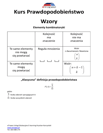 Kurs Prawdopodobieństwo Wzory Elementy kombinatoryki „Klasyczna” definicja prawdopodobieństwa P A gdzie: A - liczba zdarzeń sprzyjających A - liczba wszystkich zdarzeń eTrapez Usługi Edukacyjne E-learning Krystian Karczyński www.etrapez.pl Tel. 603 088 274 Prawdopodobieństwo – definicja Kołmogorowa - zbiór wszystkich zdarzeń elementarnych S – „sigma-ciało” na zbiorze , czyli zbiór jego podzbiorów spełniający warunki: 1) S 2) S S 3) 1 , 2 , 3 ,... S 1 2 3 ... U n S n 1 P – funkcja o argumentach ze zbioru S i wartościach będących liczbami rzeczywistymi, spełniająca warunki („aksjomaty”): 1. P 0 S 2. P 1 3. P 1 2 3 ... P 1 P 2 P 3 ... - dla zdarzeń parami rozłącznych, tzn. i j dla i j Wartości funkcji P A możemy nazywać „prawdopodobieństwem” Własności prawdopodobieństwa 1. P 0,1 2. P 0 3. P P 4. P 1 P 5. P \ P P 6. P P P P Niezależność zdarzeń Zdarzenia A i B są niezależne, gdy: P P P Prawdopodobieństwo warunkowe Prawdopodobieństwo warunkowe zajścia zdarzenia A pod warunkiem zajścia zdarzenia B oznaczamy jako P | i liczymy ze wzoru: eTrapez Usługi Edukacyjne E-learning Krystian Karczyński www.etrapez.pl Tel. 603 088 274 P | P P Prawdopodobieństwo całkowite i wzór Bayesa Zakładając, że i j dla i j i P 1 P 2 ... P n 1 : Prawdopodobieństwo całkowite P P 1 P 1 P 2 P 2 ... P n P n Wzór Bayesa P i P i P i P Schemat Bernoulliego Prawdopodobieństwo zajścia k „sukcesów” w n niezależnych i identycznych doświadczeniach, z których każde może zakończyć się tylko na dwa sposoby (z prawdopodobieństwami p dla „sukcesu” i q dla „porażki”) wynosi: n P S k p k q nk k eTrapez Usługi Edukacyjne E-learning Krystian Karczyński www.etrapez.pl Tel. 603 088 274 Zmienne losowe Dyskretne zmienne losowe Rozkład p i 1 Dystrybuanta F x P X x Wartość oczekiwana EX xi pi Mediana x0,5 , Me Wartość zmiennej losowej, dla której skumulowane prawdopodobieństwa „przekraczają” 1 2 Dominanta, moda D Wartość zmiennej losowej osiągana z największym prawdopodobieństwem Kwantyl rzędu p x p Wartość zmiennej losowej, dla której skumulowane prawdopodobieństwa „przekraczają” p Wariancja D 2 X , 2 D2 X xi EX pi , D2 X EX n EX 2 n Odchylenie standardowe D X , D X D2 X Współczynnik zmienności V V D X EX eTrapez Usługi Edukacyjne E-learning Krystian Karczyński www.etrapez.pl Tel. 603 088 274 Moment zwykły n-tego rzędu EX n , n EX n xin pi Moment centralny n-tego rzędu n n xi EX pi n Współczynnik asymetrii 1 3 D X 3 Współczynnik koncentracji K 4 D X 4 Przykłady rozkładów dyskretnych zmiennych losowych Rozkład Bernoulliego W rozkładzie Bernoulliego prawdopodobieństwa określane są ze wzoru: n P X k p k q nk k EX np D2 X npq Rozkład Poissona W rozkładzie Poissona prawdopodobieństwa określane są ze wzoru: P X k k k! e EX D2 X Dla dużych n i małych p rozkład Bernoulliego można zastępować rozkładem Poissona eTrapez Usługi Edukacyjne E-learning Krystian Karczyński www.etrapez.pl Tel. 603 088 274 Rozkład hipergeometryczny W rozkładzie hipergeometrycznym prawdopodobieństwa określane są ze wzoru: M N M k n k P X k N n Gdzie N to ilość wszystkich elementów w populacji, M to ilość wszystkich elementów w populacji o określonej cesze, n to ilość elementów w próbce, k to ilość elementów w próbce o określonej cesze EX M n N D2 X n M M N n 1 N N N 1 Dla dużych N i M, oraz M p rozkład Bernoulliego można zastępować rozkładem N hipergeometrycznym. eTrapez Usługi Edukacyjne E-learning Krystian Karczyński www.etrapez.pl Tel. 603 088 274 Ciągłe zmienne losowe Funkcja gęstości f x b P a X b f x dx a f x dx 1 Dystrybuanta F x P X x x f t dt Wartość oczekiwana EX xf x dx Mediana x0,5 , Me Wartość x0,5 , dla której F x0,5 0,5 Dominanta, moda D Maksimum globalne funkcji gęstości f x Kwantyl rzędu p x p Wartość x p , dla której F x p p Wariancja D 2 X , 2 D2 X x EX f x dx , D X EX EX 2 2 n Odchylenie standardowe D X , D X D2 X eTrapez Usługi Edukacyjne E-learning Krystian Karczyński www.etrapez.pl Tel. 603 088 274 n Współczynnik zmienności V V D X EX Moment zwykły n-tego rzędu EX n , n x f x dx EX n EX n Moment centralny n-tego rzędu n n x EX f x dx n Współczynnik asymetrii 1 3 D X 3 Współczynnik koncentracji K 4 D X 4 Przykłady rozkładów ciągłych zmiennych losowych Rozkład normalny W rozkładzie normalnym prawdopodobieństwa określane są z funkcji gęstości o wzorze: 1 f x e 2 x m 2 2 2 EX m D2 X 2 Standaryzacja rozkładu normalnego: Z X m eTrapez Usługi Edukacyjne E-learning Krystian Karczyński www.etrapez.pl Tel. 603 088 274 Rozkład jednostajny W rozkładzie jednostajnym prawdopodobieństwa określane są z funkcji gęstości o wzorze: 1 w przedziale x a, b f x b a dla pozostalych x 0 Rozkład wykładniczy W rozkładzie wykładniczym prawdopodobieństwa określane są z funkcji gęstości o wzorze: 1 x e dla x 0 f x 0 dla x 0 EX D2 X eTrapez Usługi Edukacyjne E-learning Krystian Karczyński www.etrapez.pl Tel. 603 088 274 Zmienne losowe dwuwymiarowe Dyskretne zmienne losowe dwuwymiarowe Rozkład Rozkłady brzegowe p , p i. i .j j Prawdopodobieństwo warunkowe P X xi Y y j pij p. j , P Y y j X xi pij pi. Niezależność zmiennych losowych Dwie zmienne losowe X i Y nazywamy niezależnymi, gdy: P X xi , Y y j P X xi P Y y j i, j Dystrybuanta F x, y P X x, Y y pij xi x y j y Wartości oczekiwane Wartości oczekiwane EX , EY liczymy z rozkładów brzegowych Wariancje Wariancje D 2 X D 2 Y , liczymy z rozkładów brzegowych. eTrapez Usługi Edukacyjne E-learning Krystian Karczyński www.etrapez.pl Tel. 603 088 274 Kowariancja C X , Y xi E X y j E Y pij i j Współczynnik korelacji C X ,Y D X D Y Jeśli 0 zmienne losowe nazywamy „nieskorelowanymi”. Nie oznacza to jednak, że są niezależne. Jeśli jednak zmienne losowe są niezależne, to na pewno 0 . eTrapez Usługi Edukacyjne E-learning Krystian Karczyński www.etrapez.pl Tel. 603 088 274 Ci