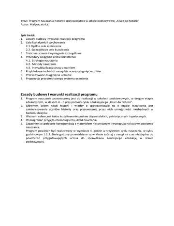 Tytuł: Program nauczania historii i społeczeństwa w szkole podstawowej „Klucz do historii” Autor: Małgorzata Lis Spis treści: 1. Zasady budowy i warunki realizacji programu 2. Cele kształcenia i wychowania 2.1 Ogólne cele kształcenia 2.2. Szczegółowe cele kształcenia 3. Treści nauczania i wymagania szczegółowe 4. Procedury osiągania celów kształcenia 4.1. Strategie nauczania 4.2. Metody nauczania 4.3. Indywidualizacja pracy z uczniem 5. Przykładowe techniki i narzędzia oceny osiągnięć uczniów 6. Przewidywane osiągnięcia uczniów 7. Propozycja przedmiotowego systemu oceniania Zasady budowy i warunki realizacji programu 1. Program nauczania przeznaczony jest do realizacji w szkołach podstawowych, w drugim etapie edukacyjnym, w klasach 4 – 6 przy pomocy cyklu edukacyjnego „Klucz do historii”. 2. Głównym celem nauki historii i wiedzy o społeczeństwie na II etapie kształcenia jest zainteresowanie uczniów historią oraz przyswojenie przez nich umiejętności niezbędnych w badaniu dziejów. 3. Ważnym celem jest także kształtowanie postaw obywatelskich, patriotycznych i społecznych. 4. W programie przyjęto chronologiczny układ nauczania. 5. Zagadnienia społeczne korespondują z materiałem historycznym i występują na każdym poziomie nauczania. Program powinien być realizowany w wymiarze 4. godzin w trzyletnim cyklu nauczania, w cyklu godzinowym 1:1:2. Dwie godziny przewidziane są w klasie szóstej z uwagi na czas niezbędny do powtórzeń przygotowujących ucznia do sprawdzianu kończącego edukację w szkole podstawowej. Cele kształcenia i wychowania Ogólne cele kształcenia i wychowania Ogólne cele edukacji historycznej określa podstawa programowa przedmiotu historia i społeczeństwo, w której określono następujące cele kształcenia: Znajomość chronologii historycznej: 1. Uczeń zna: wydarzenia i postaci z historii Polski, które miały zasadnicze znaczenie dla jej losów 2. Uczeń wie: jak umieścić wydarzenia w przedziałach czasowych oraz obliczyć upływ czasu między tymi wydarzeniami 3. Uczeń umie: potrafi wskazać najważniejsze elementy polskiego dziedzictwa kulturowego rysować drzewo genealogiczne opisać swoją „małą Ojczyznę”, uwzględniając tradycję historyczno‐kulturową i problemy społeczno‐gospodarcze wyjaśnić znaczenie wynalazku pisma dla wspólnoty ludzkiej 4. Uczeń: interesuje się przeszłością dostrzega związek między teraźniejszością a przeszłością, między elementami kultury polskiej i antycznej, widzi ciągłość rozwoju kulturalnego i cywilizacyjnego Umiejętność analizy i interpretacji historycznej: 1. Uczeń wie: że zróżnicowanie regionalne Polski jest efektem warunków przyrodniczych i działalności człowieka co to są źródła historyczne i do czego służą na czym polega praca historyka 2. Uczeń umie: integrować wiedzę historyczną uzyskaną z różnych źródeł, odczytywać i opisywać różnorodne źródła informacji historycznej i wykorzystać je przy rekonstrukcji przeszłości ująć treści historyczne w związkach przyczynowo‐skutkowych posługiwać się osią czasu, planem, mapą, wykresami i tabelami podać przykłady ważnych problemów współczesnej Polski, korzystając z różnych źródeł informacji (od osób dorosłych, z prasy, radia, telewizji, Internetu) 3. Uczeń dostrzega związek między zagospodarowaniem terenu w miejscu zamieszkania oraz uwarunkowaniem życia ludzi danego obszaru a czynnikami przyrodniczymi i pozaprzyrodniczymi wyciąga wnioski z porównywania dwóch i więcej prostych informacji dotyczących wydarzeń i postaci historycznych poszukuje potrzebnych informacji w różnorodnych źródłach oraz rozwija umiejętności ich selekcjonowania, porządkowania i przechowywania zbiera informacje o rozmaitych formach upamiętniania postaci i wydarzeń z przeszłości „małej Ojczyzny” zbiera z różnych źródeł informacje o zasługach dla rozwoju kultury polskiej wybitnych Polaków Tworzenie narracji historycznej: 1. Uczeń umie: wyrażać własne zdanie i słuchać zdania innych 2. Uczeń podejmuje samodzielną, krytyczna próbę oceny faktów i wydarzeń współczesnych i z przeszłości, potrafi też formułować uzasadnienie własnych postaw i poglądów tworzy opowiadanie oparte na treściach historycznych, z obrazowym ujęciem epizodów, postaci i scenek historycznych tłumaczy, odwołując się do przykładów, na czym polega postępowanie sprawiedliwe Zainteresowanie problematyką społeczną: 1. Uczeń wie kim jest i jaki jest oraz jakie ma prawa i obowiązki to jest społeczeństwo oraz jak kształtowało się w przeszłości co to jest Unia Europejska oraz jakie są jej cele 2. Uczeń zna: swoje najbliższe otoczenie: rodzinę, szkołę, region, zna jego historię. krajobraz najbliższej okolicy 3. Uczeń umie: określić swoją przynależność do grupy rodzinnej, społeczności lokalnej, grupy etnicznej, narodu, państwa, społeczności europejskiej i światowej określić, co lubi, co jest dla niego ważne formułować pytania i problemy dotyczące zjawisk zachodzących w środowisku lokalnym, regionalnym oraz poszukuje ich rozwiązań z wykorzystaniem dostępnych źródeł informacji podać przykłady różnorodnych potrzeb człowieka oraz sposoby ich zaspokajania wyjaśnić, w czym przejawia się uprzejmość i tolerancja wymienić mniejszości narodowe i etniczne żyjące w Polsce i na wybranych przykładach opisać ich kulturę i tradycje oraz wymienić miejsca największe skupiska Polaków na świecie wyjaśnić znaczenie pracy w życiu człowieka i dostrzec jej społeczny podział opisać i ocenić na przykładach wpływ techniki na środowisko naturalne i życie człowieka wymienić pożytki i niebezpieczeństwa korzystania z mediów elektronicznych 4. Uczeń: dokonuje świadomej samoidentyfikacji kulturowej, narodowej, etnicznej, regionalnej i państwowej ma świadomość wolności osobistej, potraf