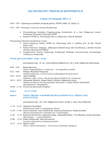 SZCZEGÓŁOWY PROGRAM KONFERENCJI I dzień (21 listopada 2013 r.) 8.00 – 8.30 – rejestracja uczestników (budynek główny WSSP Lublin, ul. Choiny 2) 8.30 – 9.00 – Powitanie i uroczyste otwarcie Konferencji Przewodnicząca Komitetu Organizacyjnego Konferencji: dr n. biol. Małgorzata Gorzel, Prodziekan Wydziału Fizjoterapii WSSP Kanclerz WSSP im. Wincentego Pola w Lublinie doc. Henryk Stefanek Przemówienia Patronów Konferencji i Gości: Patron Honorowy Rektor WSSP im. Wincentego Pola w Lublinie prof. dr hab. Witold Kłaczewski Patron Honorowy drugiego, edukacyjno-szkoleniowego dnia Konferencji, Lubelski Kurator Oświaty mgr Krzysztof Babisz Przedstawiciel Patrona Naukowego Konferencji Polskiego Stowarzyszenia Kosmetologii i Medycyny Estetycznej WYKŁADY PLENARNE (9.00 – 10.35) prowadzenie sesji: dr inż. Anna Kiełtyka-Dadasiewicz i dr n. med. Małgorzata Starczyńska, 9.00 – 9.20 Kinga Borowicz Osocze bogatopłytkowe w medycynie – od ortopedii do estetyki 9.25 – 9.45 Elżbieta Wenerska-Wojtaszek Aspekty biofizyczne w nowoczesnych technologiach kosmetycznych 9.50 – 10.10 Anna Nadulska Zdobienie ciała i twarzy jako forma ekspresji kulturowej i estetycznej 10.15 – 10.35 Aleksander Bielecki, Joanna Maria Cichocka, Małgorzata Gorzel Naukowe podstawy leczenia pijawkami lekarskimi z rodzaju Hirudo (Hirudinida: Hirudiniformes: Hirudinidae) 10.40 – 11.10 Przerwa na kawę (sala 28 parter) Sesja I Panel I (11.15 -13.30) NOWE TRENDY W KOSMETOLOGII, KOSMETYCE I MEDYCYNIE ESTETYCZNEJ prowadzenie sesji: dr n. biol. Małgorzata Gorzel i dr hab. n. med. Jerzy Bełtowski 11.15 – 11.25 Wojciech Chromiński Współczesne trendy w transplantacji włosów 11.30 – 11.40 Iwona Jazienicka, Anna Sokołowska, Katarzyna Kozłowicz, Jolanta Kwiatek Odczyny fotoalergiczne i fototoksyczne w kosmetologii 11.45 – 11.55 Katarzyna Kozłowicz, Agnieszka Lange, Aleksandra Pojnar, Ewa Banecka, Iwona Jazienicka Mezoterapia – „zastrzyk młodości” 12.00 – 12.10 Robert Kiedrowski, Edyta Kowalczyk Lecznicza bezkwasowa stylizacja paznokci 12.15 – 12.25 Marta Leszko Skóra w okresie menopauzy - nowoczesne technologie zabiegowe Panel II ZAGROŻENIA EPIDEMIOLOGICZNE W GABINECIE KOSMETYCZNYM 12.30 – 12.40 Maria Korniszuk Narażenie na szkodliwe czynniki biologiczne w gabinecie kosmetycznym 12.45 – 12.55 Agata Jabłońska-Trypuć Jak sprostać wymaganiom sanitarnym jakie muszą spełniać gabinety kosmetyczne w świetle obowiązującego prawa? 13.00 – 13.10 Waldemar Biaduń Pasożyt jako potencjalne zagrożenie epidemiologiczne w gabinecie kosmetycznym 13.15 – 13.30 Dyskusja 13.30 – 14.20 Lunch (sala 28 parter) 14.25 – 14.40 SESJA POSTEROWA (Hol - parter) plakaty dostępne cały dzień Sesja II PSYCHOSPOŁECZNE ASPEKTY POSTRZEGANIA URODY (14.45 – 16.40) prowadzenie sesji: dr n. chem. Elżbieta Wenerska-Wojtaszek i dr n. med. Anna Nadulska, prof. WSSP 14.45 – 14.55 Marta Makara-Studzińska, Katarzyna Sidor Społeczno - kulturowe uwarunkowania tatuażu 15.00 – 15.10 Anita Majchrowska Czy brzydota to choroba? Socjologiczna refleksja o znaczeniu urody we współczesnym społeczeństwie 15.15 – 15.25 Barbara Szyszkowska, Celina Łepecka – Klusek, Katarzyna Kozłowicz Zmiana wizerunku kobiety we współczesnym świecie a zaburzenia odżywiania 15.30 – 15.40 Katarzyna Kozłowicz, Aleksandra Pojnar, Agnieszka Lange, Iwona Jazienicka Dysmorfofobia jako wyzwanie dla kosmetologów 15.45 – 15.55 Katarzyna Kozłowicz, Wioleta Bajurko, Katarzyna Dziduch, Iwona Jazienicka Psychospołeczne aspekty trądziku pospolitego 16.00 – 16.10 Izabela Bedyniak – Siewierska Postrzeganie kolorów jako kategoria estetyczna i praktyczna 16.15 – 16.25 Joanna Masłowska, Beata Jankowska Psychodermatologia a medycyna estetyczna 16.30 -16.40 Dyskusja i podsumowanie sesji 16.40 – 16.55 Przerwa na kawę (sala 28 parter) Sesja III (17.00 – 18.30) Panel I ASPEKTY FIZJOTERAPII W KOSMETOLOGII (Aula) prowadzenie sesji: dr hab. n. farm. Joanna Matysiak i dr hab. n. med. Agnieszka PedryczWieczorska 17.00 – 17.10 Mirosław Jabłoński, Iwona Morawik Zniekształcenia nabyte stóp – operować czy rehabilitować? 17.15 – 17.25 Tomasz Karski, Jacek Karski Uwarunkowania prawidłowego rozwoju anatomicznego i funkcji stopy u dzieci i młodzieży 17.30– 17.40 Krzysztof Metera, Tomasz Saran Zapobieganie zniekształceniom nabytym palców stop u kobiet. Etiologia, profilaktyka i rehabilitacja. Panel II ALTERNATYWNE METODY I TERAPIE W SŁUŻBIE URODY I ZDROWIA (sala 53, I piętro) prowadzenie sesji: dr n. med. Anna Nadulska, prof. WSSP i dr n. biol. Małgorzata Gorzel 17.00 – 17.10 Marian Włodzimierz Sułek, Urszula Piotrowska, Tomasz Bujak Ekstrakty nadkrytyczne jako surowce kosmetyczne spełniające standardy COSMOS 17.15 – 17.25 Katarzyna Kordus, Radosław Śpiewak Czy "ryba doktor" wspomaga leczenie wyprysku i łuszczycy 17.30 – 17.40 Andrzej Marciniak, Jerzy Bełtowski, Sebastian Marciniak Biorewitalizacja. Kontrowersje: skuteczna terapia czy szarlataneria i intratny biznes? 17.45 – 17.55 Agata Nahorska, Barbara Thiem Zastosowanie roślinnych kultur komórkowych w innowacyjnych preparatach kosmetycznych 18.00 – 18.10 Anna Kiełtyka-Dadasiewicz, Elżbieta Wenerska-Wojtaszek Filozofia kosmetyki łagodnej – czy kosmetyki naturalne są nowoczesne? 18. 15 – 18.25 Anna Sokołowska, Iwona Jazienicka, Jolanta Kwiatek, Katarzyna Kozłowicz, Współpraca z klientem po zabiegu manualnego oczyszczenia” 20.00 uroczysty bankiet (Hotel Forum, ul. Obywatelska 4) na którym odbędzie się koncert Igora Marinowa uczestnika Must Be The Music II dzień (22 listopada 2013 r.) 8.15 – 9.00 Sesja I sekretariat konferencji PREZENTACJE FIRM BRANŻOWYCH (9.00 -10.30) AULA (parter) prowadzenie sesji: dr n. chem. Elżbieta Wenerska - Wojtaszek 9.00 – 9.25 Dagmara Sulewska Terapy Cool – terapia kontrastami i kriolipoliza – światowa nowość, firma Abacosun 9.30 – 10.00 Leszek Soczyński prezentacja fi