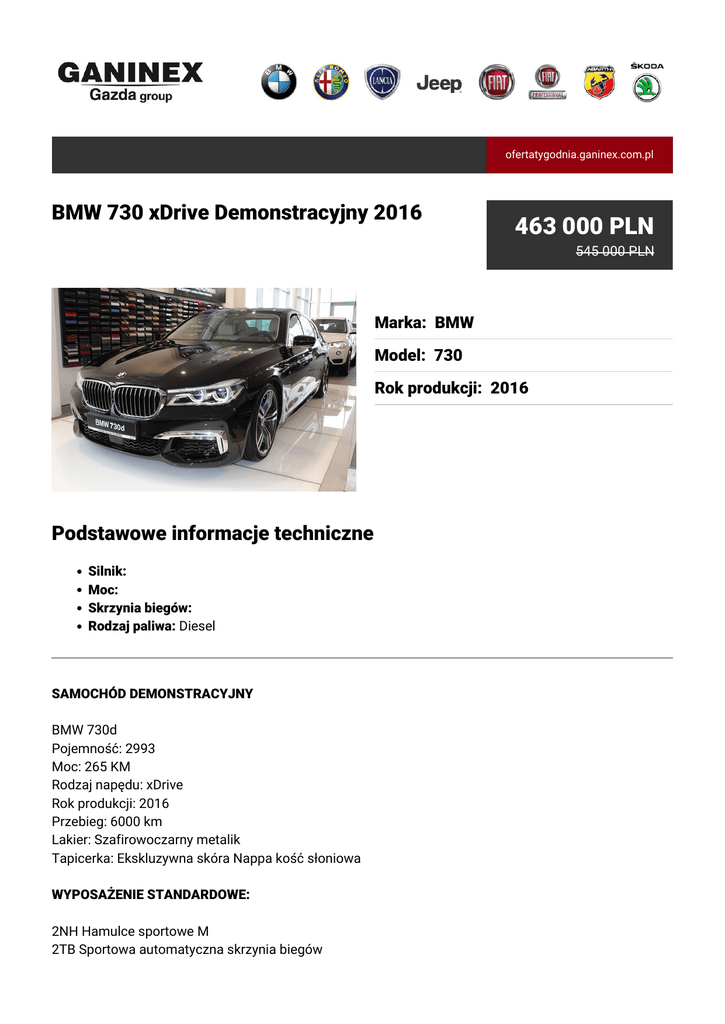 ofertatygodnia.ganinex.com.pl BMW 730 xDrive Demonstracyjny 2016 463 000 PLN 545 000 PLN Marka: BMW Model: 730 Rok produkcji: 2016 Podstawowe informacje techniczne Silnik: Moc: Skrzynia biegów: Rodzaj paliwa: Diesel SAMOCHÓD DEMONSTRACYJNY BMW 730d Pojemność: 2993 Moc: 265 KM Rodzaj napędu: xDrive Rok produkcji: 2016 Przebieg: 6000 km Lakier: Szafirowoczarny metalik Tapicerka: Ekskluzywna skóra Nappa kość słoniowa WYPOSAŻENIE STANDARDOWE: 2NH Hamulce sportowe M 2TB Sportowa automatyczna skrzynia biegów 323 System domykania drzwi 258 Opony z funkcją jazdy awaryjnej 2PA Śruby zabezpieczające 2VB Czujnik ciśnienia powietrza w oponach 302 System alarmowy 322 Dostęp komfortowy 3AG Kamera cofania 428 Trójkąt ostrzegawczy 465 System załadunkowy 4UR Podświetlenie ambientowe 502 Spryskiwacze reflektorów 5AC Asystent świateł drogowych 609 System nawigacyjny Professional 610 Wyświetlacz Head-Up 650 Odtwarzacz CD 6AC Intelligent Emergency Calling (Inteligentne Połączenie Alarmowe) 6AE Teleservices 6AK ConnectedDrive Services (Usługi ConnectedDrive) 6WB Wielofunkcyjny zestaw wskaźników na desce rozdzielczej, (10,25 cala) WYPOSAŻENIE OPCJONALNE: 3DS Wielofunkcyjny kluczyk samochodowy z wyświetlaczem LCD 420 Przyciemniana szyba tylna i tylne szyby boczne 453 Aktywna wentylacja foteli przednich 456 Komfortowe fotele przednie, regulowane elektryczne 4HB Pakiet ogrzewania Comfort, przód 4NB Klimatyzacja automatyczna z regulacją 4-strefową 4NM Pakiet Ambient Air 4UY Torba na narty i deski snowboardowe 5AT Systemy asystujące kierowcy Plus 5AZ Reflektory laserowe 5DL Kamera Surround View 5DP Asystent parkowania 5DV Zdalne parkowanie z pilota 688 Zestaw HiFi Harman Kardon Surround Sound 6U8 Obsługa za pomocą gestów 6U9 System sterowania BMW Touch Command 7NH Service Inclusive - 5 lat / 100 000 km 7S0 Pakiet sportowy M z wykończeniem wnętrza Pure Excellence 21H 20 calowe Obręcze kół ze stopu lekkiego Double Spoke 648 M, dwukolorowe 255 Kierownica sportowa, skórzana 4LM Listwy ozdobne drewno szlachetne Fineline czarne z metalicznym szlifem 5A1 Diodowe światła przeciwmgielne 715 Pakiet aerodynamiczny M ZD5 BMW ConnectedDrive Plus 6AM Real Time Traffic Information 6AN Concierge Services (Serwis informacyjny) 6AP Remote Services (Usługi Zdalne) 6AR Internet 6NW Telefonia komfortowa z ładowaniem bezprzewodowym Katowice Katowice (Škoda) Pszczyna Gliwice Gliwice (BMW) al. Roździeńskiego 170 tel. 32 351 27 50 al. Roździeńskiego 182 tel. 32 203 66 00 ul. Bielska 31c tel. 32 210 10 00 ul. Pszczyńska 306 tel. 32 230 17 30 ul. Pszczyńska 322 tel. 32 700 10 00