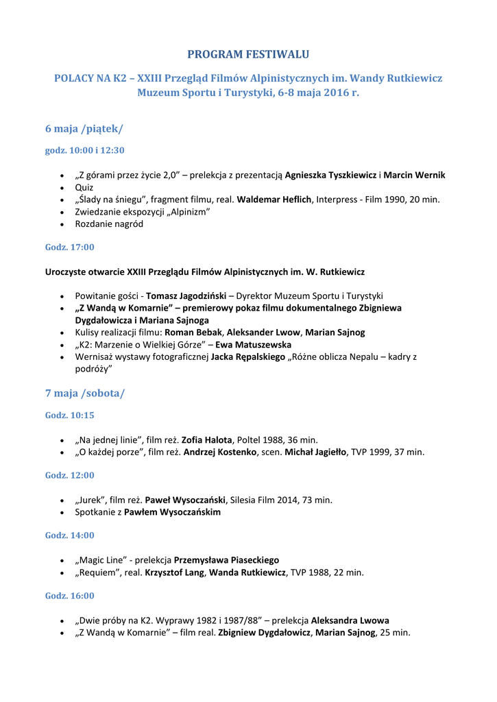 PROGRAM FESTIWALU POLACY NA K2 – XXIII Przegląd Filmów Alpinistycznych im. Wandy Rutkiewicz Muzeum Sportu i Turystyki, 6-8 maja 2016 r. 6 maja /piątek/ godz. 10:00 i 12:30 „Z górami przez życie 2,0” – prelekcja z prezentacją Agnieszka Tyszkiewicz i Marcin Wernik Quiz „Ślady na śniegu”, fragment filmu, real. Waldemar Heflich, Interpress - Film 1990, 20 min. Zwiedzanie ekspozycji „Alpinizm” Rozdanie nagród Godz. 17:00 Uroczyste otwarcie XXIII Przeglądu Filmów Alpinistycznych im. W. Rutkiewicz Powitanie gości - Tomasz Jagodziński – Dyrektor Muzeum Sportu i Turystyki „Z Wandą w Komarnie” – premierowy pokaz filmu dokumentalnego Zbigniewa Dygdałowicza i Mariana Sajnoga Kulisy realizacji filmu: Roman Bebak, Aleksander Lwow, Marian Sajnog „K2: Marzenie o Wielkiej Górze” – Ewa Matuszewska Wernisaż wystawy fotograficznej Jacka Rępalskiego „Różne oblicza Nepalu – kadry z podróży” 7 maja /sobota/ Godz. 10:15 „Na jednej linie”, film reż. Zofia Halota, Poltel 1988, 36 min. „O każdej porze”, film reż. Andrzej Kostenko, scen. Michał Jagiełło, TVP 1999, 37 min. Godz. 12:00 „Jurek”, film reż. Paweł Wysoczański, Silesia Film 2014, 73 min. Spotkanie z Pawłem Wysoczańskim Godz. 14:00 „Magic Line” - prelekcja Przemysława Piaseckiego „Requiem”, real. Krzysztof Lang, Wanda Rutkiewicz, TVP 1988, 22 min. Godz. 16:00 „Dwie próby na K2. Wyprawy 1982 i 1987/88” – prelekcja Aleksandra Lwowa „Z Wandą w Komarnie” – film real. Zbigniew Dygdałowicz, Marian Sajnog, 25 min. Godz. 18:00 „K2. Dotknąć nieba”, film reż. Eliza Kubarska, koprodukcja HBO Europe i Wajda Studio, 2015, 75 min. Spotkanie z Elizą Kubarską - prowadzi Aleksander Lwow „K2 1986. In memoriam Tadeusz Piotrowski” – Danuta Piotrowska 8 maja /niedziela/ Godz. 10:15 „Wszystko prawie o wyprawie”, real. Dariusz Załuski, 2006, 43 min. „Dwoje na K2”, reż. Dariusz Załuski, 2013, 46 min. Godz. 12:00 „Cerro Torre is calling” – prelekcja Marcina Wernika i Agnieszki Tyszkiewicz „Tagas Expedition 2015”, film, 20 min. – wprowadzenie: Marcin Wernik i Anna Lipińska Godz. 14:00 „Moje K2 – cztery wyprawy na drugi szczyt Ziemi” – prelekcja Leszka Cichego „200 metrów do nieba”, film real. Eugeniusz Chrobak, Interpress-Film, 1975, 25 min. „ Pokonać górę”, film reż. Grzegorz Zgliński, Studio Everest 1994, 25 min. Godz. 16:00 „Polska wyprawa na Magic Line 1986” – prelekcja Janusza Majera „Zdobywcy”, fragment filmu „K2”, real. Krzysztof Lang, Wanda Rutkiewicz, TVP 1987, 40 min. Godz. 18:00 „Przez lody Bajkału” – prelekcja Jana Faściszewskiego Przeglądowi towarzyszy wystawa fotograficzna JACKA RĘPALSKIEGO „RÓŻNE OBLICZA NEPALU – KADRY Z PODRÓŻY” oraz stoiska z: książkami i filmami górskimi wydawnictwa „ANNAPURNA” pismami „TATERNIK” i „RATOWNICTWO GÓRSKIE” pamiątkami oraz kuchnią nepalską Fundacji „ŚWIATŁO DLA HIMALAJÓW” i inne Organizatorzy zastrzegają sobie prawo do zmiany programu.