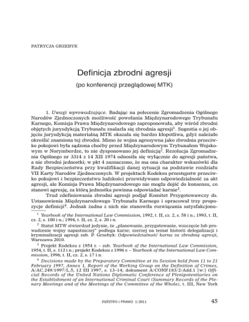 PATRYCJA GRZEBYK Definicja zbrodni agresji (po konferencji przeglądowej MTK) 1. Uwagi wprowadzające. Badając na polecenie Zgromadzenia Ogólnego Narodów Zjednoczonych możliwość powołania Międzynarodowego Trybunału Karnego, Komisja Prawa Międzynarodowego zaproponowała, aby wśród zbrodni objętych jurysdykcją Trybunału znalazła się zbrodnia agresji1. Sugestia o jej objęciu jurysdykcją materialną MTK okazała się bardzo kłopotliwa, gdyż należało określić znamiona tej zbrodni. Mimo że wojna agresywna jako zbrodnia przeciwko pokojowi była sądzona choćby przed Międzynarodowym Trybunałem Wojskowym w Norymberdze, to nie dysponowano jej definicją2. Rezolucja Zgromadzenia Ogólnego nr 3314 z 14 XII 1974 odnosiła się wyłącznie do agresji państwa, a nie zbrodni jednostki; w pkt 4 zaznaczono, że ma ona charakter wskazówki dla Rady Bezpieczeństwa przy kwalifikacji danej sytuacji na podstawie rozdziału VII Karty Narodów Zjednoczonych. W projektach Kodeksu przestępstw przeciwko pokojowi i bezpieczeństwu ludzkości przewidywano odpowiedzialność za akt agresji, ale Komisja Prawa Międzynarodowego nie mogła dojść do konsensu, co stanowi agresję, za którą jednostka powinna odpowiadać karnie3. Trud zdefiniowania zbrodni agresji podjął Komitet Przygotowawczy ds. Ustanowienia Międzynarodowego Trybunału Karnego i opracował trzy propozycje definicji4. Jednak żadna z nich nie stanowiła rozwiązania satysfakcjonu1 Yearbook of the International Law Commission, 1992, t. II, cz. 2, s. 58 i n.; 1993, t. II, cz. 2, s. 100 i n.; 1994, t. II, cz. 2, s. 20 i n. 2 Statut MTW stwierdzał jedynie, że „planowanie, przygotowanie, wszczęcie lub prowadzenie wojny napastniczej” podlega karze; szerzej na temat historii delegalizacji i kryminalizacji agresji zob. P. Grzebyk: Odpowiedzialność karna za zbrodnię agresji, Warszawa 2010. 3 Projekt Kodeksu z 1954 r. – zob. Yearbook of the International Law Commission, 1954, t. II, s. 112 i n.; projekt Kodeksu z 1996 r. – Yearbook of the International Law Commission, 1996, t. II, cz. 2, s. 17 i n. 4 Decisions made by the Preparatory Committee at its Session held from 11 to 21 February 1997, Annex 1, Report of the Working Group on the Definition of Crimes, A/AC.249/1997/L.5, 12 III 1997, s. 13–14; dokument A/CONF.183/2/Add.1 [w:] Official Records of the United Nations Diplomatic Conference of Plenipotentiaries on the Establishment of an International Criminal Court (Summary Records of the Plenary Meetings and of the Meetings of the Committee of the Whole), t. III, New York PAŃSTWO i PRAWO 1/2011 45 jącego wszystkich przedstawicieli państw uczestniczących w konferencji powołującej MTK. Przytłaczająca większość państw była początkowo przekonana, że zbrodnia agresji powinna być sądzona przez MTK. Jednak trudności w osiągnięciu konsensu co do jej definicji oraz w odpowiednim określeniu roli Rady Bezpieczeństwa w stosunku do tej zbrodni spowodowały, że część państw była skłonna zrezygnować z wymieniania agresji wśród zbrodni objętych jurysdykcją Trybunału5. Pod koniec konferencji walka toczyła się już nie o zdefiniowanie agresji, ale o utrzymanie zbrodni agresji w Statucie6. Ostatecznie w art. 5 ust. 1 Statutu MTK z 17 VII 1998 wymieniono zbrodnię agresji jako jedną z czterech najpoważniejszych zbrodni wagi międzynarodowej, nad którymi Trybunał może sprawować jurysdykcję. W art. 5 ust. 2 sprecyzowano jednak, że będzie ją sprawował w odniesieniu do zbrodni agresji dopiero wtedy, gdy zostanie przyjęte postanowienie definiujące tę zbrodnię, a także odpowiednie regulacje dotyczące warunków wykonywania jurysdykcji w odniesieniu do niej. Jednocześnie wskazano, że definicja powinna być zgodna z odpowiednimi postanowieniami Karty Narodów Zjednoczonych. Zadanie opracowania definicji oraz wskazania elementów zbrodni agresji i warunków wykonywania przez MTK jurysdykcji nad tą zbrodnią powierzono Komisji Przygotowawczej7. Powołała ona Specjalną Grupę Roboczą ds. Zbrodni Agresji, której udało się opracować definicję tej zbrodni (art. 8 bis)8. W świetle definicji, zbrodnią agresji jest „planowanie, przygotowywanie, rozpoczęcie i dokonanie, przez osobę mogącą efektywnie sprawować kontrolę lub kierującą politycznymi lub zbrojnymi działaniami państwa, aktu agresji, który swoim charakterem, wagą i skalą stanowi oczywiste naruszenie Karty Narodów Zjednoczonych”. Jak sprecyzowano, „akt agresji oznacza użycie siły zbrojnej przez państwo przeciwko suwerenności, terytorialnej integralności lub politycznej niepodległości innego państwa, lub w inny sposób niezgodny z Kartą Narodów Zjednoczonych”. Definicja ta została przyjęta przez konferencję przeglądową 11 VI 2010 r.9 Konferencja określiła również warunki wykonywania jurysdykcji nad zbrodnią agresji (art. 15 bis i ter), choć wydawało się, że w tej kwestii nie jest możliwe osiągnięcie konsensu. Zdecydowano, że MTK będzie mógł zająć się przypadkami agresji, do których dojdzie najwcześniej w rok po wejściu w życie poprawki do Statutu definiującej zbrodnię agresji, co nastąpi, gdy zostanie osiągnięty pułap 30 ratyfikacji lub przyjęć. Przyjęto również, że każda strona Statutu MTK może złożyć przed ratyfikacją lub przyjęciem deklarację, w której odrzuci możliwość sądzenia dokonanej przez siebie zbrodni agresji10. Państwo w każdym 2002, s. 14–15. 5 O. Solera: Defining the Crime of Aggression, London 2007, s. 43; J.H. Westra: International Law and the Use of Armed Force. The United Nations Charter and the Major Powers, London 2007, s. 363. 6 Tamże, s. 368. 7 Rezolucja F przyjęta przez Konferencję NZ ds. ustanowienia MTK – Dokument A/CONF.183/C.1/L.75 [w:] Official Records…, jw., t. I, s. 72–73. 8 ICC-ASP-8/20, s. 36 i n. 9 RC/Res 6. 10 Jest to tzw. deklaracja opt-out na wzór instrumentu przyjętego w art. 124 Statutu 46 PA