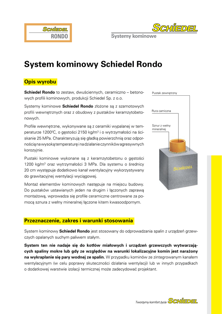 System kominowy Schiedel Rondo Opis wyrobu Schiedel Rondo to zestaw, dwuściennych, ceramiczno – betonowych profili kominowych, produkcji Schiedel Sp. z o.o. Systemy kominowe Schiedel Rondo złożone są z szamotowych profili wewnętrznych oraz z obudowy z pustaków keramzytobetonowych. Profile wewnętrzne, wykonywane są z ceramiki wypalanej w temperaturze 12000C, o gęstości 2150 kg/m3 i o wytrzymałości na ściskanie 25 MPa. Charakteryzują się gładką powierzchnią oraz odpornością na wysoką temperaturę i na działanie czynników agresywnych korozyjnie. Pustak zewnętrzny Rura camiczna Sznur z wełny mineralnej Pustaki kominowe wykonane są z keramzytobetonu o gęstości 1200 kg/m3 oraz wytrzymałości 3 MPa. Dla systemu o średnicy 20 cm występuje dodatkowo kanał wentylacyjny wykorzystywany do grawitacyjnej wentylacji wyciągowej. Montaż elementów kominowych następuje na miejscu budowy. Do pustaków ustawianych jeden na drugim i łączonych zaprawą montażową, wprowadza się profile ceramiczne centrowane za pomocą sznura z wełny mineralnej łączone kitem kwasoodpornym. Przeznaczenie, zakres i warunki stosowania System kominowy Schiedel Rondo jest stosowany do odprowadzania spalin z urządzeń grzewczych opalanych suchym paliwem stałym. System ten nie nadaje się do kotłów miałowych i urządzeń grzewczych wytwarzających spaliny mokre lub gdy ze względów na warunki lokalizacyjne komin jest narażony na wykraplanie się pary wodnej ze spalin. W przypadku kominów ze zintegrowanym kanałem wentylacyjnym (w celu poprawy skuteczności działania wentylacji) lub w innych przypadkach o dodatkowej warstwie izolacji termicznej może zadecydować projektant. System kominowy Schiedel Rondo klasyfikuje się: - zgodnie z normą EN 13063-1 - T400 N1 D 3 G 100 T400 – klasa temperaturowa N1 – klasa ciśnieniowa D – klasa odporności na kondensat 3 – klasa odporności na korozję G xx – odporność (G) na pożar sadzy i odległość od elementówz materiałów łatwopalnych Wysokość przewodu kominowego, mierzona od osi włączenia czopucha do wylotu nie powinna być mniejsza niż 4 m. Zewnętrzna powierzchnia przewodu kominowego powinna być otynkowana tynkiem cementowo-wapiennym o grubości 2 cm. Przewody kominowe wykonuje się jako konstrukcje samonośne, oddzielone od elementów nośnych budynku. Szczegółowe warunki budowy komina znajdują się w jego instrukcji montażu. Typ komina Max wysokość komina ponad dachem bez dodatkowego zbrojenia [m] Rondo 16 1,55 Rondo 18 1,55 Rondo 20 1,75 Rondo 20 + W 1,75 Tablica 1 Maksymalne wysokości komina powyżej dachu ponad najwyższe boczne podparcie dla kominów Rondo przedstawia tablica 1. Przyjęto w niej, iż komin jest obłożony tynkiem cementowo - wapiennym o grubości 2 cm. W przypadku innych typów trzonów kominowych należy wykonać obliczenia statyczne. Oznakowanie zgodnie z normą EN 13063-1 Kominy – systemy kominowe z glinianymi / ceramicznymi kanałami spalinowymi. Część 1: Wymagania i metody badań odporności na pożar sadzy 0989 Schiedel Sp. z o.o. ul. Wschodnia 24, PL 45-449 Opole 09 0989-CPD-0521 0989-CPD-0524 EN 13063-1 SCHIEDEL RONDO T400 N1 D 3 G100 Odporność ogniowa przy działaniu ognia od wewnątrz na zewnątrz............................................................. G (100) Szczelność / przeciek.............................................................................N1 Opory przepływu........................................................................ 0,0015 m Opór przenikania ciepła...................................................................... R16 Odporność na szoki termiczne.............................................................N1 Wytrzymałość na ściskanie rur ceramicznych...................≥ 10 MN/m2 Maksymalna wysokość kanału wewnętrznego.......................... ≥ 50 kN Wytrzymałość na ściskanie materiałów łączących: – kitu kwasoodpornego............................................................ ≥ M 10 – zaprawy montażowej............................................................ ≥ M 2,5 Wytrzymałość na ściskanie obudowy zewnętrzej.......................... 60 m Odporność na składniki chemiczne, korozję, szczelność, przecieki............................................................... D3 Odporność na przemienne zamarzanie i odmarzanie............. odporny Wykonanie Stożek Pierścień centrujący Montaż należy wykonywać zgodnie z instrukcją montażu oraz zasadami sztuki budowlanej i BHP. Płyta przykrywająca** Przed rozpoczęciem montażu musi być znane umiejscowienie drzwiczek wyczystkowych oraz wysokość osi przyłącza trójnika spalinowego. Jeśli z projektu wynika konieczność zastosowania dodatkowej (górnej) wyczystki kominowej zaleca się uzgodnić to wcześniej z rejonowym mistrzem kominiarskim. Omurówka*** Płyta wspornikowa** Sznur z wełny mineralnej Montaż komina powinien odbyć się na wcześniej przygotowanym fundamencie. Dalej montaż komina powinien odbyć się zgodnie z instrukcją montażu. W przypadku przerw w montażu komina należy zabezpieczyć jego wnętrze przed zawilgoceniem. Ceramiczna rura wewnętrzna Płyta czołowa* Przewody kominowe wykonuje się jako konstrukcje samonośne, oddzielone od elementów nośnych budynków. Trójnik spalinowy Pustak zewnętrzny Elementy ceramiczne łączone są specjalnym kitem kwasoodpornym. Trójnik wyczystkowy Pustaki zewnętrzne łączone są zaprawą cementowo – wapienną marki nie mniejszej niż 3,0 MPa. Pustak wypełniony zaprawą betonową Montaż przeprowadzać w temperaturach otoczenia od +5 do + 300C. * w pakiecie podstawowym ** wyposażenie dodatkowe *** cegła nie należy do asortymentu komina Program dostawczy Rodzaj komina średnica w cm wymiar zewnętrzny w cm (axb) waga kompl. w kg/mb numer artykułu 16 34 x 34 100 291.00-16 18 37 x 37 115 291.00-18 20 39 x 39 120 291.00-20 20+W (W=12 x 29) 56 x 39 155 293.