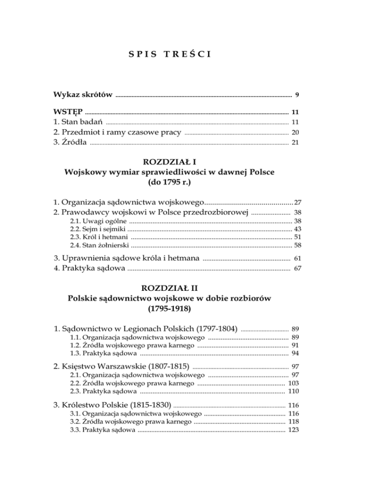SPIS TREŚCI Wykaz skrótów .............................................................................................................. 9 WSTĘP ............................................................................................................................... 1. Stan badań .................................................................................................................. 2. Przedmiot i ramy czasowe pracy ................................................................. 3. Źródła ............................................................................................................................ 11 11 20 21 ROZDZIAŁ I Wojskowy wymiar sprawiedliwości w dawnej Polsce (do 1795 r.) 1. Organizacja sądownictwa wojskowego............................................. 27 2. Prawodawcy wojskowi w Polsce przedrozbiorowej ...................... 38 2.1. Uwagi ogólne ........................................................................................... 38 2.2. Sejm i sejmiki ............................................................................................ 43 2.3. Król i hetmani .......................................................................................... 51 2.4. Stan żołnierski .......................................................................................... 58 3. Uprawnienia sądowe króla i hetmana ................................................. 61 4. Praktyka sądowa ........................................................................................... 67 ROZDZIAŁ II Polskie sądownictwo wojskowe w dobie rozbiorów (1795-1918) 1. Sądownictwo w Legionach Polskich (1797-1804) .............................. 89 1.1. Organizacja sądownictwa wojskowego ............................................. 89 1.2. Źródła wojskowego prawa karnego ................................................... 91 1.3. Praktyka sądowa ................................................................................... 94 2. Księstwo Warszawskie (1807-1815) ............................................................ 97 2.1. Organizacja sądownictwa wojskowego ............................................. 97 2.2. Źródła wojskowego prawa karnego ................................................. 103 2.3. Praktyka sądowa ................................................................................. 110 3. Królestwo Polskie (1815-1830) ...................................................................... 116 3.1. Organizacja sądownictwa wojskowego ................................................ 116 3.2. Źródła wojskowego prawa karnego ...................................................... 118 3.3. Praktyka sądowa ....................................................................................... 123 4. Powstanie listopadowe (1830-1831) .......................................................... 141 4.1. Organizacja sądownictwa wojskowego ........................................... 141 4.2. Źródła wojskowego prawa karnego ...................................................... 144 4.3. Praktyka sądowa ....................................................................................... 149 5. Powstanie styczniowe (1863-1864) ................................................................... 159 5.1. Organizacja sądownictwa wojskowego ................................................ 159 5.2. Źródła wojskowego prawa karnego ...................................................... 161 5.3. Praktyka sądowa ....................................................................................... 164 ROZDZIAŁ III Wojskowa służba sprawiedliwości w II Rzeczypospolitej (1918-1939) 1. Audytoriat Legionów Polskich, Polskiego Korpusu Posiłkowego i Polskiej Siły Zbrojnej (1915-1918) ........................... 170 1.1. Organizacja sądownictwa wojskowego …................ ..................... 170 1.2. Źródła wojskowego prawa karnego … ............................................... 174 1.3. Praktyka sądowa ......................................................................................... 179 2. Organizacja i funkcjonowanie audytoriatu w latach wojen 1918-1922 .………………………………………………... 181 2.1. Utworzenie kierowniczych władz służby sprawiedliwości .............. 2.2. Organizacja wojskowej służby sprawiedliwości ................................. 2.2.1. Sądownictwo ................................................................................... 2.2.2. Prokuratura ...................................................................................... 2.3. Źródła wojskowego prawa karnego ...................................................... 2.4. Wojna polsko-ukraińska (1918-1919) ..................................................... 2.5. Powstanie Wielkopolskie (1918-1919) ................................................... 2.6. Wojna polsko-sowiecka (1919-1921) ...................................................... 2.7. Trzecie powstanie śląskie (1921) ............................................................. 2.8. Litwa Środkowa (1920-1922) ................................................................... 181 187 187 208 210 216 218 224 230 239 3. Organizacja i działalność służby sprawiedliwości Polski międzywojennej .................................................................................. 240 3.1. Audytorzy II Rzeczypospolitej ................................................................ 240 3.2. Organizacja sądownictwa wojskowego na stopie pokojowej (1922–1939).................................................................................................... 246 3.3. Więziennictwo wojskowe ........................................................................ 254 4. Zwalczanie przestępczości w Wojsku Polskim (1922–1939) ........ 257 5. Oficerskie Sądy Honorowe .......................................................