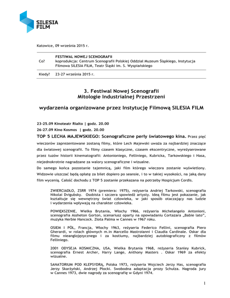 Katowice, 09 września 2015 r. Co? FESTIWAL NOWEJ SCENOGRAFII koprodukcja: Centrum Scenografii Polskiej Oddział Muzeum Śląskiego, Instytucja Filmowa SILESIA FILM, Teatr Śląski im. S. Wyspiańskiego Kiedy? 23-27 września 2015 r. 3. Festiwal Nowej Scenografii Mitologie Industrialnej Przestrzeni wydarzenia organizowane przez Instytucję Filmową SILESIA FILM 23-25.09 Kinoteatr Rialto | godz. 20.00 26-27.09 Kino Kosmos | godz. 20.00 TOP 5 LECHA MAJEWSKIEGO: Scenograficzne perły światowego kina. Przez pięć wieczorów zaprezentowane zostaną filmy, które Lech Majewski uważa za najbardziej znaczące dla światowej scenografii. To filmy czasem klasyczne, czasem ekscentryczne, wyreżyserowane przez tuzów historii kinematografii: Antonioniego, Felliniego, Kubricka, Tarkowskiego i Hasa, niejednokrotnie nagradzane za walory scenograficzne i wizualne. Do samego końca pozostanie tajemnicą, jaki film którego wieczora zostanie wyświetlony. Widzowie uiszczać będą opłatę za bilet dopiero po seansie, i to w takiej wysokości, na jaką dany film wycenią. Całość dochodu z TOP 5 zostanie przekazana na potrzeby Hospicjum Cordis. ZWIERCIADŁO, ZSRR 1974 (premiera: 1975), reżyseria Andriej Tarkowski, scenografia Nikolai Dvigubsky. Osobista i szczera spowiedź artysty. Ideą filmu jest pokazanie, jak kształtuje się wewnętrzny świat człowieka, w jaki sposób otaczający nas ludzie i wydarzenia wpływają na charakter człowieka. POWIĘKSZENIE, Wielka Brytania, Włochy 1966, reżyseria Michelangelo Antonioni, scenografia Assheton Gorton, scenariusz oparty na opowiadaniu Cortazara „Babie lato”, muzyka Herbie Hancock. Złota Palma w Cannes w 1967 roku. OSIEM I PÓŁ, Francja, Włochy 1963, reżyseria Federico Fellini, scenografia Piero Gherardi, w rolach głównych m.in Marcello Mastroianni i Claudia Cardinale. Oskar dla filmu nieanglojęzycznego i za kostiumy, najbardziej autobiograficzny z filmów Felliniego. 2001 ODYSEJA KOSMICZNA, USA, Wielka Brytania 1968, reżyseria Stanley Kubrick, scenografia Ernest Archer, Harry Lange, Anthony Masters . Oskar 1969 za efekty wizualne. SANATORIUM POD KLEPSYDRĄ, Polska 1973, reżyseria Wojciech Jerzy Has, scenografia Jerzy Skarżyński, Andrzej Płocki. Swobodna adaptacja prozy Schulza. Nagroda jury w Cannes 1973, dwie nagrody za scenografię w Gdyni 1974. 1 27.09 wyjazd spod Kina Kosmos | godz. 9.30 – 17.00 NA TROPIE FILMÓW Lecha Majewskiego. Wycieczka autobusowa szlakiem lokacji filmowych. Podróż tropem miejsc, w których filmy realizował Lech Majewski. Intrygująca wędrówka śladem artystycznej wyobraźni i plenerów, które stały się symboliczną scenografią m.in. dla „Młyna i krzyża”. Jak jawi się na co dzień sceneria miejsc magicznych, które odnajdujemy zamknięte w filmowych kadrach? Startujemy z Katowic – śląskiego „genius loci” filmów Majewskiego, a celem podróży są oddalone od szumu miasta miejsca pełne białych skał, kamiennych stodół i ruin zamków z piaskowca – Żarki i Olsztyn k. Częstochowy. rezerwacja miejsca [email protected] do 18.09.2015, decyduje kolejność zgłoszeń, do 21.09 wymagana jest przedpłata w wysokości 10 zł (płatności należy dokonać w kasie Kina Kosmos). 27.09 Galeria Katowicka | godz. 12.00 – 19.00 W FILMOWEJ SCENERII. Zabawy z green screenem, czyli rodzinna podróż do wnętrza filmu. Jak to jest stać się elementem filmowej scenografii? Na terenie Galerii Katowickiej stanie magiczne pudełko - green screen, który na co dzień wykorzystywany jest w telewizji i w filmie jako scenograficzne zaplecze produkcyjne. Tłem green screena stanie się tego dnia sceneria, jaką wybierzecie, by potem zaistnieć z nią na Wielkim Ekranie… i zabrać do domu fragment filmu. Do zabawy z green screenem zapraszamy całe rodziny – pamiętajcie tylko, aby nie ubrać się tego dnia na zielono! Wydarzenie jest bezpłatne. ____________________________ Instytucja Filmowa SILESIA FILM dzieli się pasją do filmu – prowadzi kina artystyczne, produkuje i koprodukuje filmy, zajmuje się ich dystrybucją, a także chroni filmowe dziedzictwo. Na terenie Województwa Śląskiego zarządza pięcioma kinami: Kinem Światowid, Kinem Kosmos Centrum Sztuki Filmowej oraz Kinoteatrem Rialto w Katowicach, Kinem Janosik w Żywcu a także Kinem Bałtyk w Raciborzu. Instytucja koprodukuje nagradzane na całym świecie filmy – w portfolio blisko czterdziestu realizacji dofinansowanych przez SILESIĘ FILM znajdują się m.in. „Jesteś Bogiem” Leszka Dawida, „Kongres” Ari Folmana, „Chce się żyć” Macieja Pieprzycy czy „Młyn i Krzyż” Lecha Majewskiego. Od sześciu lat Instytucja jest odpowiedzialna za przygotowanie jedynego w Europie festiwalu dedykowanego producentom filmowym, czyli Międzynarodowego Festiwalu Producentów Filmowych REGIOFUN. To dzięki niemu, a także za przyczyną działającej w strukturze Instytucji Śląskiej Komisji Filmowej wiele miejsc z terenu województwa śląskiego staje się filmowymi lokacjami i gości realizatorskie ekipy filmowe. Ewenementem na skalę kraju jest prowadzone przez SILESIĘ FILM jedyne w Polsce regionalne 2 archiwum filmowe – Filmoteka Śląska. Z jej zasobów bezpłatnie korzystają nie tylko mieszkańcy Województwa Śląskiego, ale i osoby spoza regionu. Działania filmoteki to także realizowane w szkołach i przedszkolach programy edukacyjne, specjalistyczne projekty służące podwyższaniu kompetencji filmoznawczych nauczycieli i instruktorów, czy w końcu Wydawnictwo Filmoteki Śląskiej publikujące książki przygotowane przez ludzi filmu dla pasjonatów kina. SILESIA FILM to instytucja kultury, która w każdym z sektorów - specjalistycznym, branżowym, popularyzatorskim i publicznym - realizuje zadania związane z opracowaniem i ochroną dziedzictwa kinematografii oraz rozwojem i upowszechnianiem kultury filmowej. www.silesiafilm.com SPOŁECZNE TOWARZYSTWO HOSPICJUM CORDIS Hospicjum domowe i stacjonarne dla doro