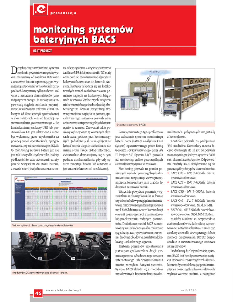 prezentacja monitoring systemów bateryjnych BACS AG IT PROJECT D ecydując się na wdrożenie systemu zasilania gwarantowanego zazwyczaj zaczynamy od zasilacza UPS wraz z zestawem baterii zapewniającym wymaganą autonomię. W niektórych przypadkach korzystamy tylko z siłowni DC wraz z zestawem akumulatorów jako magazynem energii. Te rozwiązania zapewniają ciągłość zasilania przynajmniej w założonym zakresie czasu, zależnym od ilości energii zgromadzonej w akumulatorach, oraz od kondycji systemu zasilania gwarantowanego. O ile kontrola stanu zasilaczy UPS lub prostowników DC jest ułatwiona i może być wykonana przez użytkownika za pomocą paneli operatorskich, oprogramowania, czy też kart sieciowych SNMP, to monitoring zestawu baterii już nie jest tak łatwy dla użytkownika. Należy podkreślić że czas autonomii zależy przede wszystkim od stanu baterii, a awaria baterii jest jednoznaczna z awa- rią całego systemu. Oczywiście zarówno zasilacze UPS, jak i prostowniki DC mają coraz bardziej zaawansowane algorytmy ładowania baterii oraz ich kontroli. Niestety, kontrola ta kończy się na krótkotrwałych testach rozładowania oraz pomiarze napięcia na końcowych biegunach zestawów. Żadne z tych urządzeń nie kontroluje bezpośrednio każdej z baterii/ogniw. Pomiar rezystancji wewnętrznej oraz napięcia za pomocą specjalistycznego miernika pozwala nam zobrazować stan poszczególnych baterii/ ogniw w szeregu. Zazwyczaj takie pomiary wykonywane są w rocznych okresach czasu podczas prac konserwacyjnych. Jednakże, jeśli w międzyczasie któraś bateria ulegnie uszkodzeniu nie mamy o tym fakcie żadnej informacji, ewentualnie dowiadujemy się o tym podczas zaniku zasilania, gdy cały system przestaje działać lub autonomia jest znacznie krótsza od oczekiwanej. Widok aplikacji. Stan poszczególnych akumulatorów Moduły BACS zamontowane na akumulatorach. 46 w w w. e l e k t r o . i n f o . p l Struktura systemu BACS Rozwiązaniem tego typu problemów jest wdrożenie systemu monitoringu baterii BACS (Battery Analysis & Care System) opatentowanego przez firmę Generex i dystrybuowanego przez AG IT Project S.C. System BACS pozwala na monitoring online poszczególnych akumulatorów/ogniw w zestawie. Monitoring pozwala na pomiar poniższych wartości poszczególnych akumulatorów: rezystancji wewnętrznej, napięcia, temperatury oraz prądów ładowania zestawów baterii. Wszystkie powyższe parametry wyświetlane są dla użytkownika w formie czytelnej tabeli w przeglądarce internetowej z możliwością informacji poprzez mail, SMS lub inny system komunikacji o awarii poszczególnych akumulatorów lub przekroczeniu zadanych parametrów. Dodatkowo moduł BACS zamontowany na uszkodzonym akumulatorze sygnalizuje awarię świeceniem czerwonej diody na obudowie, co ułatwia lokalizację uszkodzonego ogniwa. Historia pomiarów rejestrowana jest w pamięci kontrolera, dzięki czemu za pomocą wbudowanego serwera internetowego lub oprogramowania można zarządzać danymi systemu. System BACS składa się z modułów instalowanych bezpośrednio na aku- mulatorach, połączonych magistralą z kontrolerem. Kontroler pozwala na podłączenie 330 modułów. Kontrolery można łączyć równolegle do 10 szt. co pozwala na monitoring w jednym systemie 3300 szt. akumulatorów/ogniw. Odpowiednie moduły BACS dedykowane są do poszczególnych typów akumulatorów: BACS C20 – 12 V, 7–600 Ah, baterie kwasowo-ołowiowe; BACS C23 – 16 V, 7–600 Ah, baterie kwasowo-ołowiowe; BACS C30 – 6 V, 7–900 Ah, baterie kwasowo-ołowiowe; BACS C40 – 2 V, 7–5000 Ah, baterie kwasowo-ołowiowe, NiCd, NiMH; BACS C41 – 4 V, 7–900 Ah, baterie kwasowo-ołowiowe, NiCd, NiMH,Li-Ion. Moduły zasilane są bezpośrednio z akumulatorów na których są zamontowane, natomiast kontroler może być zasilany ze źródła zewnętrznego lub za pomocą przetwornika DC/DC bezpośrednio z monitorowanego zestawu akumulatorów. Dodatkową funkcjonalnością systemu BACS jest kondycjonowanie napięcia ładowania poszczególnych akumulatorów. System dokonując pomiaru napięć na poszczególnych akumulatorach wylicza wartość średnią, a następnie nr 6/2016 Zasilacze UPS Agpower CRT 1-10 kVA uniwersalna budowa Rack/Tower bypass mechaniczny zew./wew. maksymalny czas autonomii przy zastosowaniu baterii wewnątrz zasilacza - do 120 minut nr 6/2016 10-20 kVA zakres mocy od 1-500 kVA online – podwójna konwersja, wysoka sprawność w trybie pracy online - do 96%, wysoki współczynnik mocy - 0,9, konstrukcja oparte na tranzystorach trzeciej generacji, czytelny wyświetlacz LCD, dziennik zdarzeń, bypass mechaniczny, skalowalna konstrukcja - praca równoległa, szeroka gama interfejsów komunikacyjnych typu: SNMP, RS232, Dry contact, USB, rozszerzenie czasu autonomii poprzez moduły bateryjne, oprogramowanie dla wszystkich systemów operacyjnych, zastosowania: stacje robocze, datacenter, procesy przemysłowe, serwery, automatyka przemysłowa, sieci lokalne, telekomunikacja, urządzenia fiskalne i medyczne Zasilacze UPS Zasilacze UPS 10-500 kVA 15-150 kVA Generalny dystrybutor Osowno 23 21-345 Borki Agpower D T Combo Charakterystyka zasilaczy UPS Agpower: Agpower E TX AG IT Project s. c. Zasilacze UPS tel.: +48 81 440-39-17 e-mail: [email protected] www.agitproject.pl elastyczna konfiguracja faz - 3:1 i 1:1 możliwość wymiany modułów na „gorąco” Hotplug kolorowy wyświetlacz dotykowy 7” Agpower E TM Szczegóły oferty zasilaczy 1-3000 kVA na stronie www.agitproject.pl w w w. e l e k t r o . i n f o . p l 47 Efekt działania kondycjonowania napięcia ładowania (wartości napięć na poszczególnych akumulatorach przez załączeniem BACS oraz efekt działania kondycjonowania). Monitoring UPS Agpower poprzez system BACS Zasada działania kondycjonowania napięcia ładowania w modułach zainstalowanych na bateriach o wyższym napięciu niż wyliczona wartość średnia załącza stopniowo rezy
