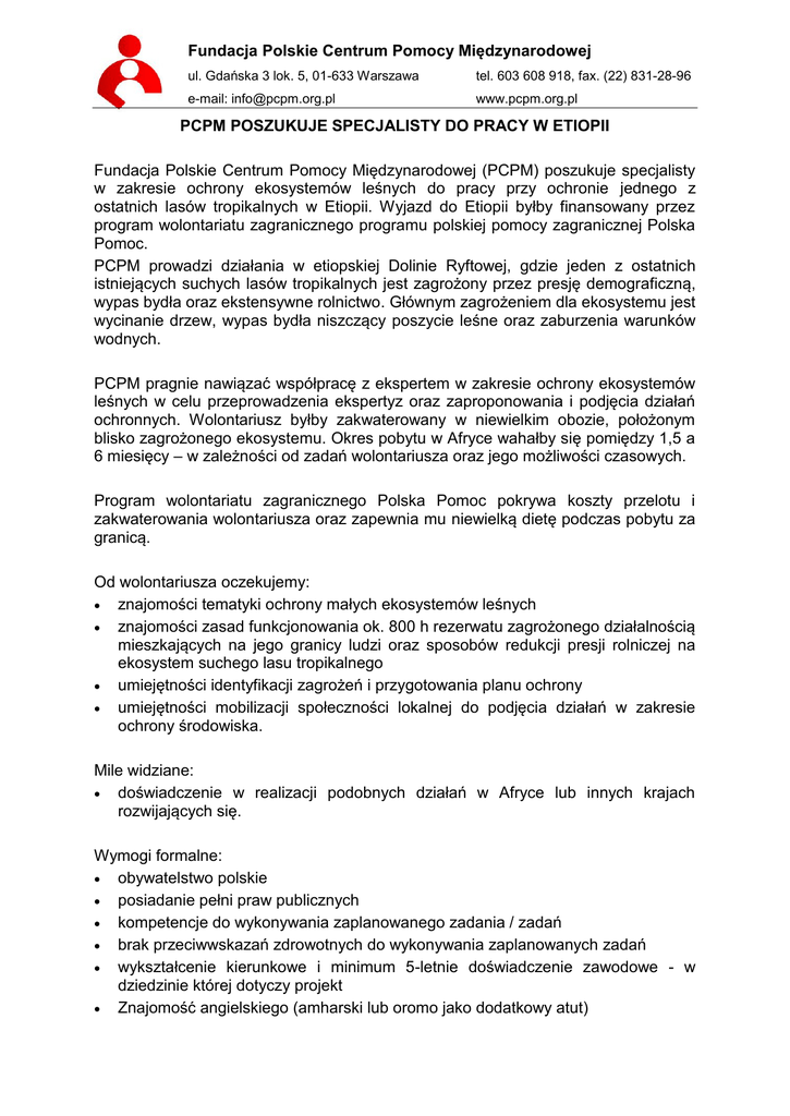 Fundacja Polskie Centrum Pomocy Międzynarodowej ul. Gdańska 3 lok. 5, 01-633 Warszawa tel. 603 608 918, fax. (22) 831-28-96 e-mail: [email protected] www.pcpm.org.pl PCPM POSZUKUJE SPECJALISTY DO PRACY W ETIOPII Fundacja Polskie Centrum Pomocy Międzynarodowej (PCPM) poszukuje specjalisty w zakresie ochrony ekosystemów leśnych do pracy przy ochronie jednego z ostatnich lasów tropikalnych w Etiopii. Wyjazd do Etiopii byłby finansowany przez program wolontariatu zagranicznego programu polskiej pomocy zagranicznej Polska Pomoc. PCPM prowadzi działania w etiopskiej Dolinie Ryftowej, gdzie jeden z ostatnich istniejących suchych lasów tropikalnych jest zagrożony przez presję demograficzną, wypas bydła oraz ekstensywne rolnictwo. Głównym zagrożeniem dla ekosystemu jest wycinanie drzew, wypas bydła niszczący poszycie leśne oraz zaburzenia warunków wodnych. PCPM pragnie nawiązać współpracę z ekspertem w zakresie ochrony ekosystemów leśnych w celu przeprowadzenia ekspertyz oraz zaproponowania i podjęcia działań ochronnych. Wolontariusz byłby zakwaterowany w niewielkim obozie, położonym blisko zagrożonego ekosystemu. Okres pobytu w Afryce wahałby się pomiędzy 1,5 a 6 miesięcy – w zależności od zadań wolontariusza oraz jego możliwości czasowych. Program wolontariatu zagranicznego Polska Pomoc pokrywa koszty przelotu i zakwaterowania wolontariusza oraz zapewnia mu niewielką dietę podczas pobytu za granicą. Od wolontariusza oczekujemy: znajomości tematyki ochrony małych ekosystemów leśnych znajomości zasad funkcjonowania ok. 800 h rezerwatu zagrożonego działalnością mieszkających na jego granicy ludzi oraz sposobów redukcji presji rolniczej na ekosystem suchego lasu tropikalnego umiejętności identyfikacji zagrożeń i przygotowania planu ochrony umiejętności mobilizacji społeczności lokalnej do podjęcia działań w zakresie ochrony środowiska. Mile widziane: doświadczenie w realizacji podobnych działań w Afryce lub innych krajach rozwijających się. Wymogi formalne: obywatelstwo polskie posiadanie pełni praw publicznych kompetencje do wykonywania zaplanowanego zadania / zadań brak przeciwwskazań zdrowotnych do wykonywania zaplanowanych zadań wykształcenie kierunkowe i minimum 5-letnie doświadczenie zawodowe - w dziedzinie której dotyczy projekt Znajomość angielskiego (amharski lub oromo jako dodatkowy atut) Osoby zainteresowane proszone są o przesłanie listu motywacyjnego oraz CV na adres [email protected] w terminie do 7 marca 2014 roku. www.pcpm.org.pl