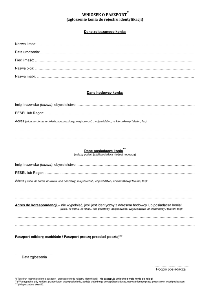 WNIOSEK O PASZPORT* (zgłoszenie konia do rejestru identyfikacji) Dane zgłaszanego konia: Nazwa i rasa:………………………………………….....................................................…………………………………… Data urodzenia:………………...………………………………………………………………………………………………… Płeć i maść: ………………………………………………………………………………………………………………………. Nazwa ojca: ………………………………………………………………………………………………………………………. Nazwa matki: …………………………………………………………..………………………………………………………… Dane hodowcy konia: Imię i nazwisko (nazwa), obywatelstwo: ………………………………….…………………………………………………… PESEL lub Regon: ………………………………………………………………………………………………………………. Adres (ulica, nr domu, nr lokalu, kod pocztowy, miejscowość , województwo, nr kierunkowy/ telefon, fax): ……………………………….………………………………………………………………………………………………..…… ……………………………………………………………………………………………………………………………………… Dane posiadacza konia** (należy podać, jeżeli posiadacz nie jest hodowcą) Imię i nazwisko (nazwa), obywatelstwo: …………………….………………………………………………………………… PESEL lub Regon: …………...………………………..………………………………………………………………………… Adres ( ulica, nr domu, nr lokalu, kod pocztowy, miejscowość, województwo, nr kierunkowy/ telefon, fax): …………………………….…………………………………………………………………………………………………..…… ……………………………………………………………………………………………………………………………………… Adres do korespondencji – nie wypełniać, jeśli jest identyczny z adresem hodowcy lub posiadacza konia! (ulica, nr domu, nr lokalu, kod pocztowy, miejscowość, województwo, nr kierunkowy / telefon, fax): ………………………………………………………….……………………………………………………………………..…… ……………………………………………………………………………………………………………………………………… Paszport odbiorę osobiście / Paszport proszę przesłać pocztą*** ……………..……………… Data zgłoszenia ……………..…………… Podpis posiadacza *) Ten druk jest wnioskiem o paszport i zgłoszeniem do rejestru identyfikacji - nie zastępuje wniosku o wpis konia do księgi. **) W przypadku, gdy koń jest przedmiotem współposiadania, podaje się jednego ze współposiadaczy, upoważnionego przez pozostałych współposiadaczy. ***) Niepotrzebne skreślić.