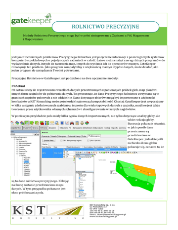 ROLNICTWO PRECYZYJNE Moduły Rolnictwa Precyzyjnego mogą byc w pełni zintegrowane z Zapisami z Pol, Magazynem i Mapowaniem Jednym z technicznych problemow Precyzyjnego Rolnictwa jest połączenie informacji z poszczegolnych systemow komputerow pokładowych o pojedynczych zadaniach w całosc. Łatwo mozna nabyc szereg roznych programow do wyswietlania danych, innych do tworzenia map, innych do wysłania ich do operatorow maszyn. GateKeeper rozwiązuje ten problem. Jako program kompatybilny z większoscią maszyn i typow danych, moze działac jako jeden program do zarządzania Twoimi potrzebami. Precyzyjne Rolnictwo w GateKeeper jest podzielone na dwa opcjonalne moduły: PRActual PR Actual słuzy do rejestrowania wszelkich danych przestrzennych z pobieranych probek gleb, map plonow i innych form czujnikow do pobierania danych. To gwarantuje, ze dane Precyzyjnego Rolnictwa utrzymane są w granicach zapisow polowych a nie oddzielnie. Dane dotyczące zbiorow mogą byc importowane z większosci kombajnow a KST Konsulting moze potwierdzic najnowszą kompatybilnosc. Chociaz GateKeeper jest wyposazony w kilka wstępnie zdefiniowanych szablonow importu dla wielu typowych danych z czujnika, mozliwe jest takze tworzenie przez uzytkownika własnych schematow i skonfigurowanie własnych nagłowkow. W ponizszym przykładzie pola miały kilka typow danych importowanych, nie tylko dotyczące analizy gleby, ale takze rodzaju gleby. Ilustracja pokazuje rowniez, w jaki sposob dane przestrzenne są przedstawiane w GateKeeper. Jednakze jesli niebieska ikona globu pokazuje się, oznacza to, ze są to dane rolnictwa precyzyjnego. Klikając na ikonę zostanie przedstawiona mapa danych. W tym przypadku pokazane jest okno probkowania pola. KST Konsulting Sp. z o.o. ul. Poznanska 13 63-004 Tulce Tel : 00 48 61 887 66 08 Fax: 00 48 61 887 66 09 Email: [email protected] www.kstkonsulting.com.pl GateKeeper zawiera rozne algorytmy dla prawidłowej prezentacji roznych typow danych. Istnieją narzędzia do filtrowania danych, ktore mogą byc przydatne przy zaburzonym przepływie informacji, na przykład niewłasciwy plon z działek spowodowany pracą kombajnow omijających słupy elektryczne na polu. PRTarget Celem PR Target jest dodanie elementow do Planu Pracy, tak aby Zadania z mapami docelowej aplikacji mozna przesyłac do pokładowych systemow i sterownikow maszyn. Szablony mogą byc konstruowane, aby utworzyc mapę aplikacji z jednego lub więcej zrodeł danych. W prostej formie moze byc stosowanie nawozow na podstawie probek gleby. Jednak narzędzia do tworzenia map docelowych mogą rowniez uwzględniac wiele innych czynnikow, tak aby stosowanie nawozow mogło rowniez zalezec od rodzaju gleby z okresu poprzednich plonow. Po Zmianie Dawki aplikacji plan jest eksportowany do maszyny a po zakonczeniu pracy moze byc importowany z powrotem do GateKeeper. GateKeeper rejestruje mapę rzeczywistych danych aplikacji Jesli, ze względu na błędy kalibracji na komputerze, rzeczywiste zastosowanie będzie inne od planu w GateKeeper mozemy za pomocą prostej metody ponownie przeliczyc dane mapy pasujące do rzeczywiscie zastosowanej ilosc według zapisow Magazynu. Tak więc, zarowno dane dotyczące przyjęcia na magazyn jak i danych plonow, moduł Precyzyjnego Rolnictwa zawsze dopasuje do ewidencji. KST Konsulting Sp. z o.o. ul. Poznanska 13 63-004 Tulce Tel : 00 48 61 887 66 08 Fax: 00 48 61 887 66 09 Email: [email protected] www.kstkonsulting.com.pl