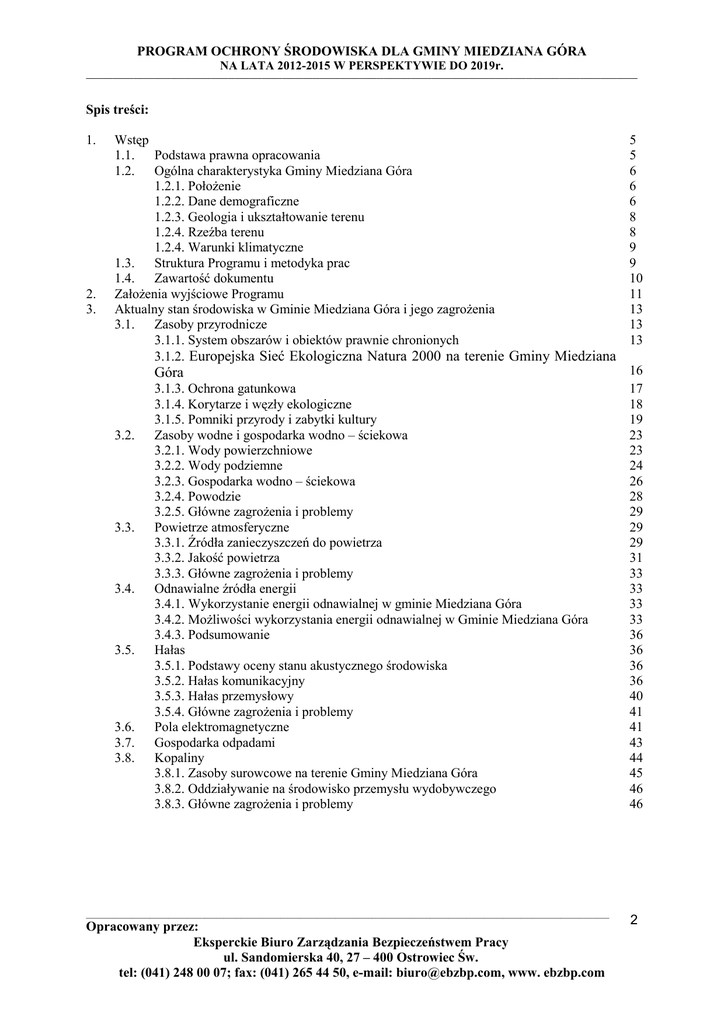 PROGRAM OCHRONY ŚRODOWISKA DLA GMINY MIEDZIANA GÓRA NA LATA 2012-2015 W PERSPEKTYWIE DO 2019r. ___________________________________________________________________________________________________________________________________________________________________ Spis treści: 1. 2. 3. Wstęp 1.1. Podstawa prawna opracowania 1.2. Ogólna charakterystyka Gminy Miedziana Góra 1.2.1. Położenie 1.2.2. Dane demograficzne 1.2.3. Geologia i ukształtowanie terenu 1.2.4. Rzeźba terenu 1.2.4. Warunki klimatyczne 1.3. Struktura Programu i metodyka prac 1.4. Zawartość dokumentu Założenia wyjściowe Programu Aktualny stan środowiska w Gminie Miedziana Góra i jego zagrożenia 3.1. Zasoby przyrodnicze 3.1.1. System obszarów i obiektów prawnie chronionych 3.1.2. Europejska Sieć Ekologiczna Natura 2000 na terenie Gminy Miedziana Góra 3.2. 3.3. 3.4. 3.5. 3.6. 3.7. 3.8. 3.1.3. Ochrona gatunkowa 3.1.4. Korytarze i węzły ekologiczne 3.1.5. Pomniki przyrody i zabytki kultury Zasoby wodne i gospodarka wodno – ściekowa 3.2.1. Wody powierzchniowe 3.2.2. Wody podziemne 3.2.3. Gospodarka wodno – ściekowa 3.2.4. Powodzie 3.2.5. Główne zagrożenia i problemy Powietrze atmosferyczne 3.3.1. Źródła zanieczyszczeń do powietrza 3.3.2. Jakość powietrza 3.3.3. Główne zagrożenia i problemy Odnawialne źródła energii 3.4.1. Wykorzystanie energii odnawialnej w gminie Miedziana Góra 3.4.2. Możliwości wykorzystania energii odnawialnej w Gminie Miedziana Góra 3.4.3. Podsumowanie Hałas 3.5.1. Podstawy oceny stanu akustycznego środowiska 3.5.2. Hałas komunikacyjny 3.5.3. Hałas przemysłowy 3.5.4. Główne zagrożenia i problemy Pola elektromagnetyczne Gospodarka odpadami Kopaliny 3.8.1. Zasoby surowcowe na terenie Gminy Miedziana Góra 3.8.2. Oddziaływanie na środowisko przemysłu wydobywczego 3.8.3. Główne zagrożenia i problemy ____________________________________________________________________________________________________________________________________________________________________________ Opracowany przez: Eksperckie Biuro Zarządzania Bezpieczeństwem Pracy ul. Sandomierska 40, 27 – 400 Ostrowiec Św. tel: (041) 248 00 07; fax: (041) 265 44 50, e-mail: [email protected], www. ebzbp.com 5 5 6 6 6 8 8 9 9 10 11 13 13 13 16 17 18 19 23 23 24 26 28 29 29 29 31 33 33 33 33 36 36 36 36 40 41 41 43 44 45 46 46 2 PROGRAM OCHRONY ŚRODOWISKA DLA GMINY MIEDZIANA GÓRA NA LATA 2012-2015 W PERSPEKTYWIE DO 2019r. ___________________________________________________________________________________________________________________________________________________________________ 3.9. 4. 5. 6. 7. 8. 9. Poważna awarie przemysłowe 3.9.1. Główne zagrożenia i problemy 3.10. Lasy 3.10.1. Zalesienia 3.10.2. Główne zagrożenia i problemy 3.11. Gleby 3.11.1. Typy gleb 3.11.2. Rolnicza przestrzeń produkcyjna 3.11.3. Zanieczyszczenia gleb 3.11.4. Zakwaszenie gleb 3.11.5. Erozja gleb 3.11.6. Tereny zdewastowane i zdegradowane 3.11.7. Główne zagrożenia i problemy 3.12. Edukacja ekologiczna Priorytety polityki ekologicznej Gminy Miedziana Góra 4.1. Kryteria wyboru priorytetów ekologicznych 4.2. Priorytety ekologiczne Strategia działań w zakresie ochrony środowiska do 2015r w perspektywie do 2019r. 5.1. Wprowadzenie 5.2. Ochrona zasobów naturalnych 5.2.1. Ochrona przyrody 5.2.2.Gospodarowanie zasobami geologicznymi 5.2.3. Ochrona i zrównoważony rozwój lasów 5.2.4. Ochrona powierzchni ziemi 5.2.5. Racjonalne gospodarowanie zasobami wody 5.3. Poprawa jakości środowiska i bezpieczeństwa ekologicznego 5.3.1. Jakość wód 5.3.2.Powietrze atmosferyczne 5.3.3.Odnawialne źródła energii 5.3.4. Oddziaływanie hałasu 5.3.5.Oddziaływanie pól elektromagnetych 5.3.6. Gospodarka odpadami 5.3.7. Poważne awarie 5.4. Kierunki działań systemowych 5.4.1. Edukacja ekologiczna 5.4.2. Aspekty ekologiczne w planowaniu przestrzennym Lista przedsięwzięć priorytetowych na lata 2012 - 2015 Zarządzanie programem Aspekty finansowe realizacji programu Wytyczne budowy i eksploatacji przydomowych oczyszczalni ścieków ____________________________________________________________________________________________________________________________________________________________________________ Opracowany przez: Eksperckie Biuro Zarządzania Bezpieczeństwem Pracy ul. Sandomierska 40, 27 – 400 Ostrowiec Św. tel: (041) 248 00 07; fax: (041) 265 44 50, e-mail: [email protected], www. ebzbp.com 46 47 47 48 48 48 48 49 49 50 50 50 51 51 53 53 53 54 54 54 54 55 55 55 55 56 56 56 56 57 57 57 58 59 59 59 60 61 62 63 3 PROGRAM OCHRONY ŚRODOWISKA DLA GMINY MIEDZIANA GÓRA NA LATA 2012-2015 W PERSPEKTYWIE DO 2019r. ___________________________________________________________________________________________________________________________________________________________________ Spis tabel: Tabela Nr 1 Tabela Nr 2 Tabela Nr 3 Tabela Nr 4 Tabela Nr 5 Tabela Nr 6 Tabela Nr 7 Tabela Nr 8 Tabela Nr 9 Tabela Nr 10 Tabela Nr 11 Tabela Nr 12 Tabela Nr 13 Stan ludności w Gminie Miedziana Góra. Wyniki badań jakości wody z punktów pobrań położonych na terenie gminy Miedziana Góra. Przydomowe oczyszczalnie ścieków na terenie Gminy Miedziana Góra (stan na 31.12.2010r). Wyniki badań jakości oczyszczonych ścieków. Źródła emisji zorganizowanej na terenie Gminy Miedziana Góra. Wynikowe klasy stref dla poszczególnych zanieczyszczeń 6 24 27 28 30 32 37 Infrastruktura drogowa na terenie Gminy Miedziana Góra. Tereny zagrożone hałasem zlokalizowane w sąsiedztwie analizowanego odcinka drogi krajowej Nr 74 objęte opracowaniem programu ochrony środowiska przed hałasem 38 Wykaz stacji BTS na terenie Gminy Miedziana Góra 42 Grunty pod lasami w poszczególnych obrębach ewidencyjnych 47 Struktura użytków rolnych według klas bonitacyjnych 49 Lista przedsięwzięć priorytetowych na lata 2012 - 2015 60 Wskaźniki monitoringu POŚ 61 Spis rysunków: Rysunek Nr 1 Rysunek Nr 2 Rysunek Nr 3 Poglądowa mapa Gminy Mi