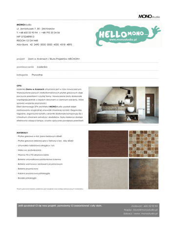 MONOstudio ul. Jemiołuszek 7, 30 - 244 Kraków T: +48 602 22 93 94 I +48 792 23 24 06 NIP 5732489813 REGON 121241448 Alior Bank 42 2490 0005 0000 4500 4318 4895 projekt Dom w Avenach / Biura Projektów ARCHON+ ________________________________________________________________________________________________________________________ pomieszczenie Łazienka ________________________________________________________________________________________________________________________ kategoria Prywatne ________________________________________________________________________________________________________________________ OPIS: Łazienka Domu w Avenach utrzymana jest w stylu nowoczesnym. Wykorzystanie jasnych wielkoformatowych płytek gresowych daje poczucie przestrzeni i czystej formy. Nowoczesne bryły doskonale współgrają jednak z ciepłym drewnem w ciemnym odcieniu, które sprawia wrażenie przytulności. Efekt domowego SPA architekci MONOstudio uzyskali dzięki zastosowaniu oryginalnej umywalki stawianej na blat. Eleganckie, łagodne, organiczne kształty ceramiki doskonale komponują się z chłodnym chromem armatury i dodatków. Szyku łazience dodaje efektowna wisząca lampa, a lustro optycznie powiększa przestrzeń. ________________________________________________________________________________________________________________________ MATERIAŁY: - Płytka gresowa w kol. jasno beżowym 60x60 - Płytka gresowa dekoracyjna z fakturą w kol. rdzy 60x60 - Umywalka nablatowa okrągła x 1szt. - Miska wc podwieszana - Wanna 70 x170 akrylowa biała - Bateria umywalkowa podtynkowa ścienna - Bateria wannowa z zestawem prysznicowym - Bateria prysznicowa - Kabina prysznicowa półokrągła - Brodzik półokrągły *Koszt wykonania łazienki uzależniony jest od jakości oraz rodzaju zastosowanych materiałów Jeśli spodobał Ci się nasz projekt, pomożemy Ci zaaranżować cały dom. Zadzwoń : 602 22 93 94 Napisz : [email protected] Zobacz : www. monostudio.pl www.monostudio.pl MONOstudio ul. Jemiołuszek 7, 30 - 244 Kraków T: +48 602 22 93 94 I +48 792 23 24 06 NIP 5732489813 REGON 121241448 Alior Bank 42 2490 0005 0000 4500 4318 4895 ARCHITEKT MONOstudio radzi: W swoim domu, a zwłaszcza w przestrzeniach najbardziej kosztogennych, takich jak np. łazienka, zastosuj stonowaną ponadczasową kolorystykę. Doskonale sprawdzą się kolory ziemi, czyli biel, brązy, szarości, beże, kremy, które świetnie komponują się z każdym drewnem, kamieniem, mozaiką, a także innymi żywymi kolorami. Jeśli masz jednak ochotę na intensywny kolor, użyj go w dodatkach. Czerwone ręczniki, czy turkusowe akcesoria łazienkowe możesz w łatwy sposób wymienić w momencie, kiedy zechcesz wprowadzić inny akcent. Konsekwencja w doborze materiałów daje najlepszy efekt. Prostota jest najbardziej elegancka, więc wybierz dwa max trzy wzory płytki do swojej łazienki. Postaw jednak na różnorodność formatów i struktur. Jeden dekor w postaci drewna, kamienia, płytki w kolorze lub strukturze skutecznie przyciągnie uwagę i nada przestrzeni szyku. ________________________________________________________________________________________________________________________ Jeśli spodobał Ci się nasz projekt, pomożemy Ci zaaranżować cały dom. Zadzwoń : 602 22 93 94 Napisz : [email protected] Zobacz : www. monostudio.pl www.monostudio.pl MONOstudio ul. Jemiołuszek 7, 30 - 244 Kraków T: +48 602 22 93 94 I +48 792 23 24 06 NIP 5732489813 REGON 121241448 Alior Bank 42 2490 0005 0000 4500 4318 4895 ________________________________________________________________________________________________________________________ Jeśli spodobał Ci się nasz projekt, pomożemy Ci zaaranżować cały dom. Zadzwoń : 602 22 93 94 Napisz : [email protected] Zobacz : www. monostudio.pl www.monostudio.pl MONOstudio ul. Jemiołuszek 7, 30 - 244 Kraków T: +48 602 22 93 94 I +48 792 23 24 06 NIP 5732489813 REGON 121241448 Alior Bank 42 2490 0005 0000 4500 4318 4895 Jeśli spodobał Ci się nasz projekt, pomożemy Ci zaaranżować cały dom. Zadzwoń : 602 22 93 94 Napisz : [email protected] Zobacz : www. monostudio.pl www.monostudio.pl MONOstudio ul. Jemiołuszek 7, 30 - 244 Kraków T: +48 602 22 93 94 I +48 792 23 24 06 NIP 5732489813 REGON 121241448 Alior Bank 42 2490 0005 0000 4500 4318 4895 Jeśli spodobał Ci się nasz projekt, pomożemy Ci zaaranżować cały dom. Zadzwoń : 602 22 93 94 Napisz : [email protected] Zobacz : www. monostudio.pl www.monostudio.pl MONOstudio ul. Jemiołuszek 7, 30 - 244 Kraków T: +48 602 22 93 94 I +48 792 23 24 06 NIP 5732489813 REGON 121241448 Alior Bank 42 2490 0005 0000 4500 4318 4895 KIM JESTEŚMY I CO ROBIMY? Krakowska pracownia MONOstudio to zespół młodych architektów, projektantów wnętrz, designerów. Pracujemy nad projektami w całej Polsce, podejmujemy też współpracę z klientami spoza granic. Specjalizujemy się w tworzeniu wnętrz prywatnych, czyli domów, mieszkań i apartamentów. Najlepsze efekty osiągamy pracując przy inwestycjach „pod klucz”, jednakże z każdym klientem indywidualnie określamy zakres opracowania projektowego i obowiązków, czego efektem jest propozycja uszyta na miarę. Tworzymy zatem kompleksowe projekty WNĘTRZ domów, apartamentów, mieszkań promując innowacyjne formy sztuki. Pracujemy także nad lokalami publicznymi, wymagającymi skomplikowanych założeń projektowych. W naszych aranżacjach WNĘTRZ hoteli, restauracji, pubów, salonów piękności, sklepów dążymy do stworzenia unikalnego klimatu ________________________________________________________________________________________________________________________ JAK PRACUJEMY? Współpracę z klientem rozpoczynamy od przeprowadzenia wywiadu na temat jego preferencji co do funkcjonalności i stylistyki wnętrza. Pozyskujemy także informacje, ile osób będzie mieszkało w danej inwestycji, jakie zwyczaje, upodobania i pasje mają użytkownicy, ponieważ one w istotny sposób 