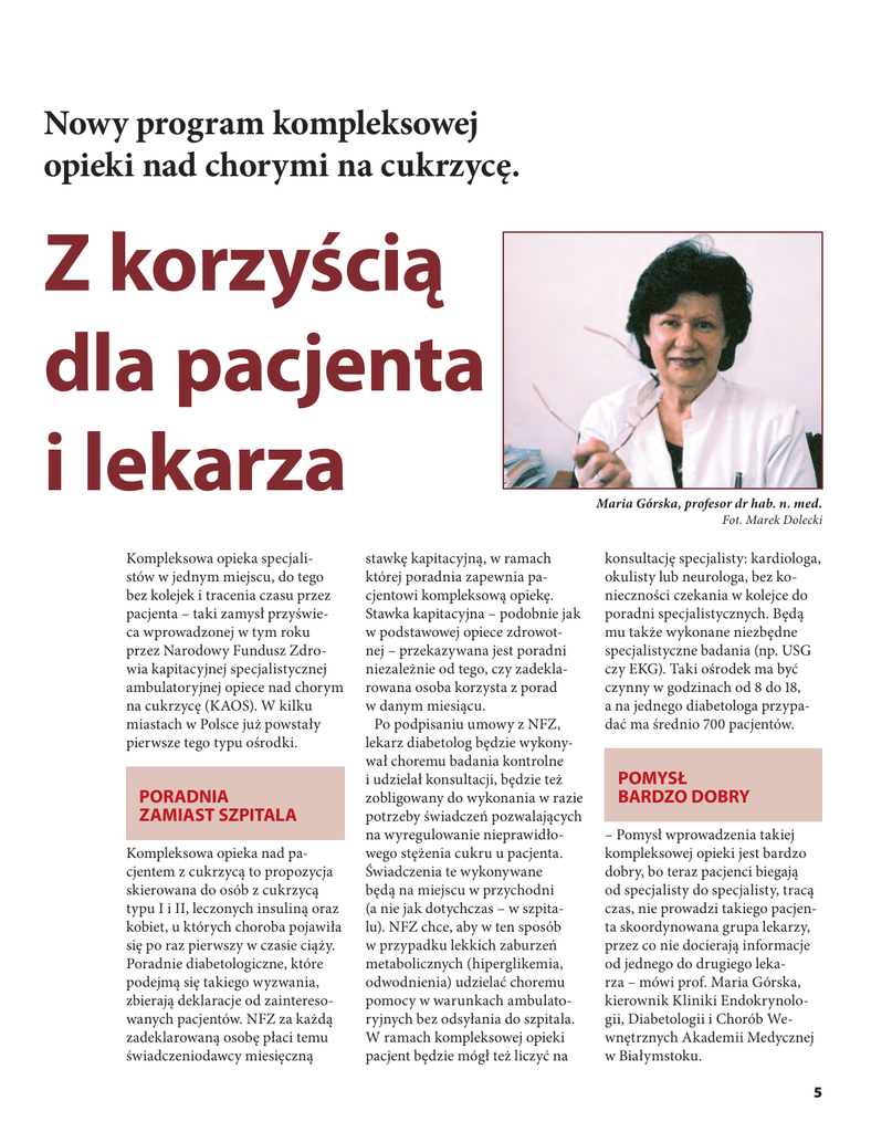 Nowy program kompleksowej opieki nad chorymi na cukrzycę. Z korzyścią dla pacjenta i lekarza Maria Górska, profesor dr hab. n. med. Fot. Marek Dolecki Kompleksowa opieka specjalistów w jednym miejscu, do tego bez kolejek i tracenia czasu przez pacjenta – taki zamysł przyświeca wprowadzonej w tym roku przez Narodowy Fundusz Zdrowia kapitacyjnej specjalistycznej ambulatoryjnej opiece nad chorym na cukrzycę (KAOS). W kilku miastach w Polsce już powstały pierwsze tego typu ośrodki. Poradnia zamiast szpitala Kompleksowa opieka nad pacjentem z cukrzycą to propozycja skierowana do osób z cukrzycą typu I i II, leczonych insuliną oraz kobiet, u których choroba pojawiła się po raz pierwszy w czasie ciąży. Poradnie diabetologiczne, które podejmą się takiego wyzwania, zbierają deklaracje od zainteresowanych pacjentów. NFZ za każdą zadeklarowaną osobę płaci temu świadczeniodawcy miesięczną stawkę kapitacyjną, w ramach której poradnia zapewnia pacjentowi kompleksową opiekę. Stawka kapitacyjna – podobnie jak w podstawowej opiece zdrowotnej – przekazywana jest poradni niezależnie od tego, czy zadeklarowana osoba korzysta z porad w danym miesiącu. Po podpisaniu umowy z NFZ, lekarz diabetolog będzie wykonywał choremu badania kontrolne i udzielał konsultacji, będzie też zobligowany do wykonania w razie potrzeby świadczeń pozwalających na wyregulowanie nieprawidłowego stężenia cukru u pacjenta. Świadczenia te wykonywane będą na miejscu w przychodni (a nie jak dotychczas – w szpitalu). NFZ chce, aby w ten sposób w przypadku lekkich zaburzeń metabolicznych (hiperglikemia, odwodnienia) udzielać choremu pomocy w warunkach ambulatoryjnych bez odsyłania do szpitala. W ramach kompleksowej opieki pacjent będzie mógł też liczyć na konsultację specjalisty: kardiologa, okulisty lub neurologa, bez konieczności czekania w kolejce do poradni specjalistycznych. Będą mu także wykonane niezbędne specjalistyczne badania (np. USG czy EKG). Taki ośrodek ma być czynny w godzinach od 8 do 18, a na jednego diabetologa przypadać ma średnio 700 pacjentów. Pomysł bardzo dobry – Pomysł wprowadzenia takiej kompleksowej opieki jest bardzo dobry, bo teraz pacjenci biegają od specjalisty do specjalisty, tracą czas, nie prowadzi takiego pacjenta skoordynowana grupa lekarzy, przez co nie docierają informacje od jednego do drugiego lekarza – mówi prof. Maria Górska, kierownik Kliniki Endokrynologii, Diabetologii i Chorób Wewnętrznych Akademii Medycznej w Białymstoku. 5 KAOS wszystko porządkuje w jednym miejscu, pacjent ma swojego lekarza prowadzącego, bardzo dobrego specjalistę i grupę innych specjalistów. Lekarz prowadzący przy każdej wizycie wykonywałby wszelkie badania kontrolne, przez co można by ściśle kontrolować rozwój ewentualnych powikłań cukrzycy. Mógłby również, w razie potrzeby, skorzystać z konsultacji neurologa, okulisty, chirurga naczyniowego, kardiologa. Byłaby też możliwość wykonania badań kardiologicznych, co jest bardzo ważne u pacjentów z cukrzycą, u których choroba niedokrwienna dość często przebiega skąpoobjawowo. Dlatego taka pełna współpraca z kardiologiem jest po prostu konieczna. Ponadto w ramach kompleksowej opieki pacjent miałby zapewnioną ocenę parametrów metabolicznych, czyli nie tylko wyrównania cukrzycy, ale również parametrów lipidowych czy ocenę funkcji nerek. Mało tego, taki ośrodek zajmujący się kompleksową opieką nad chorymi na cukrzycę, ma też być doskonale wyposażony, m.in. w najlepszy sprzęt do kontroli przepływu krwi w naczyniach, która byłaby doraźnie przeprowadzana przy każdej wizycie, sprzęt do oceny czucia, bardzo ważnej przy ocenie neuropatii, która jest bardzo trudno wykrywanym, ale częstym powikłaniem cukrzycy. – Badania te zapewniłyby ochronę i prewencję przy zapobieganiu powikłań cukrzycowych – mówi prof. Górska. – To wygodniejsze i dla pacjenta i dla lekarza. Edukacja i profilaktyka Prof. Maria Górska dodaje, że przy nowym ośrodku kompleksowej 6 opieki w Białymstoku mógłby też powstać gabinet stopy cukrzycowej. Takiej specjalistycznej placówki nie ma obecnie na Podlasiu. Zespół stopy cukrzycowej jest dość częstym powikłaniem źle wyrównanej cukrzycy, następstwem zmian w obwodowym układzie nerwowym (powodującym zanik czucia oraz zniekształcenia stóp), w naczyniach (efekt to miażdżyca i niedokrwienie) oraz infekcji – bakterii i grzybów. Niestety, często późne rozpoznanie i leczenie tego powikłania kończy się amputacją kończyny. Tymczasem odpowiednia profilaktyka sprawia, że aż 85 procentom amputacji można zapobiec. – Na razie to olbrzymi problem, bo wzrasta liczba amputacji kończyn z powodu powikłań cukrzycy – mówi prof. Maria Górska. – Niestety, propozycje finansowe NFZ na ten rok na leczenie stopy cukrzycowej są znacznie mniejsze, niż potrzebujemy. Już w ubiegłych latach wydawaliśmy na leczenie takiego pacjenta dwukrotnie więcej pieniędzy niż otrzymywaliśmy z funduszu, tracąc na każdej hospitalizacji. W tym roku propozycja jest jeszcze gorsza, nie ma teraz np. możliwości zlecenia badań angio CT, czyli oceny naczyń. Dlatego liczyłam na to, że przy okazji ośrodka KAOS mógłby powstać gabinet leczenia stopy cukrzycowej. Są już takie w Gdańsku, Warszawie, Krakowie i Poznaniu. Kompleksowa opieka nad pacjentem chorym na cukrzycę, objęłaby też jego edukację. – Edukacja ma olbrzymie znaczenie w cukrzycy – zaznacza prof. Maria Górska. – Brak świadomości choroby u takiego pacjenta, to klęska. Część chorych niestety neguje potrzebę edukacji i trzeba wielkiej pracy i wysiłku, aby przekonać ich do zmiany trybu życia. Niedawno mieliśmy trzech pacjentów w śpiączce cukrzycowej z powodu niewyrównania cukrzycy. Tak ostrych powikłań dawno nie mieliśmy, ale ci pacjenci nigdzie się nie zgłaszali, nic nie robili ze swoją chorobą. Dlateg