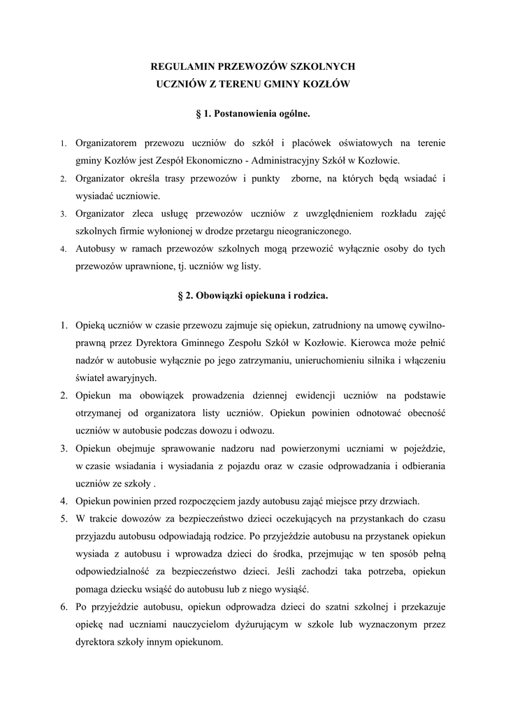 REGULAMIN PRZEWOZÓW SZKOLNYCH UCZNIÓW Z TERENU GMINY KOZŁÓW § 1. Postanowienia ogólne. 1. Organizatorem przewozu uczniów do szkół i placówek oświatowych na terenie gminy Kozłów jest Zespół Ekonomiczno - Administracyjny Szkół w Kozłowie. 2. Organizator określa trasy przewozów i punkty zborne, na których będą wsiadać i wysiadać uczniowie. 3. Organizator zleca usługę przewozów uczniów z uwzględnieniem rozkładu zajęć szkolnych firmie wyłonionej w drodze przetargu nieograniczonego. 4. Autobusy w ramach przewozów szkolnych mogą przewozić wyłącznie osoby do tych przewozów uprawnione, tj. uczniów wg listy. § 2. Obowiązki opiekuna i rodzica. 1. Opieką uczniów w czasie przewozu zajmuje się opiekun, zatrudniony na umowę cywilnoprawną przez Dyrektora Gminnego Zespołu Szkół w Kozłowie. Kierowca może pełnić nadzór w autobusie wyłącznie po jego zatrzymaniu, unieruchomieniu silnika i włączeniu świateł awaryjnych. 2. Opiekun ma obowiązek prowadzenia dziennej ewidencji uczniów na podstawie otrzymanej od organizatora listy uczniów. Opiekun powinien odnotować obecność uczniów w autobusie podczas dowozu i odwozu. 3. Opiekun obejmuje sprawowanie nadzoru nad powierzonymi uczniami w pojeździe, w czasie wsiadania i wysiadania z pojazdu oraz w czasie odprowadzania i odbierania uczniów ze szkoły . 4. Opiekun powinien przed rozpoczęciem jazdy autobusu zająć miejsce przy drzwiach. 5. W trakcie dowozów za bezpieczeństwo dzieci oczekujących na przystankach do czasu przyjazdu autobusu odpowiadają rodzice. Po przyjeździe autobusu na przystanek opiekun wysiada z autobusu i wprowadza dzieci do środka, przejmując w ten sposób pełną odpowiedzialność za bezpieczeństwo dzieci. Jeśli zachodzi taka potrzeba, opiekun pomaga dziecku wsiąść do autobusu lub z niego wysiąść. 6. Po przyjeździe autobusu, opiekun odprowadza dzieci do szatni szkolnej i przekazuje opiekę nad uczniami nauczycielom dyżurującym w szkole lub wyznaczonym przez dyrektora szkoły innym opiekunom. 7. Nauczyciel sprawujący opiekę nad uczniami jest obecny w czasie oczekiwania dzieci po zajęciach na przewóz. 8. Opiekun dowozu przed odwozem jest zobowiązany pójść do sekretariatu szkoły, odnotować i przeliczyć ilość uczniów do odwozu. 9. Opiekun przejmuje opiekę nad uczniami w szkole i odprowadza ich do autobusu. W autobusie przeprowadza kontrolę stanu liczbowego dzieci. Po dojechaniu do kolejnych przystanków opiekun pomaga wysiąść uczniom. Od tego momentu za bezpieczeństwo dzieci odpowiadają rodzice. 10. Rodzic dziecka uczęszczającego do przedszkola (oddziału przedszkolnego) lub szkoły podstawowej (kl. I-III) ma obowiązek odebrać dziecko z przystanku osobiście lub przez upoważnioną inną osobę. W przypadku braku osoby odbierającej dziecko z przystanku, opiekun ma prawo zawieźć ucznia do świetlicy szkolnej. Koszt kursu autobusu do świetlicy lub na komisariat również obciąża rodziców ucznia. 11. W przypadku awarii autobusu przewożącego dzieci opiekun wraz z kierowcą podejmuje działanie zmierzające w pierwszej kolejności do zapewnienia bezpieczeństwa uczniom. 12. Opiekun ma obowiązek informować dyrektora szkoły o wszelkich zachowaniach uczniów łamiących postanowienia niniejszego regulaminu. § 3. Obowiązki szkoły. Szkoła ma obowiązek: 1. Przekazać opiekunowi imienne wykazy uczniów dowożonych na poszczególnych trasach oraz na bieżąco aktualizować te wykazy. 2. Przekazywać przewoźnikowi lub opiekunowi, a jeśli jest to w danej sytuacji niemożliwe, przekazywać bezpośrednio kierowcy wszelkie informacje o zmianie godzin dowozu lub odwozu. 3. Zapoznać wszystkich uczniów objętych dowozem i ich rodziców lub opiekunów prawnych z treścią niniejszego regulaminu oraz potwierdzić ten fakt podpisanym oświadczniem. 4. Powiadomić rodzica o przypadkach naruszania niniejszego regulaminu przez ucznia. § 4. Obowiązki ucznia. 1. Uczeń ma obowiązek bezwzględnie wykonywać wszystkie polecenia kierowcy autobusu, osoby sprawującej opiekę w czasie przewozu. 2. Uczeń ma obowiązek przebywać w miejscu wyznaczonym przez nauczyciela w czasie oczekiwania na przewóz. 3. Uczeń ma obowiązek wsiadać i wysiadać drzwiami do tego wyznaczonymi, tylko w czasie postoju autobusu i w sposób nieuciążliwy dla innych osób. 4. Uczniowi nie wolno używać w autobusie słów wulgarnych i obraźliwych. 5. Uczniowi nie wolno przemieszczać się po autokarze w czasie jazdy, nie otwierać samowolnie okien w czasie podróży, nie wyrzucać jakichkolwiek przedmiotów z pojazdu, nie rzucać przedmiotami w pasażerów w pojeździe, hałasować, skakać lub w inny sposób utrudniać jazdę kierowcy lub współpasażerom. 6. Uczeń ma obowiązek zgłaszać natychmiastowo wszystkie nieprawidłowości związane z dowozem opiekunowi dowozu, wychowawcy klasy, wychowawcy świetlicy, pedagogowi szkolnemu lub dyrektorowi szkoły. 7. Za łamanie postanowień niniejszego regulaminu uczeń ponosi konsekwencje przewidziane w przepisach wewnątrzszkolnych tak jak za niestosowne zachowanie na terenie szkoły. 8. Straty spowodowane uszkodzeniem lub zniszczeniem wyposażenia autobusu przez ucznia, ponoszą jego rodzice (opiekunowie prawni). Za uszkodzenie lub zanieczyszczenie autobusu mogą być pobierane opłaty uwzględniające koszty obowiązujące w chwili powstania szkody. 9. W przypadku stwierdzenia przez kierowcę lub opiekuna popełnienia przestępstwa lub wykroczenia przez ucznia w trakcie dowozu szkolnego, kierowca i opiekun mają obowiązek przewieźć ucznia na komisariat policji celem zgłoszenia przestępstwa lub wykroczenia. § 5. Obowiązki przewoźnika Przewoźnik ma obowiązek: 1. Przestrzegać rozkładów jazdy ustalonych z Organizatorem dowozu, w szczególności godzin odjazdów autobusów z pierwszego przystanku. 2. Zabierać uczniów wyłącznie z wyznaczonych do tego celu punktów zbornych. 3. Zabierać uczniów niepełnospr