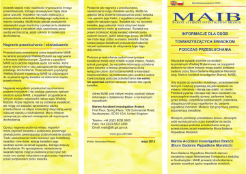 Aktualizacja przepisów: 2012 r świadek będzie mieć możliwość wyznaczenia innego przedstawiciela, którego obowiązywać będą takie same warunki. Inspektor nie może wykluczyć z przesłuchania adwokata działającego wyłącznie w imieniu świadka. MAIB może jednak powiadomić odpowiedni organ kontrolny o podejrzeniu działania niezgodnego z zasadami etyki zawodowej przez osobę wyznaczoną, jeżeli szkodzi to rzetelności dochodzenia. Nagranie przesłuchania i oświadczenie Przesłuchania prowadzone przez inspektorów MAIB na terenie jurysdykcji Wielkiej Brytanii są nagrywane w formacie elektronicznym. Zgodnie z zasadami MAIB są to jedyne nagrania audio lub wideo, które wolno wykonywać w celu zabezpieczenia rzetelnego przebiegu dochodzenia. Poza terenem jurysdykcji Wielkiej Brytanii inspektorzy MAIB są zobowiązani do uzyskania zgody świadka na dokonanie zapisu przesłuchania. Nagrania wszystkich przesłuchań są chronione prawem brytyjskim i nie zostają ujawniane żadnym osobom spoza MAIB, z wyjątkiem przypadków w których wydano odpowiedni nakaz sądu Wielkiej Brytanii. Kopie nagrania nie są udzielane świadkom, ale mogą oni zażądać sprawdzenia zapisu przesłuchania na etapie konsultacji dotyczącej wersji roboczej raportu z dochodzenia. Ma to miejsce zazwyczaj po czterech miesiącach od rozpoczęcia dochodzenia. Oprócz nagrania audio lub wideo, inspektor może poprosić świadka o podpisanie pisemnego oświadczenia zawierającego podsumowanie zeznań. Treść oświadczenia może zawierać opis kwalifikacji świadka i inne dane, relację świadka i jego osobiste opinie na temat wypadku, którego dotyczy dochodzenie. Po sporządzeniu oświadczenia świadek będzie mógł je osobiście przeczytać lub może ono zostać odczytane na głos przez inspektora przed podpisaniem przez świadka. Podobnie jak nagrania z przesłuchania, oświadczenia mają charakter poufny. MAIB nie ujawnia faktu złożenia oświadczenia przez świadka i nie ujawnia jego treści, z wyjątkiem przypadków objętych nakazem sądu. Świadek lub, na życzenie świadka, jego adwokat może otrzymać kopię oświadczenia i może ją zachować. Świadek ma prawo przekazać kopię swojego oświadczenia osobom trzecim, jeżeli sobie tego życzy, ale MAIB nie może tego zrobić w imieniu świadka. Osoba towarzysząca świadkowi podczas dochodzenia nie jest uprawniona do otrzymania kopii tego dokumentu. Podczas przesłuchania osoba towarzysząca świadkowi może robić notatki w jego imieniu. Należy jednak pamiętać, że wszystkie informacje udzielone przez świadka w trakcie przesłuchania służą wyłącznie celom dochodzenia MAIB w kwestiach bezpieczeństwa, są traktowane jako poufne i osobie towarzyszącej podczas przesłuchania nie wolno ich ujawniać żadnym stronom trzecim bez zgody świadka. Adres MAIB, pod którym można uzyskać dalsze informacje o działalności Biura i o konkretnych wypadkach: Marine Accident Investigation Branch First Floor, Spring Place, 105 Commercial Road, Southampton, SO15 1GH, United Kingdom INFORMACJE DLA OSÓB TOWARZYSZĄCYCH ŚWIADKOM PODCZAS PRZESŁUCHANIA Wszystkie wypadki morskie na wodach terytorialnych Wielkiej Brytanii oraz na brytyjskich statkach na całym świecie mogą zostać poddane badaniu przez Biuro Badania Wypadków Morskich (ang. Marine Accident Investigation Branch, MAIB). Gdy dojdzie do wypadku morskiego, przedstawiciele licznych instytucji pojawiają się jednocześnie na miejscu zdarzenia i starają się ustalić, co zaszło. Podobne pytania, różniące się nieco naciskiem na poszczególne aspekty sprawy, zadawane będą przez policję, urzędników państwowych, prawników, ubezpieczycieli oraz inspektorów ds. badania wypadków morskich. Może to być przyczyną pewnej dezorientacji świadków. Niniejsza publikacja przedstawia prawa i obowiązki osób wyznaczonych przez świadków na osoby towarzyszące podczas przesłuchania oraz po przesłuchaniu przez inspektorów Biura Badania Wypadków Morskich. Telefon: +44 (0)23 8039 5500 Faks: +44 (0)23 8023 2459 Email: [email protected] www.gov.uk/maib [Polish: Nominated Person] M A R I N E A C C I D E N T I N V E S T I G AT I O N B R A N C H maja 2015 Marine Accident Investigation Branch (Biuro Badania Wypadków Morskich) Biuro Badania Wypadków Morskich stanowi niezależny organ Ministerstwa Transportu z siedzibą w Southampton. MAIB prowadzi dochodzenia w sprawie wszelkich typów wypadków morskich, zarówno dotyczących statków jak i znajdujących się na nich ludzi. Podstawowym celem dochodzeń prowadzonych przez MAIB jest ustalenie przyczyn i okoliczności wypadków, co umożliwi uniknięcie podobnych zajść w przyszłości. W celu ochrony świadków MAIB obowiązują następujące zasady: zz prawdziwe zeznania udzielone MAIB podczas przesłuchania nie mogą zostać wykorzystane do obciążenia świadka (lub jego współmałżonka) przed sądem1; MAIB nie szuka winnych i nie jest instytucją kontrolną ani organem ścigania. Zadaniem MAIB jest ocena wypadków i incydentów, badanie przypadków mających szersze konsekwencje związane z bezpieczeństwem żeglugi oraz podawanie do wiadomości publicznej wyników dochodzenia. Ocena zajść i wyniki dochodzenia mogą prowadzić do wydania przez MAIB zaleceń dotyczących bezpieczeństwa odpowiednim osobom i organizacjom. W przeszłości odbiorcami zaleceń tego typu były: Agencja Morska i Straż Przybrzeżna (ang. Maritime and Coastguard Agency, MCA), towarzystwa klasyfikacyjne, właściciele/armatorzy statków, kierownictwo przystani i inne podmioty. W ramach dochodzenia, MAIB przesłuchuje świadków w celu poznania przebiegu i przyczyn wypadku. Oznacza to rozmowy z osobami pośrednio powiązanymi z zajściem, a także osobami biorącymi w nim udział lub naocznymi świadkami. Dla ułatwienia, wszystkie te osoby określane są jako świadkowie. Przesłuchania przez MAIB prowadzone są na mocy Ustawy o żegludze handlowej z 1995 r., ust