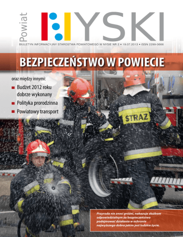 BIULETYN INFORMACYJNY STAROSTWA POWIATOWEGO W NYSIE NR 2 • 19.07.2013 • ISSN 2299-0666 Bezpieczeństwo w powiecie oraz między innymi: Foto: EBK Budżet 2012 roku dobrze wykonany Polityka prorodzinna Powiatowy transport Przyroda nie znosi próżni, nakazuje służbom odpowiedzialnym za bezpieczeństwo podejmować działania w ochronie najwyższego dobra jakim jest ludzkie życie. Powiat Nyski to ponad 141 tysięcy mieszkańców. Nad ich bezpieczeństwem czuwają służby takie jak Straż Pożarna, Policja, Stacja Sanitarno-Epidemiologiczna, Inspektorat Weterynarii, Inspektorat Nadzoru Budowlanego. Na czerwcowej sesji Rady Powiatu w Nysie służby te przedstawiały informacje z działalności za 2012 rok. Stwierdzono, że zarówno w ubiegłym roku jak i w tym, nie ma w powiecie nyskim epidemii, zagrożeń bezpieczeństwa, kataklizmów czy zagrażających naszemu bezpieczeństwu patologii. Nie jest jednak do końca tak różowo. Zmiana warunków atmosferycznych, a także zurbanizowanie coraz większych terenów doprowadza do lokalnych podtopień, występują też często burze i gradobicia. Po opanowaniu sytuacji powodziowych poprzez budowę zbiorników retencyjnych, czy podjęciu nowych inwestycji modernizacji zbiornika nyskiego i przebudowy koryta rzeki Nysy Kłodzkiej przychodzi nam zmagać się z kolejnymi wyzwaniami jakimi są nagłe, intensywne zjawiska atmosferyczne tj. burze, gradobicia, trąby powietrzne czy ulewy i ich skutki. Powiat Nyski w ubiegłym roku zgromadził sprzęt w pierwszym w Polsce magazynie przeciwpowodziowym, który utworzony został na terenie jednostki straży pożarnej w Paczkowie i wyposażony jest w łódź ratunkową, osuszacze, motopompy i inny sprzęt niezbędny właśnie przy podtopieniach czy po wichurach. Przyroda jak widać nie znosi próżni i nie pozwala na wytchnienie, nakazuje – szczególnie służbom odpowiedzialnym za bezpieczeństwo – podejmować działania w ochronie dobra najwyższego jakim jest ludzkie życie. Starosta Nyski Adam Fujarczuk w ubiegłym kwartale nawiązał kontakt i zaprosił do Nysy Prezes Związku Dużych Rodzin Joannę Krupską, która jest autorką Karty Dużych Rodzin i Starostę Wołomińskiego Piotra Uścińskiego, który w swym powiecie wdrożył już kartę. Powiat Nyski może być kolejnym miejscem wdrożenia karty i pomocy dla dużych rodzin. Koszty dopłat z powiatowego budżetu do ulg w ramach karty, jakie mogą otrzymywać rodziny to rząd 300-400 tys. zł rocznie a efekty dla rodzin są wymierne. Jak pokazują liczne przykłady oszczędność kilkuset złotych w domowym budżecie i możliwość aktywizacji rodziny poprzez udział w zajęciach na basenie, w teatrze, muzeum czy ulgi w zakupach opłacają się zarówno rodzinom jak i podmiotom świadczącym ulgi w ramach karty. W 2012 roku Powiat Nyski wykonał 43 zadania inwestycyjne za ponad 11 milionów złotych, powstało 15 km dróg, m.in. zmodernizowano most im. Tadeusz Kościuszki w Nysie, podniesiono jakość usług w oświacie. W dniu 6 czerwca br. radni Rady Powiatu w Nysie udzielili absolutorium Zarządowi Powiatu w Nysie. Projekty Powiatu Nyskiego i ich realizacje zyskują uznanie na szczeblu ministerialnym. Wprowadzony system powszechnych robót publicznych a także projekt budowy domów w systemie szkoleń osób bezrobotnych, projekty takie jak „Mały Wielki Nysanin”, „Mam dziecko – mam pracę” przestawiane były na forum Business Center Club i w kręgach ministerialnych. Uznanie dla naszych pomysłów cieszy, choć sen z powiek ściąga ciągle duże bezrobocie. Majowy spadek bezrobocia w powiecie nyskim był największy nie tylko w województwie opolskim ale i w Polsce jednak jest to podyktowane wdrożeniem nowego systemu robót publicznych, nie zaś powstaniem nowych miejsc pracy. W tym roku nowe miejsca pracy to głównie sektor handlu, nowe firmy powstałe z dotacji PUP to głównie zakłady kosmetyczne i usługi budowlane. Na łamach Biuletynu Wicestarosta Nyski Czesław Biłobran zapowiada zmiany linii i kursów powiatowego transportu. PKS Spółka z o.o. ma nowego prezesa Pana Arkadiusza Mintę. Do 2014 roku Powiat Nyski zobowiązany jest do wykonania powiatowego planu transportu. Trwają przygotowania do jego realizacji jak również opracowywane są projekty wymiany infrastruktury dworcowej. Powiat Nyski otrzymał propozycję przejęcia obiektów dworcowych od PKP. Jak mówi Wicestarosta Nyski warto, by Nysa miała wreszcie węzeł przesiadkowy z prawdziwego zdarzenia. W Biuletynie publikujemy kalendarz imprez kulturalnych do października br. Znajdziecie tu też Państwo dyżury aptek w powiecie i wykaz nieruchomości do zbycia. Ciekawy raport o turystyce przygotowany został przez Naczelnika Promocji, Sportu, Turystyki który mówi o zwiększającej się ilości turystów. Niestety jednak nie zmienia się znacząco infrastruktura turystyczna. W powiecie są zalegalizowane jedynie dwa kąpieliska, brak akwaparków czy usług odnowy biologicznej. Dziękujemy Państwu za liczny udział w imprezach zorganizowanych podczas Dni Herbowych. Święto Powiatu cieszy się coraz większą popularnością, frekwencja z roku na rok jest większa. Już dziś zapraszamy do składania propozycji do programu Święta Powiatu na 2014 roku. Czekamy na propozycje pod adresem: [email protected] Kontakt: Wydział Rolnictwa i Ochrony Środowiska tel. 77 408 50 20 Wydział Architektury i Budownictwa tel. 77 408 52 15 Wydział Promocji, Sportu i Turystyki tel. 77 408 50 45 Wydział Finansowo-Budżetowy tel. 77 408 50 35 Referat Zdrowia i Spraw Obywatelskich tel. 77 408 50 77 Wydział Edukacji i Kultury tel. 77 408 50 27 Referat Zarządzania Kryzysowego tel. 77 408 50 68 Wydział Komunikacji i Transportu tel. 77 408 50 63 Wydział Organizacyjno-Prawny tel. 77 408 50 39 Wydział Geodezji, Kartografii i Gospodarki Nieruchomościami tel. 77 408 52 00 Wydział Inwestycji i Programowania tel. 77 408 50 78 Redakcja: Starostwo Powiatowe w Nysie ul. Monius
