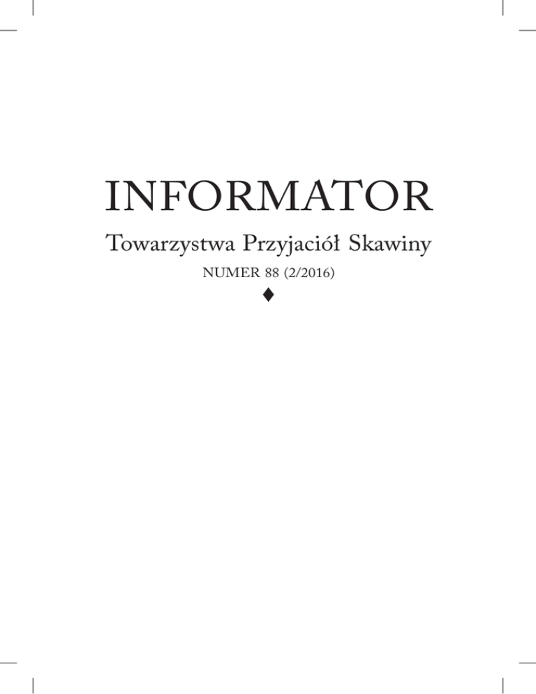 Informator Towarzystwa Przyjaciół Skawiny Numer 88 (2/2016) · —1— Wydawca: Towarzystwo Przyjaciół Skawiny ul. Żwirki i Wigury 23/16 32-050 Skawina Publikacja współfinansowana ze środków budżetu Miasta i Gminy Skawina Redakcja: Stanisław Grodecki, Anna Kudela, Ewa Tarnopolska, Mariusz Tarnopolski Redakcja „Informatora Towarzystwa Przyjaciół Skawiny” zastrzega sobie prawo do selekcji nadesłanych materiałów, a w razie potrzeby do ich korekty. Materiały do druku przyjmowane są wyłącznie w formie elektronicznej. Niezamówionych materiałów redakcja nie zwraca. Adiustacja: Magdalena Świerzowska ISSN 1234-0162 Nakład: 500 egz. Druk i łamanie: Wydawnictwo i Drukarnia TERCJA ul. Golikówka 77/1, 30-723 Kraków [email protected] Spis Treści Stanisław Grodecki, Walne Zgromadzenie Sprawozdawcze Towarzystwa Przyjaciół Skawiny za rok 2015 . . . . Eugeniusz Tatko, Żołnierskie i wojenne losy Edwarda Tatko Stanisław Grodecki, Relacja z Xiii imprezy środowiskowej „Zachowaj Trzeźwy Umysł” . . . . . . . . . Marcin Kania, Twórczość Henryka Różyckiego na łamach „Informatora TPS” . . . . . . . . . . . . Mariusz Tarnopolski, Ruszamy „Z pasją do życia”! . . Monika Fliszewska, Dorośli dzieciom . . . . . . Anna Kudela, Skawiniacy w siedmiomilowych Butach: Feliks Pukło, Jan Gigoń . . . . . . . . . . . Stanisław Grodecki, W służbie mieszkańcom Skawiny . . Władysław Zieliński, Wykrzywianie się do Muz . . . . Stanisława Szczepaniak, Maria Gruca — malowane życie Joanna Cholewa, Finał Akcji Charytatywnej „Gramy dla Kariny” . . . . . . . . . . . . . . Włodzimierz Galaciński, Oddając krew — darujesz życie Włodzimierz Galaciński, Konkurs wiedzy o honorowym krwiodawstwie . . . . . . . . . . . . . Mariusz Tarnopolski (zgromadził), Pierwsza praca osoby niepełnosprawnej . . . . . . . . . . . . . Małgorzata Kopeć, Skawina na dożynkach po słowackiej stronie . . . . . . . . . . . . . . . . Nasze sprawy . . . . . . . . . . . . . . . . 4 13 19 21 24 27 29 33 43 60 63 68 70 73 75 77 Stanisław Grodecki WALNE ZGROMADZENIE SPRAWOZDAWCZE TOWARZYSTWA PRZYJACIÓŁ SKAWINY ZA ROK 2015*1 W dniu 6 czerwca 2016 r. w skawińskim „Sokole” odbyło się kolejne Walne Zgromadzenie Sprawozdawcze naszego Towarzystwa. Po otwarciu Zgromadzenia przez Przewodniczącego Zarządu uczestnicy chwilą ciszy uczcili pamięć zmarłych w ostatnim roku, wieloletnich członków TPS: Antoniny Pajączkowskiej, Józefa Motyla i Jana Prochwicza. Następnie Przewodniczący Zarządu TPS przedstawił propozycję Zarządu, aby Walnemu Zgromadzeniu w tym roku przewodniczyła Jadwiga Raczyńska, co zostało przyjęte jednogłośnie. Na sekretarza został powołany Michał Grzeszczuk, a w skład Komisji Uchwał i Wniosków tradycyjnie weszły: Anna Kudela i Krystyna Droździewicz. Po przyjęciu regulaminu i porządku obrad przystąpiono do realizacji poszczególnych punktów programu. Kolejno przedstawiono sprawozdanie Zarządu TPS za rok 2015 (sprawozdanie to zamieszczone jest w całości w bieżącym numerze „Informatora”) oraz sprawozda* Wszystkie zdjęcia z Walnego Zgromadzenia Sprawozdawczego wykonał Mariusz Tarnopolski. 1 Uczestnicy Zgromadzenia — członkowie TPS —4— nie finansowe za rok 2015. Ewa Tarnopolska przedstawiła sprawozdanie ze współpracy ze skawińskimi placówkami oświatowymi, a Agata Lasek — sprawozdanie z działalności Koła Robótek Ręcznych „Razemkowo”. Następnie Alicja Płonka — przewodnicząca Komisji Rewizyjnej — przedstawiła sprawozdanie Komisji za rok 2015, a Halina Lech — sprawozdanie Sądu Koleżeńskiego. W czasie krótkiej dyskusji uczestnicy Zgromadzenia odnieśli się do odczytanych sprawozdań. W dalszej kolejności przewodnicząca Zgromadzenia Jadwiga Raczyńska przeprowadziła głosowanie nad wnioskiem Komisji Rewizyjnej o udzielenie Zarządowi TPS absolutorium za rok 2015. W głosowaniu wzięło udział 44 członków TPS. 43 głosami udzielono absolutorium. Tylko jedna osoba wstrzymała się od głosu. Po udzieleniu absolutorium Przewodniczący Zarządu przedstawił plan pracy oraz plan finansowy na rok 2016, które zostały zatwierdzone przez Walne Zgromadzenie. W trakcie obrad Zarząd TPS przestawił projekt uchwały w sprawie nadania tytułu „Zasłużonego Członka Towarzystwa Przyjaciół Skawiny” Ewie Tarnopolskiej i Czesławie Kopeć na podstawie § 11 pkt 3 statutu Towarzystwa. W uzasadnieniu tej decyzji podkreślono niemal 30-letnie członkostwo w TPS obydwu kandydatek, a także ich wieloletnią działalność we władzach naszego Towarzystwa. Propozycja ta została przyjęta z aplauzem i jednogłośnie podjęto uchwałę nadającą tytuł „Zasłużonego Członka Towarzystwa Przyjaciół Skawiny”. Ewa Podziękowania dla Bolesława Jamroza za działalność na rzecz TPS —5— Tytuł „Zasłużonego Członka TPS” otrzymały Ewa Tarnopolska i Czesława Kopeć Tarnopolska i Czesława Kopeć otrzymały z tej okazji okolicznościowy dyplom, symboliczny upominek oraz kwiaty. Zarząd TPS podziękował również Bolesławowi Jamrozowi za aktywną postawę i działalność na rzecz naszego Towarzystwa, wręczając mu okolicznościowy dyplom i symboliczny upominek. Zarząd TPS przedstawił Komisji Uchwał i Wniosków projekt nowego regulaminu dotyczącego organizacji kwest na renowację zabytkowych nagrobków na skawińskich cmentarzach. Projekt został przyjęty jednogłośnie. W końcowej części Walnego Zgromadzenia odczytano protokół przygotowany przez Komisję Uchwał i Wniosków, który także przyjęto jednogłośnie. —6— SPRAWOZDANIE ZARZĄDU TOWARZYSTWA PRZYJACIÓŁ SKAWINY ZA ROK 2015 Nasze Towarzystwo na dzień 31 grudnia 2015 r. liczyło 122 członków zwyczajnych, jednego członka honorowego oraz jednego członka wspierającego, którym jest Miasto i Gmina Skawina. To w głównej mierze dzięki składce członka wspierającego Towarzystwo posiada środki finansowe na prowadzen