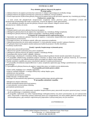 INSTRUKCJA BHP Przy obsłudze gilotyny biurowej do papieru Wymogi ogólne 1. Gilotyna biurowa do papieru powinna być ustawiona w miejscu zapewniającym swobodny dostęp. 2. Gilotyna biurowa do papieru powinna być ustawiona na stabilnym, równym podłożu. 3. Przed rozpoczęciem użytkowania gilotyny biurowej do papieru pracownik powinien zapoznać się z instrukcją jej obsługi. Podstawowe zasady bhp − w razie awarii lub jakiejkolwiek niesprawności urządzenia należy przerwać pracę, powiadomić o awarii lub niesprawności przełożonego lub osoby wyznaczone, wezwać do naprawy osoby upoważnione; − w celu uniknięcia dostania się pod nóż gilotyny luźnych części ubrania i długich włosów należy utrzymywać je z daleka od ostrza. Czynności zabronione Zabrania się: 1. Wkładać palców pod ostrze gilotyny biurowej do papieru. 2. Obsługiwać gilotynę biurową do papieru bez zapoznania się z instrukcją obsługi urządzenia. 3. Obsługiwać gilotynę biurową do papieru niezgodnie z instrukcją obsługi urządzenia. Czynności do wykonania przed rozpoczęciem pracy 1. Sprawdzić stan techniczny gilotyny biurowej do papieru, a zauważone nieprawidłowości natychmiast zgłosić swojemu bezpośredniemu przełożonemu. 2. Przystąpić do pracy, po usunięciu usterek, tylko przy sprawnym urządzeniu. 3. Materiał przeznaczony do ciecia należy przejrzeć i w razie potrzeby usunąć zszywki i spinacze biurowe. 4. W gilotynie biurowej do papieru można umieszczać kartki do pocięcia w liczbie określonej w instrukcji użytkowania. Zasady i sposoby bezpiecznego wykonania pracy W czasie pracy pracownik powinien: 1. Obserwować sposób wykonania pracy przez urządzenie. 2. Obsługiwać gilotynę biurową do papieru zgodnie z instrukcją obsługi. 3. Systematycznie usuwać ścinki i odpadki z gilotyny. 4. Przestrzegać, określonych w instrukcji obsługi, dopuszczalnych grubości (liczby kartek) materiałów do pocięcia. 5. W przypadku zablokowania urządzenia poprzez włożenie za dużej liczby kartek do gilotyny biurowej, do wykonania czynności związanych z jej odblokowaniem należy przystąpić po zdjęciu ostrza tnącego. 6. Każdy zaistniały wypadek przy pracy natychmiast zgłaszać swojemu przełożonemu. 7. W przypadku stwierdzenia nieprawidłowości w pracy urządzenia zaprzestać jego obsługi i poinformować o tym swojego przełożonego. 8. Uporządkować gilotynę biurową do papieru i stanowisko pracy ze ścinków po jej zakończeniu. W przypadku powstania pożaru należy - ostrzec osoby znajdujące się w obrębie zagrożenia, - wyłączyć zasilanie budynku w energię elektryczną i odciąć dopływ gazu, - zaalarmować straż pożarną, - powiadomić przełożonych o pożarze, - podjąć decyzję o ewakuacji ludzi, - przystąpić do prowadzenia akcji gaśniczej za pomocą podręcznego sprzętu gaśniczego. W przypadku zaistnienia wypadku - zabezpieczyć miejsce zdarzenia, - udzielić poszkodowanemu pierwszej pomocy, - w razie potrzeby wezwać pomoc lekarską, - powiadomić przełożonych. Uwaga 1. W razie wątpliwości co do zachowania warunków bezpieczeństwa pracy pracownik ma prawo przerwać pracę i zwrócić się do przełożonego o wyjaśnienie sytuacji. 2. W przypadku znalezienia się wobec bezpośredniego niebezpieczeństwa ma prawo powstrzymać się od wykonywania pracy. Pracownik w omawianej sytuacji zachowuje prawo do wynagrodzenia, nie może jednak odmówić podjęcia innej, równorzędnej pracy, gdy usunięcie zagrożenia przy poprzednio wykonywanej pracy nie jest możliwe. ZATWIERDZAM …………………………. AGAPOL Zakład Usługowo Oświatowy s.c. Agnieszka Krupa i Piotr Krupa 35-114 Rzeszów, ul. J. Malczewskiego 13/27 Tel. 608 424 388, 506 090 533