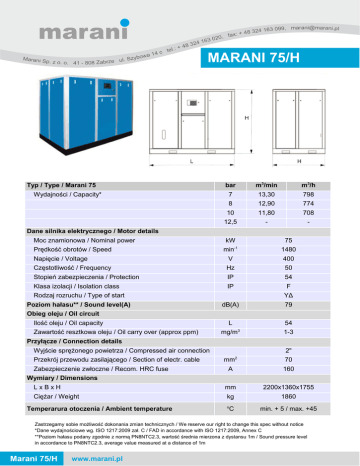 MARANI 75/H Typ / Type / Marani 75 Wydajności / Capacity* bar m3/min m3/h 7 13,30 798 8 12,90 774 10 11,80 708 12,5 - - Dane silnika elektrycznego / Motor details Moc znamionowa / Nominal power Prędkość obrotów / Speed kW min -1 75 1480 Napięcie / Voltage V 400 Częstotliwość / Frequency Hz 50 Stopień zabezpieczenia / Protection IP 54 Klasa izolacji / Isolation class IP F Rodzaj rozruchu / Type of start Poziom hałasu** / Sound level(A) YΔ dB(A) 79 L 54 mg/m3 1-3 Obieg oleju / Oil circuit Ilość oleju / Oil capacity Zawartość resztkowa oleju / Oil carry over (approx ppm) Przyłącze / Connection details Wyjście sprężonego powietrza / Compressed air connection Przekrój przewodu zasilającego / Section of electr. cable Zabezpieczenie zwłoczne / Recom. HRC fuse 2" mm 2 70 A 160 mm 2200x1360x1755 kg 1860 Wymiary / Dimensions LxBxH Ciężar / Weight Temperarura otoczenia / Ambient temperature o C min. + 5 / max. +45 Zastrzegamy sobie możliwość dokonania zmian technicznych / We reserve our right to change this spec without notice *Dane wydajnościowe wg. ISO 1217:2009 zał. C / FAD in accordance with ISO 1217:2009, Annex C **Poziom hałasu podany zgodnie z normą PN8NTC2.3, wartość średnia mierzona z dystansu 1m / Sound pressure level in accordance to PN8NTC2.3, average value measured at a distance of 1m Marani 75/H www.marani.pl