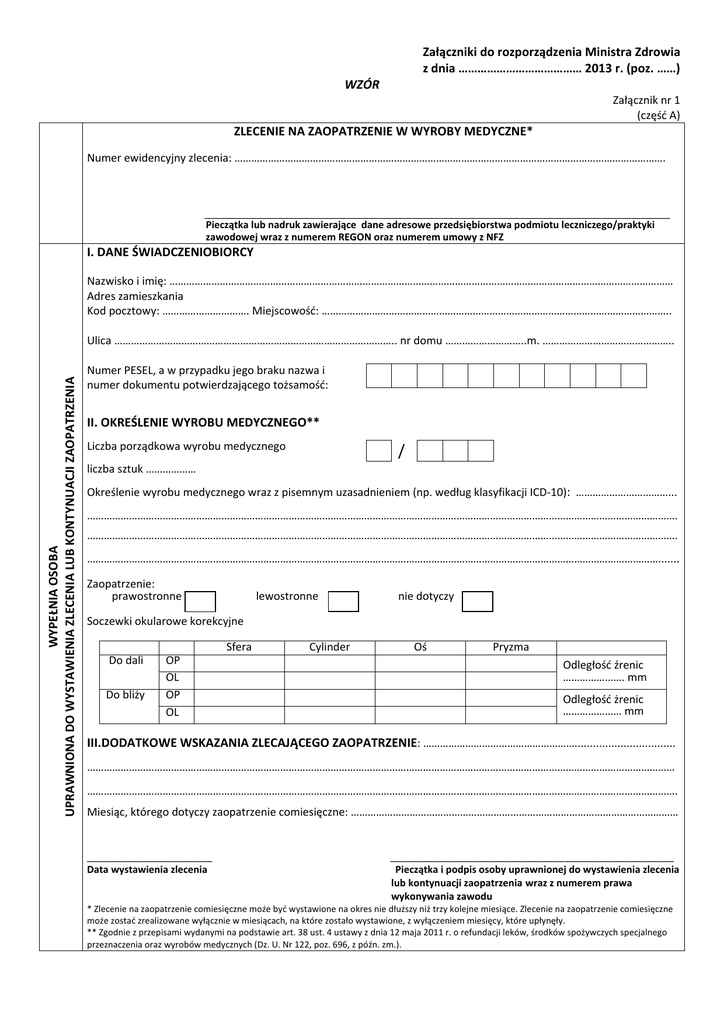 Załączniki do rozporządzenia Ministra Zdrowia z dnia ………………………………… 2013 r. (poz. ……) WZÓR Załącznik nr 1 (część A) ZLECENIE NA ZAOPATRZENIE W WYROBY MEDYCZNE* Numer ewidencyjny zlecenia: ………………………………………………………………………………………………………………………………………. _____________________________________________________________________________________ Pieczątka lub nadruk zawierające dane adresowe przedsiębiorstwa podmiotu leczniczego/praktyki zawodowej wraz z numerem REGON oraz numerem umowy z NFZ I. DANE ŚWIADCZENIOBIORCY Nazwisko i imię: ……………………………………………………………………………………………………………………………………………………………… Adres zamieszkania Kod pocztowy: …………………………. Miejscowość: …………………………………………………………………………………………………………….. WYPEŁNIA OSOBA UPRAWNIONA DO WYSTAWIENIA ZLECENIA LUB KONTYNUACJI ZAOPATRZENIA Ulica ……………………………………………………………………………………….. nr domu ………………………..m. ……………………………………….. Numer PESEL, a w przypadku jego braku nazwa i numer dokumentu potwierdzającego tożsamość: II. OKREŚLENIE WYROBU MEDYCZNEGO** Liczba porządkowa wyrobu medycznego / liczba sztuk ……………… Określenie wyrobu medycznego wraz z pisemnym uzasadnieniem (np. według klasyfikacji ICD‐10): ……………………………... …………………………………………………………………………………………………………………………………………………………………………………………. …………………………………………………………………………………………………………………………………………………………………………………………. ……………………………………………………………………………………………………………………………………………………………………………………....... Zaopatrzenie: prawostronne lewostronne nie dotyczy Soczewki okularowe korekcyjne Sfera Do dali Do bliży OP OL OP OL Cylinder Oś Pryzma Odległość źrenic …………………. mm Odległość żrenic ………………… mm III.DODATKOWE WSKAZANIA ZLECAJĄCEGO ZAOPATRZENIE: ………………………………………………................................. ………………………………………………………………………………………………………………………………………………………………………………………… …………………………………………………………………………………………………………………………………………………………………………………………. Miesiąc, którego dotyczy zaopatrzenie comiesięczne: ……………………………………………………………………………………………………… _______________________ Data wystawienia zlecenia ____________________________________________________ Pieczątka i podpis osoby uprawnionej do wystawienia zlecenia lub kontynuacji zaopatrzenia wraz z numerem prawa wykonywania zawodu * Zlecenie na zaopatrzenie comiesięczne może być wystawione na okres nie dłuższy niż trzy kolejne miesiące. Zlecenie na zaopatrzenie comiesięczne może zostać zrealizowane wyłącznie w miesiącach, na które zostało wystawione, z wyłączeniem miesięcy, które upłynęły. ** Zgodnie z przepisami wydanymi na podstawie art. 38 ust. 4 ustawy z dnia 12 maja 2011 r. o refundacji leków, środków spożywczych specjalnego przeznaczenia oraz wyrobów medycznych (Dz. U. Nr 122, poz. 696, z późn. zm.). WYPEŁNIA PRACOWNIK ODDZIAŁU WOJEWÓDZKIEGO NARODOWEGO FUNDUSZU ZDROWIA IV. POTWIERDZENIE UPRAWNIENIA DO ZAOPATRZENIA WNIOSKOWANYM WYROBEM MEDYCZNYM Kod tytułu uprawnienia ………………………….…………………………………………………………………………………………………………………….. Kod tytułu uprawnienia dodatkowego .…………………………………………………………. nr dokumentu …………………………………….. Nazwa i numer oddziału wojewódzkiego Narodowego Funduszu Zdrowia: …………………………………………………………………… Limit finansowania ze środków publicznych ………..……….. Refundacja Narodowego Funduszu Zdrowia …………………….% Przyczyna odmowy potwierdzenia prawa do refundacji ………………………………………………………………………………………………… ………………………………………………………………………………………………………………………………………………………………………………………. Data potwierdzenia zlecenia ………………………………………………………………………………………………………………………………………….. _________________________________________________ Pieczątka i podpis pracownika oddziału wojewódzkiego Narodowego Funduszu Zdrowia WYPEŁNIA PODMIOT REALIZUJĄCY CZYNNOŚCI Z ZAKRESU ZAOPATRZENIA W WYROBY MEDYCZNE V. POTWIERDZENIE ODBIORU WYROBU MEDYCZNEGO U ŚWIADCZENIODAWCY ________________________ Data przyjęcia do realizacji _______________________________________________ Pieczątka podmiotu realizującego czynności z zakresu zaopatrzenia w wyroby medyczne, w tym adres miejsca udzielania świadczeń wraz z numerem umowy z NFZ Liczba sztuk ………………………… Dane dotyczące wyrobu medycznego (wytwórca, model, nazwa ha
