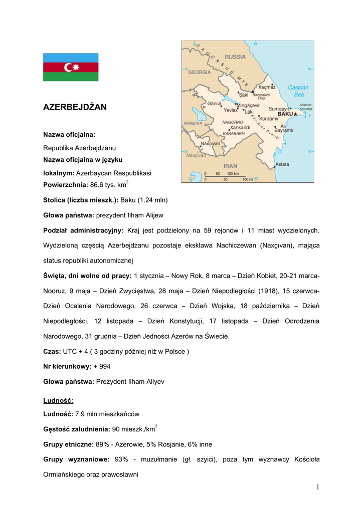 AZERBEJDŻAN Nazwa oficjalna: Republika Azerbejdżanu Nazwa oficjalna w języku lokalnym: Azerbaycan Respublikasi 2 Powierzchnia: 86.6 tys. km Stolica (liczba mieszk.): Baku (1.24 mln) Głowa państwa: prezydent Ilham Alijew Podział administracyjny: Kraj jest podzielony na 59 rejonów i 11 miast wydzielonych. Wydzieloną częścią Azerbejdżanu pozostaje eksklawa Nachiczewan (Naxçıvan), mająca status republiki autonomicznej Święta, dni wolne od pracy: 1 stycznia – Nowy Rok, 8 marca – Dzień Kobiet, 20-21 marcaNooruz, 9 maja – Dzień Zwycięstwa, 28 maja – Dzień Niepodległości (1918), 15 czerwcaDzień Ocalenia Narodowego, 26 czerwca – Dzień Wojska, 18 października – Dzień Niepodległości, 12 listopada – Dzień Konstytucji, 17 listopada – Dzień Odrodzenia Narodowego, 31 grudnia – Dzień Jedności Azerów na Świecie. Czas: UTC + 4 ( 3 godziny później niż w Polsce ) Nr kierunkowy: + 994 Głowa państwa: Prezydent Ilham Aliyev Ludność: Ludność: 7.9 mln mieszkańców 2 Gęstość zaludnienia: 90 mieszk./km Grupy etniczne: 89% - Azerowie, 5% Rosjanie, 6% inne Grupy wyznaniowe: 93% - muzułmanie (gł. szyici), poza tym wyznawcy Kościoła Ormiańskiego oraz prawosławni 1 Stopień analfabetyzmu: 3% (1989) Osoby żyjące poniżej poziomu ubóstwa: 49% (2002) Gospodarka: PKB na mieszkańca: 3.800 $ , 112 miejsce w świecie (dane z 2004 r.) Bezrobocie: oficjalnie 1.2%, faktycznie wielokrotnie większe (2004r.) 1 Inflacja: 4.6% (2004) , Jak dojechać? Samolotem z Warszawy do Baku z przesiadką w Moskwie, Istambule, Pradze lub Kijowie. Liniami Aeroflot – loty codziennie, cena połączenia ok. 1700 PLN (lot w w jedną stronę na trasie Baku – Moskwa kosztuje 120 - 200 USD). Liniami Austrian Airlines – połączenia przez Wiedeń, loty kilka razy w tygodniu, koszt ok. 2650 PLN. Liniami Turkish Airlines – połączenie przez Stambuł (Ataturk Airport), loty codziennie. Koszt biletu ok. 2350 PLN. lotnisko w Baku: Heydar Aliyev Airport: www.airportbaku.com Transport lokalny Pociągi - są zdecydowanie najwolniejszym środkiem transportu, choć bardzo tanim (w granicach kraju; pociągi międzynarodowe nie mają już tak niskich cen). Dworce kolejowe są jednak zwykle miejscami niebezpiecznymi, a w samych pociągach często trudno wytrzymać z powodu duchoty i brudu, przede wszystkim latem. Pociągi dzielą się na dwie podstawowe kategorie: plackartnyj i kupiejnyj. Pierwsza kategoria jest znacznie tańsza; wagon nie jest podzielony na przedziały tylko w całym są łóżka; jest tam zwykle dużo miejsca i można wygodnie się wyspać, ale często jest brudno. Kupiejne to przedziały, w których są najczęściej cztery lub dwa łóżka. Jest tam czyściej, ale bardzo mało miejsca. Podróże pociągami są bezpieczne, ale trzeba uważać na dworcach kolejowych. 1 Http://en.wikipedia.org 2 Przykładowe ceny (w jedną stronę): ok. 8 USD za 300 km, Baku – Genja (Azerbejdżan): 6,25 USD, czas podróży: 5-6 godzin Baku – Tbilisi (Gruzja): 22 USD, czas podróży: 11-12 godzin Pociągi w standardzie z czasów ZSRR. Autobusy - jeżdżą zwykle tylko między większymi miastami, rzadko docierają do wiosek leżących przy bocznych drogach. Są tanie i dość bezpieczne, jednak często się psują. Warto nimi jeździć tylko między większymi miastami i jeśli „na oko” są w miarę dobrym stanie. Standard jest zależny od firmy przewozowej. Ceny: Baku – Ganja 3,75 USD, 6 godzin Baku – Tbilisi: 7 USD, 11 godzin Bilety dostępne w kasie na dworcu. Zazwyczaj nie ma problemów z ich kupnem nawet tuż przed odjazdem. Marszrutki (busiki) - można dojechać praktycznie do każdej miejscowości. Są nieco droższe od innych środków transportu, ale są najszybsze i jeżdżą najczęściej. Rzadko mają rozkład jazdy (choć czasem tak), zwykle wyruszają gdy zbierze się komplet pasażerów. Przystanki marszrutek znajdują się najczęściej przy dworach autobusowych. Podróżowanie marszrutkami nie zawsze należy do zbyt wygodnych, gdyż kierowcy często biorą więcej pasażerów niż jest miejsc siedzących, więc czasem trzeba stać, kucać lub siedzieć na podłodze. Jest to raczej bezpieczny środek transportu, kradzieże, napady zdarzają się rzadko, poza tym kierowcy zwykle mają znajomych na całej trasie, zatrzymują się tylko w sprawdzonych miejscach, pomagają sobie nawzajem i wymieniają informacjami. Podróżujący jedną marszrutką tworzą swego rodzaju wspólnotę, nie odjedzie ona bez któregoś z pasażerów, częstują się jedzeniem, rozmawiają, wymieniają przydatnymi w drodze informacjami itd. Problemem w marszrutkach jest często brak odpowiedniego miejsca na plecaki, więc czasem trzeba je 3 trzymać na kolanach. Marszrutki są bardzo przydatne do podróżowania także na małe odległości, np. po mieście. Ceny: w obrębie Baku nie więcej niż 0.25$ za przejazd. Płaci się przy wyjściu, marszrutka zatrzyma się w dowolnym miejscu, należy poprosić kierowcę. UWAGA! Marszrutki najczęściej są zatłoczone do granic możliwości. Przy podróżowaniu na dalsze odległości, ceny zbliżone są do cen autobusów, wygoda mniejsza ze względu na tłok. Taxi: Ceny za przejazd w granicach centrum Baku – $1 do $2. Dostępność duża. Cenę uzgadnia się z kierowcą, najlepiej przed odjazdem. Dalsze podróże – cena w zależności od ustaleń z kierowcą. Należy się targować. Jeżdżąc taksówkami w Baku warto pamiętać, że właścicielami taksówek są często ludzie spoza Baku, którzy nie znają miasta i nie zawsze będą w stanie zawieść nas pod wskazany adres. Często w charakterze taksówek jeżdżą również prywatni ludzie. Taksówkarze to także dobre źródło informacji (jak dojechać do celu, gdzie znaleźć hotel), ale trzeba uważać, bo często oszukują obcokrajowców. Podróżując wszystkimi publicznymi środkami transportu nie warto zabierać zbyt wiele jedzenia na drogę, gdyż kierowcy zawsze stają po 