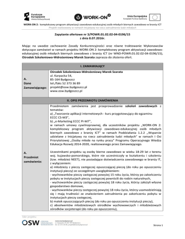 WORK-ON 2: kompleksowy program aktywizacji zawodowo-edukacyjnej osób młodych biernych zawodowo w branży ICT Projekt realizowany w ramach Inicjatywy na rzecz zatrudnienia ludzi młodych Zapytanie ofertowe nr 3/POWR.01.02.02-04-0196/15 z dnia 8.07.2016r. Mając na uwadze zachowanie Zasady Konkurencyjności oraz równe traktowanie Wykonawców dotyczące zamówień w ramach projektu WORK-ON 2: kompleksowy program aktywizacji zawodowoedukacyjnej osób młodych biernych zawodowo z branży ICT (nr WND-POWR.01.02.02-04-0196/15), Ośrodek Szkoleniowo-Wdrożeniowy Marek Szarata zaprasza do złożenia ofert. I. ZAMAWIAJĄCY Ośrodek Szkoleniowo-Wdrożeniowy Marek Szarata ul. Karpacka 54, A. 85-164 Bydgoszcz Dane tel./faks 52 373 36 89 Zamawiającego: [email protected] www.osw.bydgoszcz.pl II. OPIS PRZEDMIOTU ZAMÓWIENIA Przedmiotem zamówienia jest przeprowadzenie szkoleń zawodowych z tematów: a) „Tworzenie aplikacji internetowych - kurs przygotowujący do egzaminu ECCC CS-M3”, b) „e-Marketing ECCC PI-M7”, w ramach umowy cywilnoprawnej, dla uczestników projektu „WORK-ON 2: kompleksowy program aktywizacji zawodowo-edukacyjnej osób młodych biernych zawodowo z branży ICT” w ramach Poddziałania 1.2.2 ,,Wsparcie udzielane z Inicjatywy na rzecz zatrudnienia ludzi młodych” w ramach I Osi Priorytetowej „Osoby młode na rynku pracy” Programu Operacyjnego Wiedza Edukacja Rozwój 2014-2020, realizowanego przez Zamawiającego. A. Przedmiot zamówienia: Uczestnikami projektu są osoby bierne zawodowo w wieku 18-29 lat z terenu woj. kujawsko-pomorskiego, które nie uczestniczyły w kształceniu i szkoleniu (tzw. młodzież NEET), nie posiadające doświadczenia zawodowego w branży IT, z wyłączeniem: a) młodzieży z pieczy zastępczej opuszczającej pieczę (do roku po opuszczeniu instytucji pieczy) ze szczególnym uwzględnieniem: - wychowanków pieczy zastępczej powyżej 15 roku życia, którzy po zakończeniu pobytu w instytucjach pieczy zastępczej powrócili do rodzin naturalnych, - wychowanków pieczy zastępczej powyżej 18 roku życia, którzy założyli własne gospodarstwo domowe, - wychowanków pieczy zastępczej powyżej 18 roku życia, którzy usamodzielniają się i mają trudności ze znalezieniem zatrudnienia po zakończeniu pobytu w instytucjach pieczy zastępczej, b) matek opuszczających pieczę (do roku po opuszczeniu instytucji pieczy), c) absolwentów młodzieżowych ośrodków wychowawczych i młodzieżowych ośrodków socjoterapii (do roku po opuszczeniu), Strona 1 WORK-ON 2: kompleksowy program aktywizacji zawodowo-edukacyjnej osób młodych biernych zawodowo w branży ICT Projekt realizowany w ramach Inicjatywy na rzecz zatrudnienia ludzi młodych d) absolwentów specjalnych ośrodków szkolno-wychowawczych i specjalnych ośrodków wychowawczych (do roku po opuszczeniu), e) matek przebywających w domach samotnej matki, f) osób młodych opuszczających zakłady karne lub areszty śledcze (do roku po opuszczeniu). B. Cel zamówienia: Celem zamówienia jest wyłonienie Trenerów do prowadzenia zajęć na szkoleniach zawodowych: a) „Tworzenie aplikacji internetowych - kurs przygotowujący do egzaminu ECCC CS-M3”, b) „e-Marketing ECCC PI-M7”. C. Kod CPV: Kod określony przez Wspólny 80500000-9 „Usługi szkoleniowe” D. Harmonogram realizacji, lokalizacja i inne warunki świadczenia usługi: 1. Szkolenia odbywać się będą w siedzibie Zamawiającego w Bydgoszczy. 2. W szkoleniach wezmą udział 24 osoby (2 grupy średnio po 12 osób w grupie). 3. Szkolenia odbywać się będą w okresie od sierpnia do października 2016 roku od poniedziałku do piątku w godzinach od 8:00 do 18:00 zgodnie z harmonogramem zajęć. 4. Za rekrutację uczestników odpowiada Zamawiający. 5. Oferent jako personel projektu (w rozumieniu Wytycznych w zakresie kwalifikowalności wydatków w ramach Europejskiego Funduszu Rozwoju Regionalnego, Europejskiego Funduszu Spójności na lata 2014-2020) ma obowiązek osobistego wykonania usługi. 6. Wyklucza się możliwość podzlecania usług. 7. Do obowiązków Oferenta należało będzie: a) ustalenie szczegółowego programu zajęć, b) opracowanie merytoryczne materiałów szkoleniowych i udostępnienie ich uczestnikom projektu, c) prowadzenie zajęć dydaktycznych zgodnie z harmonogramem określonym przez Zamawiającego, d) prowadzenie dziennika zajęć, e) opracowanie i przeprowadzenie pre-testów i post-testów wiedzy wśród uczestników projektu. 8. Oferent w okresie świadczenia usługi szkoleniowej powinien prowadzić ewidencję godzin i zadań realizowanych w ramach projektu. Łączne zaangażowanie zawodowe w realizację wszystkich projektów finansowanych z funduszy strukturalnych i Funduszu Spójności oraz działań finansowanych z innych źródeł, w tym środków własnych i innych podmiotów nie może przekroczyć 276 godzin miesięcznie. C. Tematy szkoleń i liczba godzin: Słownik Zamówień (CPV): Zakres usługi obejmować będzie przeprowadzenie zajęć na szkoleniach zawodowych z następujących tematów: 1) Szkolenie „Tworzenie aplikacji internetowych - kurs przygotowujący do egzaminu ECCC CS-M3” – 1 grupa szkoleniowa, łączny wymiar godzin 160: Strona 2 WORK-ON 2: kompleksowy program aktywizacji zawodowo-edukacyjnej osób młodych biernych zawodowo w branży ICT Projekt realizowany w ramach Inicjatywy na rzecz zatrudnienia ludzi młodych a) Blok 1 – 45 godzin • Podstawowe pojęcia związane z projektowaniem aplikacji internetowych • Przegląd narzędzi programistycznych • Architektury systemów internetowych • Tworzenie struktury strony internetowej przy pomocy języka HTML i CSS • Poprawność sporządzania dokumentów cyfrowych b) Blok 2 – 45 godzin • Grafika na stronach internetowych • Tworzenie i obsługa formularzy • Podstawy programowania w JavaScript • Możliwości i zastosowanie Bootstrap • Responsywność i mobilne aplikacje internetowe c) Blok 3 – 30 godzin