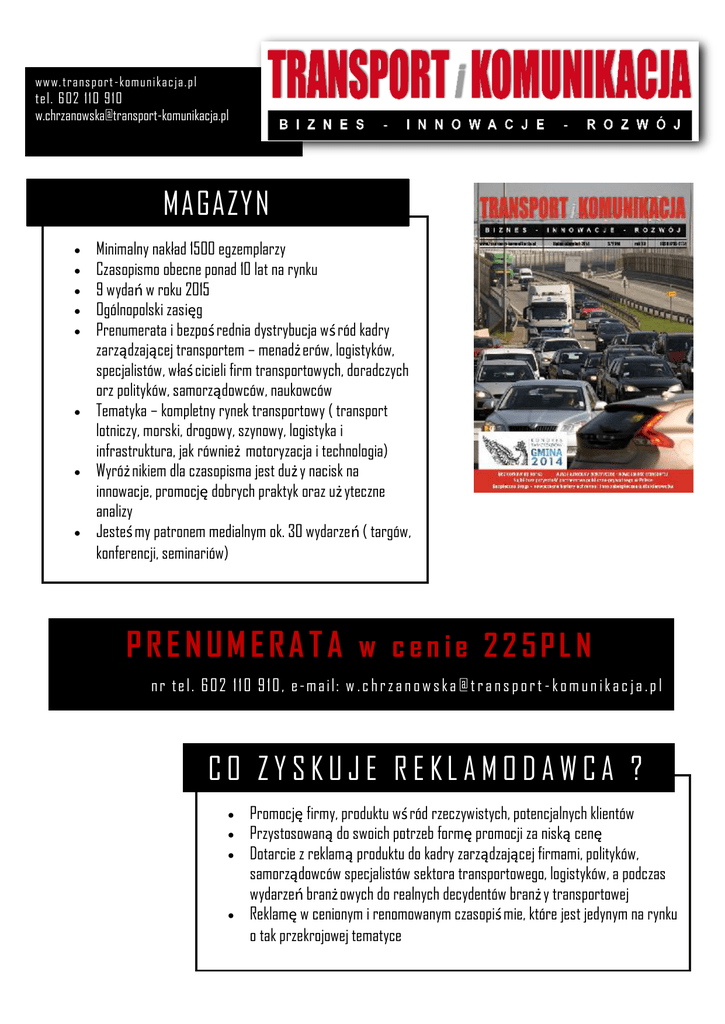 www. trans port -komunikacja. pl tel. 602 110 910 [email protected] MAG AZYN MAGAZYN Minimalny nakład 1500 egzemplarzy Czasopismo obecne ponad 10 lat na rynku 9 wydań w roku 2015 Ogólnopolski zasięg Prenumerata i bezpoś rednia dystrybucja wś ród kadry zarządzającej transportem – menadżerów, logistyków, specjalistów, właś cicieli firm transportowych, doradczych orz polityków, samorządowców, naukowców Tematyka – kompletny rynek transportowy ( transport lotniczy, morski, drogowy, szynowy, logistyka i infrastruktura, jak również motoryzacja i technologia) Wyróż nikiem dla czasopisma jest duż y nacisk na innowacje, promocję dobrych praktyk oraz uż yteczne analizy Jesteś my patronem medialnym ok. 30 wydarzeń ( targów, konferencji, seminariów) PRENUMERATA w cenie 225PLN n r t e l . 6 0 2 1 1 0 9 10 , e -m a i l : w . c h r z a n o w s k a @ t r a n s p o r t - k o m u n i k a c j a . p l CO ZYSKUJE REKLAMODAWCA ? Promocję firmy, produktu wś ród rzeczywistych, potencjalnych klientów Przystosowaną do swoich potrzeb formę promocji za niską cenę Dotarcie z reklamą produktu do kadry zarządzającej firmami, polityków, samorządowców specjalistów sektora transportowego, logistyków, a podczas wydarzeń branż owych do realnych decydentów branż y transportowej Reklamę w cenionym i renomowanym czasopiś mie, które jest jedynym na rynku o tak przekrojowej tematyce www. trans port -komunikacja. pl tel. 602 110 910 [email protected] ARTYKUŁ SPONSOROWANY Twoja firma ma wyjątkowy produkt, szczególne osiągnięcia i chcesz się tym pochwalić? Napisz o tym w „ Transporcie i Komunikacji”. Koszt takiego artykułu ( 1 strona w magazynie to tylko 3000PLN. REKLAMY STANDARDOWE OKŁADKA OKŁADKA I FRONT OKŁADKA II Strona przyokładkowa 4 000 PLN 3 500 PLN 8 000 PLN Podane ceny nie zaw ierają podatku VA T ( 23%) OKŁADKA III 4 000 PLN OKŁADKA IV TYŁ 5 000 PLN STRONY WEWNETRZNE Cała strona wewnętrzna Pół strony poziom A5 A4 ROZKŁADÓWKA ¼ strony 800 PLN Pół strony pion 1/3 strony poziom 1000 PLN 1 200 PLN 2 000 PLN 3 500 PLN 1 500 PLN www. trans port -komunikacja. pl tel. 602 110 910 [email protected] PAKIET ZAKRES CENA 7 x reklama formatu A5 5+ artykuł sponsorowany ( 2 strony A4) w wybranym numerze 6 800 PLN 2 prenumeraty roczne czasopisma 7 x reklama formatu A4 4+ artykuł sponsorowany ( 2 strony A4) w wybranym numerze 11 200 PLN 2 prenumeraty roczne czasopisma reklama na stronie przyokładkowej ( A4) 3+ 7 x reklama formatu A4 artykuł sponsorowany ( 2 strony A4) w wybranym numerze 19 600 PLN 2 prenumeraty roczne czasopisma reklama na III okładce 2+ 7 x reklama formatu A4 artykuł sponsorowany ( 2 strony A4) w wybranym numerze 22 400 PLN 3 prenumeraty roczne czasopisma reklama na II okładce 1+ 7 x reklama formatu A4 artykuł sponsorowany ( 3 strony A4) w wybranym numerze 22 400 PLN 3 prenumeraty roczne czasopisma reklama na IV okładce 0+ 7 x reklama formatu A4 artykuł sponsorowany ( 4 strony A4) w wybranym numerze 28 000 PLN 5 prenumerat rocznych czasopism Podane ceny nie zaw ierają podatku VA T ( 23%) www.transport -komunikacja.pl tel. 602 110 910 [email protected] www. trans port -komunikacja. pl tel. 602 110 910 [email protected] TEMATYKA ROKU 2015 Rozwiązania teleinformatyczne i telekomunikacyjne dla transportu, logistyki i infrastruktury. Nowe trendy w transporcie drogowym, kolejowym, morskim i lotniczym. Od słońca do wodoru – energetyka odnawialna dla transportu i gospodarki. Innowacje w transporcie, energetyce i ochronie środowiska – trendy, projekty, wyzwania. Nowoczesne narzędzia budowania biznesu – marketing, PR i rozwój kapitału ludzkiego. PARTNERZY www.transport-komunikacja.pl tel. 602 110 910 [email protected]