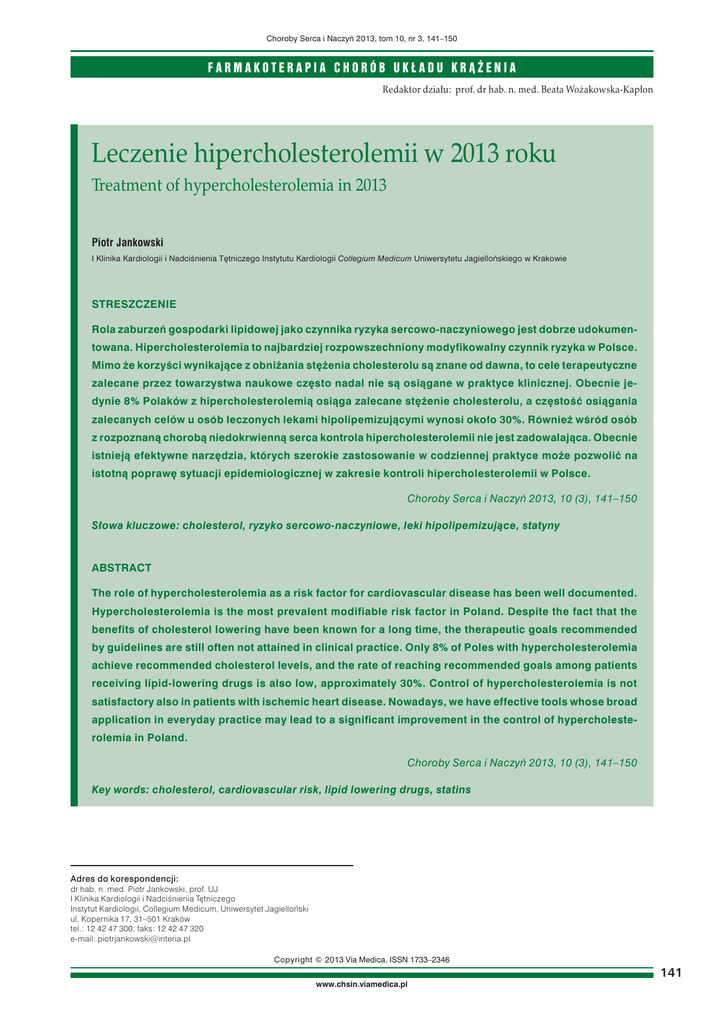Choroby Serca i Naczyń 2013, tom 10, nr 3, 141–150 FARMAKOTERAPIA CHORÓB UKŁADU KRĄŻENIA Redaktor działu: prof. dr hab. n. med. Beata Wożakowska-Kapłon Leczenie hipercholesterolemii w 2013 roku Treatment of hypercholesterolemia in 2013 Piotr Jankowski I Klinika Kardiologii i Nadciśnienia Tętniczego Instytutu Kardiologii Collegium Medicum Uniwersytetu Jagiellońskiego w Krakowie STRESZCZENIE Rola zaburzeń gospodarki lipidowej jako czynnika ryzyka sercowo-naczyniowego jest dobrze udokumentowana. Hipercholesterolemia to najbardziej rozpowszechniony modyfikowalny czynnik ryzyka w Polsce. Mimo że korzyści wynikające z obniżania stężenia cholesterolu są znane od dawna, to cele terapeutyczne zalecane przez towarzystwa naukowe często nadal nie są osiągane w praktyce klinicznej. Obecnie jedynie 8% Polaków z hipercholesterolemią osiąga zalecane stężenie cholesterolu, a częstość osiągania zalecanych celów u osób leczonych lekami hipolipemizującymi wynosi około 30%. Również wśród osób z rozpoznaną chorobą niedokrwienną serca kontrola hipercholesterolemii nie jest zadowalająca. Obecnie istnieją efektywne narzędzia, których szerokie zastosowanie w codziennej praktyce może pozwolić na istotną poprawę sytuacji epidemiologicznej w zakresie kontroli hipercholesterolemii w Polsce. Choroby Serca i Naczyń 2013, 10 (3), 141–150 Słowa kluczowe: cholesterol, ryzyko sercowo-naczyniowe, leki hipolipemizujące, statyny ABSTRACT The role of hypercholesterolemia as a risk factor for cardiovascular disease has been well documented. Hypercholesterolemia is the most prevalent modifiable risk factor in Poland. Despite the fact that the benefits of cholesterol lowering have been known for a long time, the therapeutic goals recommended by guidelines are still often not attained in clinical practice. Only 8% of Poles with hypercholesterolemia achieve recommended cholesterol levels, and the rate of reaching recommended goals among patients receiving lipid-lowering drugs is also low, approximately 30%. Control of hypercholesterolemia is not satisfactory also in patients with ischemic heart disease. Nowadays, we have effective tools whose broad application in everyday practice may lead to a significant improvement in the control of hypercholesterolemia in Poland. Choroby Serca i Naczyń 2013, 10 (3), 141–150 Key words: cholesterol, cardiovascular risk, lipid lowering drugs, statins Adres do korespondencji: dr hab. n. med. Piotr Jankowski, prof. UJ I Klinika Kardiologii i Nadciśnienia Tętniczego Instytut Kardiologii, Collegium Medicum, Uniwersytet Jagielloński ul. Kopernika 17, 31–501 Kraków tel.: 12 42 47 300; faks: 12 42 47 320 e-mail: [email protected] Copyright © 2013 Via Medica, ISSN 1733–2346 www.chsin.viamedica.pl 141 Choroby Serca i Naczyń 2013, tom 10, nr 3 WPROWADZENIE Rola zaburzeń gospodarki lipidowej jako czynnika ryzyka sercowo-naczyniowego jest dobrze udokumentowana. Hipercholesterolemia to najbardziej rozpowszechniony modyfikowalny czynnik ryzyka w Polsce. Wyniki badania NATPOL 2011 wskazują, że częstość występowania hipercholesterolemii w Polsce wynosi około 61% [1]. Mimo że korzyści wynikające z obniżania stężenia cholesterolu są znane od dawna, to cele terapeutyczne zalecane przez towarzystwa naukowe nadal często nie są osiągane w praktyce klinicznej. Wyniki wspomnianego badania NATPOL 2011 wskazują, że jedynie 8% Polaków z hipercholesterolemią osiąga zalecane stężenie cholesterolu. W badaniach prowadzonych w ramach Krakowskiego Programu Wtórnej Prewencji Choroby Niedokrwiennej Serca 2012, programu EUROASPIRE III, a także w badaniach 3ST-POL wykazano, że mimo znacznego wzrostu częstości stosowania leków hipolipemizujących (szczególnie statyn) w ostatnich latach u istotnego odsetka pacjentów z chorobą niedokrwienną serca stężenie cholesterolu jest wciąż za wysokie (ryc. 1) [2–4]. Wskazuje się, że przyczynami niedostatecznej kontroli hipercholestrolemii w Polsce są między innymi stosowanie za małych dawek statyn, a w części przypadków — niestosowanie skojarzonej farmakoterapii. Ponadto przekonanie o konieczności długotrwałej terapii tymi lekami nie jest dostatecznie rozpowszechnione [5]. Najważniejsze przyczyny niedostatecznej kontroli hipercholesterolemii w Polsce przedstawiono w tabeli 1. Zgodnie z wytycznymi Europejskiego Towarzystwa Kardiologicznego (ESC, European Society of Cardiology) z 2012 roku [6], dotyczącymi profilaktyki chorób układu sercowo-naczyniowego, postępowanie w zakresie leczenia hipercholesterolemii należy uzależniać od wyjściowego stężenia cholesterolu frakcji LDL (low-density lipoprotein) oraz od kategorii ryzyka sercowo-naczyniowego. Definicje kategorii ryzyka sercowo-naczyniowego zawarto w tabeli 2. Z kolei w tabeli 3 przedstawiono zasady rozpoczynania farmakoterapii u osób z hipercholesterolemią. W grupie pacjentów obciążonych bardzo dużym ryzykiem sercowo-naczyniowym i u których stężenie cholesterolu frakcji LDL jest większe lub równe 1,8 mmol/l (≥ 70 mg/dl) leki hipolipemizujące włącza się jednocześnie z leczeniem niefarmakologicznym (dieta, aktywność fizyczna), bezpośrednio po stwierdzeniu zbyt dużego stężenia cholesterolu. Podobne postępowanie należy wdrażać u osób z grupy dużego ryzyka sercowo-naczyniowego ze stężeniem cholesterolu frakcji LDL większym lub równym 2,5 mmol/l (≥ 100 mg/dl). W pozostałych grupach pacjentów włączenie farmakoterapii powinno być poprzedzone okresem leczenia niefarmakologicznego z wyjątkiem osób cechujących się umiarkowanym ryzykiem sercowo-naczyniowym, ze stężeniem cholesterolu frakcji LDL poniżej 2,5 mmol/l (< 100 mg/dl) oraz u osób z grupy niskiego ryzyka ze stężeniem cholesterolu LDL poniżej 4,9 mmol/l (< 190 mg/dl), u których nie ma wskazań do leczenia farmakologicznego. Docelowe stężenie cholesterolu frakcji LDL także zależy od ogólnego ryzyka sercowo-naczyn