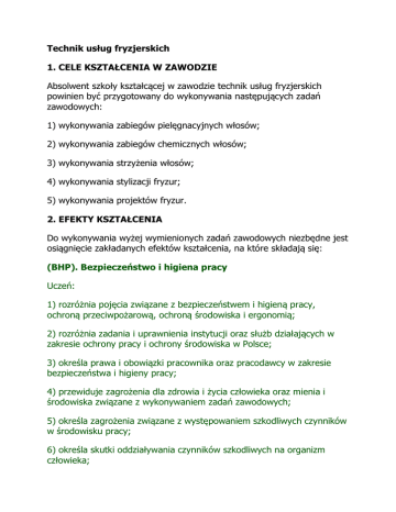 Technik usług fryzjerskich 1. CELE KSZTAŁCENIA W ZAWODZIE Absolwent szkoły kształcącej w zawodzie technik usług fryzjerskich powinien być przygotowany do wykonywania następujących zadań zawodowych: 1) wykonywania zabiegów pielęgnacyjnych włosów; 2) wykonywania zabiegów chemicznych włosów; 3) wykonywania strzyżenia włosów; 4) wykonywania stylizacji fryzur; 5) wykonywania projektów fryzur. 2. EFEKTY KSZTAŁCENIA Do wykonywania wyżej wymienionych zadań zawodowych niezbędne jest osiągnięcie zakładanych efektów kształcenia, na które składają się: (BHP). Bezpieczeństwo i higiena pracy Uczeń: 1) rozróżnia pojęcia związane z bezpieczeństwem i higieną pracy, ochroną przeciwpożarową, ochroną środowiska i ergonomią; 2) rozróżnia zadania i uprawnienia instytucji oraz służb działających w zakresie ochrony pracy i ochrony środowiska w Polsce; 3) określa prawa i obowiązki pracownika oraz pracodawcy w zakresie bezpieczeństwa i higieny pracy; 4) przewiduje zagrożenia dla zdrowia i życia człowieka oraz mienia i środowiska związane z wykonywaniem zadań zawodowych; 5) określa zagrożenia związane z występowaniem szkodliwych czynników w środowisku pracy; 6) określa skutki oddziaływania czynników szkodliwych na organizm człowieka; 7) organizuje stanowisko pracy zgodnie z obowiązującymi wymaganiami ergonomii, przepisami bezpieczeństwa i higieny pracy, ochrony przeciwpożarowej i ochrony środowiska; 8) stosuje środki ochrony indywidualnej i zbiorowej podczas wykonywania zadań zawodowych; 9) przestrzega zasad bezpieczeństwa i higieny pracy oraz stosuje przepisy prawa dotyczące ochrony przeciwpożarowej i ochrony środowiska; 10) udziela pierwszej pomocy poszkodowanym w wypadkach przy pracy oraz w stanach zagrożenia zdrowia i życia. (PDG). Podejmowanie i prowadzenie działalności gospodarczej Uczeń: 1) stosuje pojęcia z obszaru funkcjonowania gospodarki rynkowej; 2) stosuje przepisy prawa pracy, przepisy prawa dotyczące ochrony danych osobowych oraz przepisy prawa podatkowego i prawa autorskiego; 3) stosuje przepisy prawa dotyczące prowadzenia działalności gospodarczej; 4) rozróżnia przedsiębiorstwa i instytucje występujące w branży i powiązania między nimi; 5) analizuje działania prowadzone przez przedsiębiorstwa funkcjonujące w branży; 6) inicjuje wspólne przedsięwzięcia z różnymi przedsiębiorstwami z branży; 7) przygotowuje dokumentację niezbędną do uruchomienia i prowadzenia działalności gospodarczej; 8) prowadzi korespondencję związaną z prowadzeniem działalności gospodarczej; 9) obsługuje urządzenia biurowe oraz stosuje programy komputerowe wspomagające prowadzenie działalności gospodarczej; 10) planuje i podejmuje działania marketingowe prowadzonej działalności gospodarczej; 11) optymalizuje koszty i przychody prowadzonej działalności gospodarczej. (JOZ). Język obcy ukierunkowany zawodowo Uczeń: 1) posługuje się zasobem środków językowych (leksykalnych, gramatycznych, ortograficznych oraz fonetycznych), umożliwiających realizację zadań zawodowych; 2) interpretuje wypowiedzi dotyczące wykonywania typowych czynności zawodowych artykułowane powoli i wyraźnie, w standardowej odmianie języka; 3) analizuje i interpretuje krótkie teksty pisemne dotyczące wykonywania typowych czynności zawodowych; 4) formułuje krótkie i zrozumiałe wypowiedzi oraz teksty pisemne umożliwiające komunikowanie się w środowisku pracy; 5) korzysta z obcojęzycznych źródeł informacji. (KPS). Kompetencje personalne i społeczne Uczeń: 1) przestrzega zasad kultury i etyki; 2) jest kreatywny i konsekwentny w realizacji zadań; 3) przewiduje skutki podejmowanych działań; 4) jest otwarty na zmiany; 5) potrafi radzić sobie ze stresem; 6) aktualizuje wiedzę i doskonali umiejętności zawodowe; 7) przestrzega tajemnicy zawodowej; 8) potrafi ponosić odpowiedzialność za podejmowane działania; 9) potrafi negocjować warunki porozumień; 10) współpracuje w zespole. (OMZ). Organizacja pracy małych zespołów (wyłącznie dla zawodów nauczanych na poziomie technika) Uczeń: 1) planuje pracę zespołu w celu wykonania przydzielonych zadań; 2) dobiera osoby do wykonania przydzielonych zadań; 3) kieruje wykonaniem przydzielonych zadań; 4) ocenia jakość wykonania przydzielonych zadań; 5) wprowadza rozwiązania techniczne i organizacyjne wpływające na poprawę warunków i jakość pracy; 6) komunikuje się ze współpracownikami. Efekty kształcenia wspólne dla zawodów w ramach obszaru administracyjno-usługowego, stanowiące podbudowę do kształcenia w zawodzie lub grupie zawodów PKZ(A.k) i PKZ(A.n); PKZ(A.k) Umiejętności stanowiące podbudowę do kształcenia w zawodzie: technik usług fryzjerskich Uczeń: 1) sporządza szkice i rysunki fryzur; 2) sporządza rysunki fryzur z zachowaniem proporcji i światłocienia; 3) rozróżnia typy budowy głowy i twarzy dzieci oraz osób dorosłych; 4) rozpoznaje rodzaje włosów ludzkich oraz określa ich właściwości; 5) charakteryzuje budowę i fizjologię włosów; 6) rozpoznaje uszkodzenia włosów; 7) charakteryzuje budowę i funkcje skóry; 8) rozróżnia zmiany chorobowe na skórze głowy; 9) charakteryzuje preparaty stosowane do zabiegów fryzjerskich; 10) rozpoznaje sprzęt stosowany do wykonywania zabiegów fryzjerskich; 11) rozpoznaje preparaty do wykonywania zabiegów fryzjerskich; 12) określa wyposażenie salonu fryzjerskiego; 13) stosuje programy komputerowe wspomagające wykonywanie zadań. PKZ(A.n) Umiejętności stanowiące podbudowę do kształcenia w zawodzie technik usług fryzjerskich Uczeń: 1) charakteryzuje style fryzur minionych epok; 2) charakteryzuje współczesne style i rodzaje fryzur; 3) przestrzega zasad projektowania fryzur; 4) charakteryzuje palety kolorystyczne stosowane we fryzjerstwie; 5) posługuje się dokumentacją techniczną; 6) sporządza kalkulacje kosztów świadczonych usług; 7) stosuje p