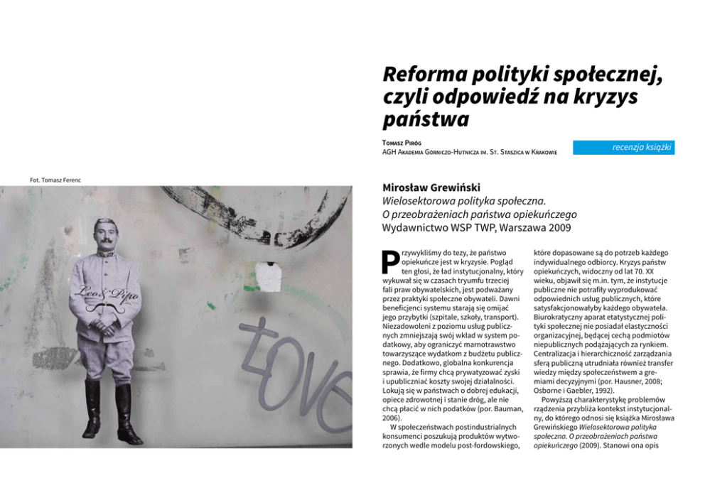 Reforma polityki społecznej, czyli odpowiedź na kryzys państwa Tomasz Piróg AGH Akademia Górniczo-Hutnicza im. St. Staszica w Krakowie Fot. Tomasz Ferenc recenzja książki Mirosław Grewiński Wielosektorowa polityka społeczna. O przeobrażeniach państwa opiekuńczego Wydawnictwo WSP TWP, Warszawa 2009 P rzywykliśmy do tezy, że państwo opiekuńcze jest w kryzysie. Pogląd ten głosi, że ład instytucjonalny, który wykuwał się w czasach tryumfu trzeciej fali praw obywatelskich, jest podważany przez praktyki społeczne obywateli. Dawni beneficjenci systemu starają się omijać jego przybytki (szpitale, szkoły, transport). Niezadowoleni z poziomu usług publicznych zmniejszają swój wkład w system podatkowy, aby ograniczyć marnotrawstwo towarzyszące wydatkom z budżetu publicznego. Dodatkowo, globalna konkurencja sprawia, że firmy chcą prywatyzować zyski i upubliczniać koszty swojej działalności. Lokują się w państwach o dobrej edukacji, opiece zdrowotnej i stanie dróg, ale nie chcą płacić w nich podatków (por. Bauman, 2006). W społeczeństwach postindustrialnych konsumenci poszukują produktów wytworzonych wedle modelu post-fordowskiego, które dopasowane są do potrzeb każdego indywidualnego odbiorcy. Kryzys państw opiekuńczych, widoczny od lat 70. XX wieku, objawił się m.in. tym, że instytucje publiczne nie potrafiły wyprodukować odpowiednich usług publicznych, które satysfakcjonowałyby każdego obywatela. Biurokratyczny aparat etatystycznej polityki społecznej nie posiadał elastyczności organizacyjnej, będącej cechą podmiotów niepublicznych podążających za rynkiem. Centralizacja i hierarchiczność zarządzania sferą publiczną utrudniała również transfer wiedzy między społeczeństwem a gremiami decyzyjnymi (por. Hausner, 2008; Osborne i Gaebler, 1992). Powyższą charakterystykę problemów rządzenia przybliża kontekst instytucjonalny, do którego odnosi się książka Mirosława Grewińskiego Wielosektorowa polityka społeczna. O przeobrażeniach państwa opiekuńczego (2009). Stanowi ona opis Recenzja książki „Wielosektorowa polityka społeczna. O przeobrażeniach państwa opiekuńczego” projektu normatywnego, zbudowanego w celu zwiększenia zadowolenia obywateli z działania instytucji publicznych. Recenzowana książka składa się z dwóch części: teoretycznej oraz praktycznej. W pierwszej części autor omawia komunitarianizm jako przykład nowego podejścia do obywatelstwa, przybliżając przy tym znaczenie kluczowych pojęć towarzyszących reformom państw opiekuńczych (kapitał społeczny i społeczeństwo obywatelskie), legitymizujących instytucjonalną rekonstrukcję rządzenia. Opisana koncepcja nie postuluje zaniku aktywności władz państwowych w zakresie polityki społecznej, a jedynie zmianę logiki ich postępowania. Grewiński prezentuje instytucjonalne modele wielosektorowości, które mają cechy modeli teoretycznych. Są one budowane na podstawie idei tzw. „trzeciej drogi” (Giddens, 1999), postulującej „prywatyzacje odpowiedzialności” obywateli za własny los, w sposób łagodzący negatywne skutki „zinstytucjonalizowanego indywidualizmu” (Beck-Gernsheim, 2002). Powyższe zmiany wymuszają na jednostkach aktywność w zakresie zabezpieczania własnych potrzeb socjalnych i oddolnego grupowego współdziałania w ramach polityki społecznej. Modele wielosektorowe starają się pogodzić realizacje powyższych zamierzeń z nienaruszaniem zasady, iż państwo powinno pomagać obywatelom w wyrównywaniu standardu życia oraz ponosić odpowiedzialność za całokształt polityki społecznej. Decentralizacja, dekoncentracja i demonopolizacja tej polityki ma na celu doprowadzenie do wzrostu satysfakcji obywateli-konsumentów z rządzenia. Książka zawiera charakterystykę silnych i słabych stron każdego z trzech sektorów współtworzących wielosektorową polityką społeczną: pozarządowego (non-profit), publicznego i rynkowego (for-profit). Autor dochodzi do wniosku, że skuteczna polityka społeczna wymaga wzajemnego uzupełniania się sektorów, bowiem każdy z nich samodzielnie może doprowadzić do skutków negatywnych. W celu zilustrowania powyższych tez przedstawia własną koncepcję tzw. „stokrotki dobrobytu”. Druga część monografii dotyczy zagadnień praktycznych. Mirosław Grewiński omawia w niej problemy implementacji wielosektorowej polityki społecznej. Dokonuje tego poprzez prezentację rozwoju III sektora w Polsce oraz opisuje elementy pluralizmu obecne w obszarach takich jak: pomoc i integracja społeczna, polityka zatrudnienia i rynek pracy, polityka edukacyjna i kształcenie ustawiczne. Warto podkreślić, że prezentowana książka ma charakter normatywny. Promuje ona wzmocnienie znaczenia niepublicznych osób prawnych w polityce społecznej państw opiekuńczych oraz ewolucję instytucji publicznych, przeprowadzaną w duchu nowego zarządzania publicznego. W moim odczuciu autor nazbyt koncentruje się na pozytywnych skutkach włączania III sektora do wielosektorowej polityki społecznej. Wiara w model przysłania krytycyzm związany z jego potencjalnymi konsekwencjami. Na zakończenie proponuję czytelnikom książki Mirosława Grewińskiego sięgnięcie po dorobek innych autorów zainteresowanych wielosektorowością, którzy poruszali podobne wątki w bardziej krytyczny sposób. Paweł Załęski (2012), Ryszard Szarfenberg (2008) i Chantal Mouffe (2008) dostrzegają, że promowana i wdrażana w wielu krajach zmiana logiki rządzenia powoduje nowe nierówności społeczne. Przeczą tym samym neoliberalnym 207 idealistom wierzącym w reformy państwa, w których wszyscy równo zyskują (indywidualnie i wspólnie), a nikt subiektywnie nie traci. Bibliografia: Bauman, Z. (2006). Praca, konsumpcjonizm i nowi ubodzy. Warszawa: Wyd. WAM. Beck, U., Beck-Gernsheim, E. (2002). Individualization. Institutionalized Individualism and its Social and Politic