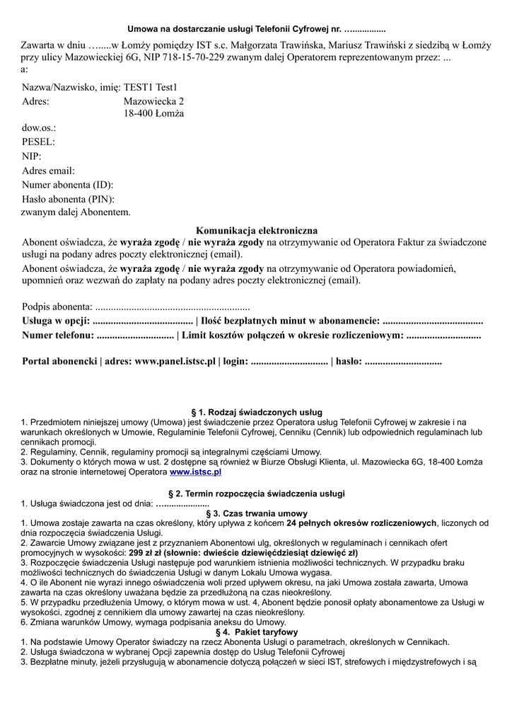 Umowa na dostarczanie usługi Telefonii Cyfrowej nr. ….............. Zawarta w dniu ….....w Łomży pomiędzy IST s.c. Małgorzata Trawińska, Mariusz Trawiński z siedzibą w Łomży przy ulicy Mazowieckiej 6G, NIP 718-15-70-229 zwanym dalej Operatorem reprezentowanym przez: ... a: Nazwa/Nazwisko, imię: TEST1 Test1 Adres: Mazowiecka 2 18-400 Łomża dow.os.: PESEL: NIP: Adres email: Numer abonenta (ID): Hasło abonenta (PIN): zwanym dalej Abonentem. Komunikacja elektroniczna Abonent oświadcza, że wyraża zgodę / nie wyraża zgody na otrzymywanie od Operatora Faktur za świadczone usługi na podany adres poczty elektronicznej (email). Abonent oświadcza, że wyraża zgodę / nie wyraża zgody na otrzymywanie od Operatora powiadomień, upomnień oraz wezwań do zapłaty na podany adres poczty elektronicznej (email). Podpis abonenta: ............................................................ Usługa w opcji: ....................................... | Ilość bezpłatnych minut w abonamencie: ....................................... Numer telefonu: .............................. | Limit kosztów połączeń w okresie rozliczeniowym: ............................. Portal abonencki | adres: www.panel.istsc.pl | login: .............................. | hasło: .............................. § 1. Rodzaj świadczonych usług 1. Przedmiotem niniejszej umowy (Umowa) jest świadczenie przez Operatora usług Telefonii Cyfrowej w zakresie i na warunkach określonych w Umowie, Regulaminie Telefonii Cyfrowej, Cenniku (Cennik) lub odpowiednich regulaminach lub cennikach promocji. 2. Regulaminy, Cennik, regulaminy promocji są integralnymi częściami Umowy. 3. Dokumenty o których mowa w ust. 2 dostępne są również w Biurze Obsługi Klienta, ul. Mazowiecka 6G, 18-400 Łomża oraz na stronie internetowej Operatora www.istsc.pl § 2. Termin rozpoczęcia świadczenia usługi 1. Usługa świadczona jest od dnia: …................... § 3. Czas trwania umowy 1. Umowa zostaje zawarta na czas określony, który upływa z końcem 24 pełnych okresów rozliczeniowych, liczonych od dnia rozpoczęcia świadczenia Usługi. 2. Zawarcie Umowy związane jest z przyznaniem Abonentowi ulg, określonych w regulaminach i cennikach ofert promocyjnych w wysokości: 299 zł zł (słownie: dwieście dziewięćdziesiąt dziewięć zł) 3. Rozpoczęcie świadczenia Usługi następuje pod warunkiem istnienia możliwości technicznych. W przypadku braku możliwości technicznych do świadczenia Usługi w danym Lokalu Umowa wygasa. 4. O ile Abonent nie wyrazi innego oświadczenia woli przed upływem okresu, na jaki Umowa została zawarta, Umowa zawarta na czas określony uważana będzie za przedłużoną na czas nieokreślony. 5. W przypadku przedłużenia Umowy, o którym mowa w ust. 4, Abonent będzie ponosił opłaty abonamentowe za Usługi w wysokości, zgodnej z cennikiem dla umowy zawartej na czas nieokreślony. 6. Zmiana warunków Umowy, wymaga podpisania aneksu do Umowy. § 4. Pakiet taryfowy 1. Na podstawie Umowy Operator świadczy na rzecz Abonenta Usługi o parametrach, określonych w Cennikach. 2. Usługa świadczona w wybranej Opcji zapewnia dostęp do Usług Telefonii Cyfrowej 3. Bezpłatne minuty, jeżeli przysługują w abonamencie dotyczą połączeń w sieci IST, strefowych i międzystrefowych i są zliczane w kolejności wykonywania połączeń. 4. Bezpłatne minuty obowiązują od pierwszego pełnego okresu rozliczeniowego. 5. Bezpłatne minuty rozliczane są w systemie sekundowym. 6. Naliczanie płatnych połączeń po wykorzystaniu bezpłatnych minut odbywa się w systemie minutowym. Wyjątek stanowią połączenia strefowe i międzystrefowe (oprócz sieci IST) dla abonamentu IST-35-240 zł, gdzie połączenia rozliczane są w systemie sekundowym. 7. Na koncie Abonenckim ustalono miesięczny limit kwotowy w wysokości podanej na początku tejże umowy, na połączenia wykonywane przez Abonenta. 8. Miesięczny limit kwotowy może być założony, zniesiony lub zwiększony na pisemny wniosek abonenta. 9. Miesięczny limit kwotowy zostaje wprowadzony lub zniesiony od początku pierwszego pełnego okresu rozliczeniowego następującego po dacie złożenia wniosku. § 5. Sposób składania zamówień na usługi 1. Abonent może składać zamówienie na Usługi w formie przewidzianej przez Operatora tj. pisemnie lub za pomocą innych środków porozumiewania się na odległość. § 6. Okres rozliczeniowy 1. Rozpoczęcie naliczania opłat za Usługę następuje po aktywacji Usługi. 2. Okresem rozliczeniowym, będącym podstawą do rozliczenia należności Abonenta wobec Operatora, jest miesiąc kalendarzowy. Rozliczenie następuje według dat wskazanych na fakturze VAT. 3. Operator wystawia faktury VAT za każdy okres rozliczeniowy. 4. Faktury VAT za Usługę, doręczane są Abonentowi przesyłką pocztową w granicach Rzeczpospolitej Polskiej lub w inny sposób uzgodniony przez Strony. 5. Termin płatności wynosi 14 dni od dnia wystawienia faktury VAT. 6. Za dzień zapłaty uważa się dzień wpływu środków na rachunek Operatora. 7. Za opóźnienie w uiszczaniu opłat Operator nalicza odsetki ustawowe. 8. Abonent jest zobowiązany do wpłacania należności za usługi zgodnie z wystawioną fakturą, w Biurze Obsługi Klienta bądź na poniższy nr rachunku bankowego: PKO BANK POLSKI 49 1020 1332 0000 1502 0346 87 58 9. W przypadku, gdy Abonent dokonuje wpłaty za pomocą przelewu bankowego, zobowiązany jest podać swój numer Abonenta, określony na dokumencie płatniczym oraz podać numer dokumentu, za który następuje wpłata. W przypadku braku takiego wskazania, wpłata zostanie rozliczona na poczet zaległości wynikających z najstarszych faktur VAT, wraz z odsetkami. W przypadku braku możliwości zidentyfikowania Abonenta dokonującego wpłaty, zostanie ona zwrócona przez Operatora do banku, który zrealizował wpłatę. 10. W sytuacjach szczególnych lub niezależnych od Operatora, Ope