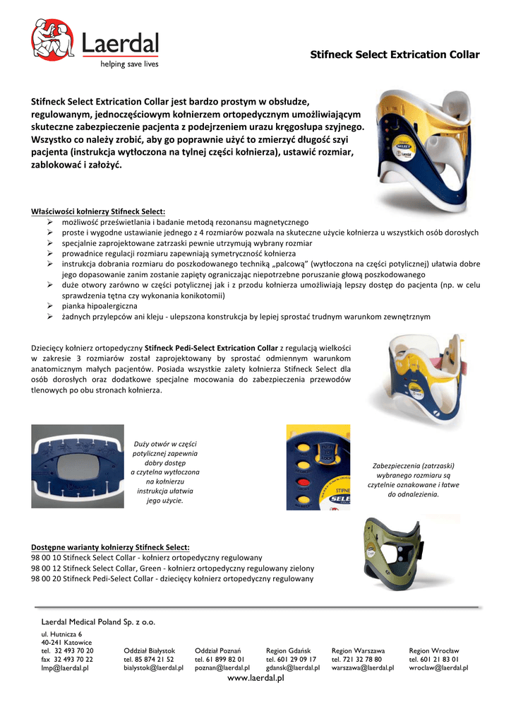 Stifneck Select Extrication Collar Stifneck Select Extrication Collar jest bardzo prostym w obsłudze, regulowanym, jednoczęściowym kołnierzem ortopedycznym umożliwiającym skuteczne zabezpieczenie pacjenta z podejrzeniem urazu kręgosłupa szyjnego. Wszystko co należy zrobić, aby go poprawnie użyć to zmierzyć długość szyi pacjenta (instrukcja wytłoczona na tylnej części kołnierza), ustawić rozmiar, zablokować i założyć. Właściwości kołnierzy Stifneck Select: Ø możliwość prześwietlania i badanie metodą rezonansu magnetycznego Ø proste i wygodne ustawianie jednego z 4 rozmiarów pozwala na skuteczne użycie kołnierza u wszystkich osób dorosłych Ø specjalnie zaprojektowane zatrzaski pewnie utrzymują wybrany rozmiar Ø prowadnice regulacji rozmiaru zapewniają symetryczność kołnierza Ø instrukcja dobrania rozmiaru do poszkodowanego techniką „palcową” (wytłoczona na części potylicznej) ułatwia dobre jego dopasowanie zanim zostanie zapięty ograniczając niepotrzebne poruszanie głową poszkodowanego Ø duże otwory zarówno w części potylicznej jak i z przodu kołnierza umożliwiają lepszy dostęp do pacjenta (np. w celu sprawdzenia tętna czy wykonania konikotomii) Ø pianka hipoalergiczna Ø żadnych przylepców ani kleju -‐ ulepszona konstrukcja by lepiej sprostać trudnym warunkom zewnętrznym Dziecięcy kołnierz ortopedyczny Stifneck Pedi-‐Select Extrication Collar z regulacją wielkości w zakresie 3 rozmiarów został zaprojektowany by sprostać odmiennym warunkom anatomicznym małych pacjentów. Posiada wszystkie zalety kołnierza Stifneck Select dla osób dorosłych oraz dodatkowe specjalne mocowania do zabezpieczenia przewodów tlenowych po obu stronach kołnierza. Duży otwór w części potylicznej zapewnia dobry dostęp Zabezpieczenia (zatrzaski) a czytelna wytłoczona wybranego rozmiaru są na kołnierzu czytelnie oznakowane i łatwe instrukcja ułatwia do odnalezienia. jego użycie. Dostępne warianty kołnierzy Stifneck Select: 98 00 10 Stifneck Select Collar -‐ kołnierz ortopedyczny regulowany 98 00 12 Stifneck Select Collar, Green -‐ kołnierz ortopedyczny regulowany zielony 98 00 20 Stifneck Pedi-‐Select Collar -‐ dziecięcy kołnierz ortopedyczny regulowany Laerdal Medical Poland Sp. z o.o. ul. Hutnicza 6 40-241 Katowice tel. 32 493 70 20 fax 32 493 70 22 [email protected] Oddział Białystok tel. 85 874 21 52 [email protected] Oddział Poznań tel. 61 899 82 01 [email protected] Region Gdańsk tel. 601 29 09 17 [email protected] www.laerdal.pl Region Warszawa tel. 721 32 78 80 [email protected] Region Wrocław tel. 601 21 83 01 [email protected]