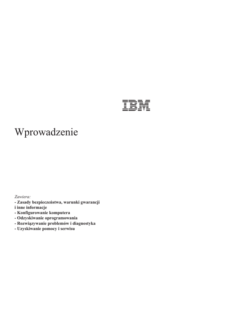 Wprowadzenie Zawiera: - Zasady bezpieczeństwa, warunki gwarancji i inne informacje - Konfigurowanie komputera - Odzyskiwanie oprogramowania - Rozwiązywanie problemów i diagnostyka - Uzyskiwanie pomocy i serwisu Wprowadzenie Uwaga Przed wykorzystaniem informacji zawartych w niniejszym dokumencie lub przed użyciem urządzenia, którego one dotyczą, należy przeczytać “Uwagi dotyczące bezpieczeństwa” na stronie v oraz “Dodatek. Gwarancje na produkt oraz uwagi” na stronie 31. Wydanie trzecie (maj 2001 r.) © Copyright International Business Machines Corporation 2001. Wszelkie prawa zastrzeżone. Spis treści Uwagi dotyczące bezpieczeństwa. . . . . . . . . . . . . . . v Uwagi dotyczące baterii litowej . . . . . . . . . . . . . . . . . vi Informacje dotyczące bezpieczeństwa przy korzystaniu z modemu . . . . . . vi Oświadczenie o zgodności urządzenia laserowego . . . . . . . . . . . vi Dodatkowa pomoc . . . . . . . . . . . . . . . . . . . . ix Rozdział 1. Ustawianie komputera . . . . . . . . . . . . . . 1 Czytanie i drukowanie ważnych informacji . . . . . . . . . . . . . . 1 Urządzanie miejsca pracy . . . . . . . . . . . . . . . . . . . 1 Wygoda . . . . . . . . . . . . . . . . . . . . . . . 1 Odblaski i oświetlenie . . . . . . . . . . . . . . . . . . . 2 Obieg powietrza . . . . . . . . . . . . . . . . . . . . . 3 Gniazda zasilające i długości kabli . . . . . . . . . . . . . . . 3 Rozdział 2. Przygotowanie komputera do pracy . Włączanie zasilania . . . . . . . . . . . . Zakończenie instalowania oprogramowania . . . . Używanie dysku CD Software Selections . . . . Instalowanie innych systemów operacyjnych . . . Wyłączanie komputera . . . . . . . . . . Zapis informacji o komputerze . . . . . . . . . . . . . . . . . . . . . . . . . . . . . . . . . . . . . . . . . . . . . . . . . . . . . . . . . . . . . . . . . 5 . 9 . 9 . 9 . 10 . 10 . 11 Rozdział 3. Program Product Recovery . . . . . . . . . . Odzyskiwanie oprogramowania . . . . . . . . . . . . . . . Odzyskiwanie oprogramowania po awarii dysku twardego . . . . . . . Rozwiązywanie problemów z odzyskiwaniem oprogramowania . . . . . Program Product Recovery nie uruchamia się mimo naciskania klawisza F11 Program nie uruchamia się z dysku CD Product Recovery . . . . . . Na ekranie nie ukazuje się komunikat opcji naciśnięcia klawisza F11. . . Zmiana kolejności startowej . . . . . . . . . . . . . . . . Odzyskiwanie i instalowanie sterowników urządzeń. . . . . . . . . . . 13 . . 13 . . 14 . . 14 14 . . 15 . . 15 . . 16 . . 16 Rozdział 4. Rozwiązywanie problemów i diagnostyka . . . . Podstawowe rozwiązywanie problemów . . . . . . . . . . . IBM Enhanced Diagnostics . . . . . . . . . . . . . . . Uruchamianie programu IBM Enhanced Diagnostics z programu Product Recovery . . . . . . . . . . . . . . . . . . Tworzenie dyskietki IBM Enhanced Diagnostics . . . . . . . . Uruchamianie programu IBM Enhanced Diagnostics z dyskietki . . . Kody błędów . . . . . . . . . . . . . . . . . . . . . . . © Copyright IBM Corp. 2001 . . . 19 . . . 19 . . . 20 . . . . . . . . 21 21 22 22 iii Rozdział 5. Uzyskiwanie informacji, pomocy i serwisu Uzyskiwanie informacji . . . . . . . . . . . . W sieci WWW . . . . . . . . . . . . . . Uzyskiwanie informacji faksem . . . . . . . . . Uzyskiwanie pomocy i serwisu . . . . . . . . . . Używanie dokumentacji i programów diagnostycznych . . Kontakt telefoniczny z serwisem . . . . . . . . Inne usługi . . . . . . . . . . . . . . . Dodatkowe usługi płatne . . . . . . . . . . . . Dodatek. Gwarancje na produkt oraz uwagi . . . Warunki gwarancji . . . . . . . . . . . . Okres gwarancyjny . . . . . . . . . . . Warunki Ograniczonej Gwarancji IBM . . . . . Uwagi . . . . . . . . . . . . . . . . Przetwarzanie dat . . . . . . . . . . . . Uwagi na temat wyjścia telewizyjnego. . . . . . Znaki towarowe . . . . . . . . . . . . Uwagi dotyczące emisji elektronicznej. . . . . . Wymagania FCC dotyczące operatora sieci telefonicznej Uwagi dotyczące kabla zasilającego . . . . . . iv Wprowadzenie . . . . . . . 25 . . . . . . . 25 . . . . . . . 25 . . . . . . . 25 . . . . . . . 26 . . . . . . . 26 . . . . . . . 26 . . . . . . . 28 . . . . . . . 29 . . . . . . . . 31 . . . . . . . . 31 . . . . . . . . 31 . . . . . . . . 33 . . . . . . . . 44 . . . . . . . . 45 . . . . . . . . 46 . . . . . . . . 46 . . . . . . . . 46 . . . . . . . . 50 . . . . . . . . 52 Uwagi dotyczące bezpieczeństwa NIEBEZPIECZEŃSTWO Napięcie elektryczne pochodzące z kabli zasilających, telefonicznych i sygnałowych może być niebezpieczne. Aby uniknąć porażenia prądem elektrycznym należy przestrzegać następujących zasad: v nie należy łączyć lub rozłączać żadnych kabli ani wykonywać instalowania, obsługi technicznej czy rekonfigurowania tego produktu podczas burzy z wyładowaniami atmosferycznymi, v wszystkie kable zasilające muszą być włączone do prawidłowo podłączonych i uziemionych gniazd zasilających, v wszystkie urządzenia, z którymi ten produkt ma być połączony, muszą być również włączone do prawidłowo podłączonych gniazd zasilających, v o ile jest to tylko możliwe, należy podłączać i rozdłączać kable sygnałowe jedną ręką, v nigdy nie należy włączać urządzenia, jeśli widoczne są oznaki ognia, wody lub uszkodzeń konstrukcji, v przed otwarciem obudowy urządzenia należy odłączyć wszystkie kable zasilające, a także systemy telekomunikacyjne, sieci i modemy, o ile procedury konfigurowania i instalowania nie nakazują inaczej, v podczas instalowania i przenoszenia tego produktu lub podłączonych do niego urządzeń, a także otwierania ich obudów, kable należy łączyć i rozłączać według zaleceń zawartych w poniższej tabeli. Aby podłączyć: Aby odłączyć: 1. Wyłącz wszystkie urządzenia. 1. Wyłącz wszystkie urządzenia. 2. Podłącz wszystkie kable do urządzeń. 2. Odłącz kable zasilające od gniazd zasilających. 3. Podłącz kable sygna