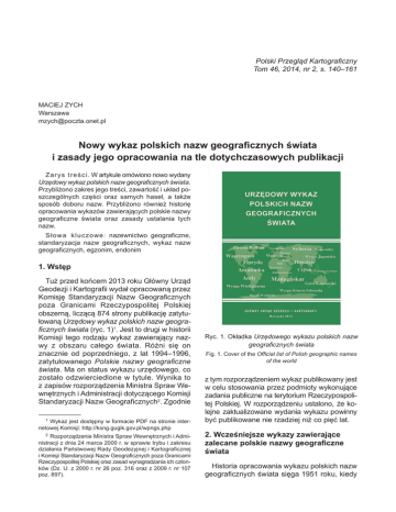 Polski Przegląd Kartograficzny Tom 46, 2014, nr 2, s. 140–161 MACIEJ ZYCH Warszawa [email protected] Nowy wykaz polskich nazw geograficznych świata i zasady jego opracowania na tle dotychczasowych publikacji Za r y s tr eś c i . W artykule omówiono nowo wydany Urzędowy wykaz polskich nazw geograficznych świata. Przybliżono zakres jego treści, zawartość i układ poszczególnych części oraz samych haseł, a także sposób doboru nazw. Przybliżono również historię opracowania wykazów zawierających polskie nazwy geograficzne świata oraz zasady ustalania tych nazw. S łowa kluczo we: nazewnictwo geograficzne, standaryzacja nazw geograficznych, wykaz nazw geograficznych, egzonim, endonim 1. Wstęp Tuż przed końcem 2013 roku Główny Urząd Geodezji i Kartografii wydał opracowaną przez Komisję Standaryzacji Nazw Geograficznych poza Granicami Rzeczypospolitej Polskiej obszerną, liczącą 874 strony publikację zatytułowaną Urzędowy wykaz polskich nazw geograficznych świata (ryc. 1)1. Jest to drugi w historii Komisji tego rodzaju wykaz zawierający naz wy z obszaru całego świata. Różni się on znacznie od poprzedniego, z lat 1994–1996, zatytułowanego Polskie nazwy geograficzne świata. Ma on status wykazu urzędowego, co zostało odzwierciedlone w tytule. Wynika to z zapisów rozporządzenia Ministra Spraw Wewnętrznych i Administracji dotyczącego Komisji Standaryzacji Nazw Geograficznych2. Zgodnie 1 Wykaz jest dostępny w formacie PDF na stronie internetowej Komisji: http://ksng.gugik.gov.pl/wpngs.php 2 Rozporządzenie Ministra Spraw Wewnętrznych i Administracji z dnia 24 marca 2000 r. w sprawie trybu i zakresu działania Państwowej Rady Geodezyjnej i Kartograficznej i Komisji Standaryzacji Nazw Geograficznych poza Granicami Rzeczypospolitej Polskiej oraz zasad wynagradzania ich członków (Dz. U. z 2000 r. nr 26 poz. 316 oraz z 2009 r. nr 107 poz. 897). Ryc. 1. Okładka Urzędowego wykazu polskich nazw geograficznych świata Fig. 1. Cover of the Official list of Polish geographic names of the world z tym rozporządzeniem wykaz publikowany jest w celu stosowania przez podmioty wykonujące zadania publiczne na terytorium Rzeczypospolitej Polskiej. W rozporządzeniu ustalono, że kolejne zaktualizowane wydania wykazu powinny być publikowane nie rzadziej niż co pięć lat. 2. Wcześniejsze wykazy zawierające zalecane polskie nazwy geograficzne świata Historia opracowania wykazu polskich nazw geograficznych świata sięga 1951 roku, kiedy Nowy wykaz polskich nazw geograficznych świata i zasady jego opracowania... to przy Polskim Towarzystwie Geograficznym została powołana Komisja Nazw Geograficznych, a jej przewodniczącym został prof. Stanisław Leszczycki. Komisja niezwłocznie po 141 opracowany przez Lecha Ratajskiego, Janinę Szewczyk i Przemysława Zwolińskiego (ryc. 2). Wykaz ten został uznany przez Komisję Kultury Języka Komitetu Językoznawstwa Polskiej Ryc. 2. Okładka i układ haseł w wykazie Polskie nazewnictwo geograficzne świata z 1959 r. Fig. 2. Cover and organization of entries in the Polish geographical names of the world (1959) powołaniu podjęła szeroko zakrojone prace, których celem było ujednolicenie stosowanych w Polsce nazw geograficznych obiektów położonych poza granicami Polski, a także przygotowanie wykazu nazw uznanych za poprawne i zalecanych do używania – zarówno nazw polskich, jak i nazw oryginalnych. Do 1956 r. Komisja (od 1953 r. działająca przy Instytucie Geografii Polskiej Akademii Nauk pod nazwą Komisja Ustalania Nazw Geograficznych) ustaliła 19 720 nazw obiektów z całego świata, wśród których sporą część stanowiły nazwy polskie. Wykazy ustalonych nazw były systematycznie publikowane w latach 1952–1956 w postaci 15 zeszytów3. W 1959 r. wydano poprawiony i zaktualizowany zbiorczy wykaz nazw zawartych w tych zeszytach zatytułowany Polskie nazewnictwo geograficzne świata, 3 Lista tych zeszytów, a także następnych wykazów nazw geograficznych świata, łącznie z tu omawianym, jest zamieszczona na końcu artykułu. Akademii Nauk za normę i w związku z tym był szeroko wykorzystywany w wielu słownikach, encyklopediach i opracowaniach geograficznych. W wykazie zawarto wiele polskich nazw geograficznych, jednak uwzględnione zostały także obiekty, dla których polskie nazwy nie istniały lub nie zostały zalecone przez Komisję. W 1967 roku odbyła się w Genewie pierwsza Konferencja ONZ w sprawie Standaryzacji Nazw Geograficznych, w następstwie której powołana została Grupa Ekspertów ONZ ds. Nazw Geograficznych (United Nations Group of Experts on Geographical Names – UNGEGN). Współpraca międzynarodowa uświadomiła polskim decydentom znaczenie standaryzacji nazw, co przyczyniło się do przeniesienia Komisji w 1973 r. do Ministerstwa Nauki, Szkolnictwa Wyższego i Techniki jako Komisji Standaryzacji Nazw Geograficznych Świata pod przewodnictwem prof. Lecha Ratajskiego (od 1984 roku jako Komisja Standaryzacji Nazw Geograficz- 142 Maciej Zych nych poza Granicami Polski). Podniesienie rangi Komisji spowodowało, że kolejna opracowana przez nią publikacja – wydany w dwóch częściach w roku 1975 i 1977 wykaz polskich nazw państw – wprowadzona została zarządzeniem ministra. W trakcie drugiej Konferencji ONZ w sprawie Standaryzacji Nazw Geograficznych, która odbyła się w 1972 roku w Londynie, podjęto kilka rezolucji dotyczących egzonimów. W jednej z nich zalecono państwom przygotowanie wykazów obecnie stosowanych egzonimów4, w innej zaś wezwano do ograniczenia stosowanych egzonimów5. Na kolejnej, trzeciej Konferencji w Atenach w 1977 roku ponowiono wezwanie do opracowania wykazu egzonimów6. Biorąc pod uwagę te rezolucje Komisja, 4 Rezolucja II/28 Wykazy egzonimów (nazw zwyczajowych, nazw tradycyjnych): „Konferencja, pragnąc ułatwić międzynarodową standaryzację nazw geograficznych, uznając, że określone egzonimy (nazwy zwyczajowe, nazwy t