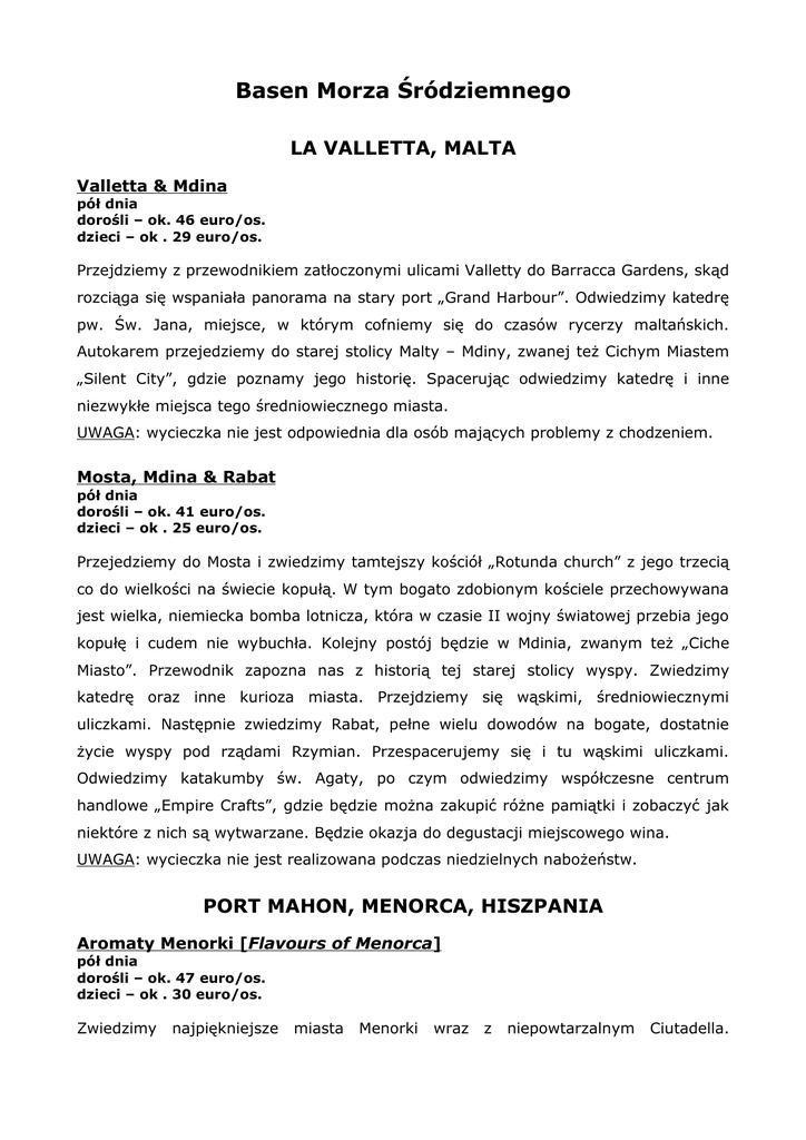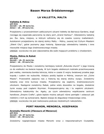 Basen Morza Śródziemnego LA VALLETTA, MALTA Valletta & Mdina pół dnia dorośli – ok. 46 euro/os. dzieci – ok . 29 euro/os. Przejdziemy z przewodnikiem zatłoczonymi ulicami Valletty do Barracca Gardens, skąd rozciąga się wspaniała panorama na stary port „Grand Harbour”. Odwiedzimy katedrę pw. Św. Jana, miejsce, w którym cofniemy się do czasów rycerzy maltańskich. Autokarem przejedziemy do starej stolicy Malty – Mdiny, zwanej też Cichym Miastem „Silent City”, gdzie poznamy jego historię. Spacerując odwiedzimy katedrę i inne niezwykłe miejsca tego średniowiecznego miasta. UWAGA: wycieczka nie jest odpowiednia dla osób mających problemy z chodzeniem. Mosta, Mdina & Rabat pół dnia dorośli – ok. 41 euro/os. dzieci – ok . 25 euro/os. Przejedziemy do Mosta i zwiedzimy tamtejszy kościół „Rotunda church” z jego trzecią co do wielkości na świecie kopułą. W tym bogato zdobionym kościele przechowywana jest wielka, niemiecka bomba lotnicza, która w czasie II wojny światowej przebia jego kopułę i cudem nie wybuchła. Kolejny postój będzie w Mdinia, zwanym też „Ciche Miasto”. Przewodnik zapozna nas z historią tej starej stolicy wyspy. Zwiedzimy katedrę oraz inne kurioza miasta. Przejdziemy się wąskimi, średniowiecznymi uliczkami. Następnie zwiedzimy Rabat, pełne wielu dowodów na bogate, dostatnie życie wyspy pod rządami Rzymian. Przespacerujemy się i tu wąskimi uliczkami. Odwiedzimy katakumby św. Agaty, po czym odwiedzimy współczesne centrum handlowe „Empire Crafts”, gdzie będzie można zakupić różne pamiątki i zobaczyć jak niektóre z nich są wytwarzane. Będzie okazja do degustacji miejscowego wina. UWAGA: wycieczka nie jest realizowana podczas niedzielnych nabożeństw. PORT MAHON, MENORCA, HISZPANIA Aromaty Menorki [Flavours of Menorca] pół dnia dorośli – ok. 47 euro/os. dzieci – ok . 30 euro/os. Zwiedzimy najpiękniejsze miasta Menorki wraz z niepowtarzalnym Ciutadella. Wyjeżdżając z portu Mahon nacieszymy oczy niezwykłymi widokami wnętrza wyspy, a następnie dojedziemy do Arenal den Castell – cudownej plaży. Tu będzie spacer i robienie zdjęć. Kolejnym przystankiem będzie Fornells, wioska rybacka usytuowana na północnym wybrzeżu wyspy, słynna z powodu swego XVII-wiecznego wyglądu, przystań dla piratów. Białe domki mają zielone okiennice i drzwi. Trasa wycieczki zawiedzie nas dalej przez Cala Tirant, malowniczo usytuowaną nad uroczą plażą miejscowość wypoczynkową, do Ciutadella, starej stolicy wyspy. Zachwyci nas ona swymi odkryciami archeologicznymi, kamiennymi posągami, przepięknymi domami wykonanymi w tradycyjnym stylu, urzekającą atmosferą starej dzielnicy i portu. Po spacerze po tej perle Balearów wjedziemy na Mount Toro (Monte Toro), najwyższy na wyspie szczyt. Z tej wysokości przy dobrej pogodzie widać nie tylko całą powierzchnię wyspy (700 km2) ale także i wybrzeża sąsiedniej Majorki. Zwieńczeniem podróży będzie odwiedzenie sanktuarium de Nuestra Seniora de El Toro, kaplicy zbudowanej w XVII-wieku przez mnichów augustiańskich, a obecnie zawiadywanej przez Siostry Miosierdzia, franciszkańską wspólnotę składającą się z mniszek i księdza. Po tym jest powrót do Mahon i czekającego na nas w porcie statku. UWAGA: wycieczka nie jest odpowiednia dla osób na wózkach. TRAPANI, WŁOCHY Erice pół dnia dorośli – ok. 45 euro/os. dzieci – ok . 29 euro/os. Przejedziemy z Trapani autokarem do stacji kolejki linowej, z której dotrzemy do Erice, pięknego, średniowiecznego miasta na szczycie góry, z którego roztacza się unikalny, panoramiczny widok na Trapani i jego solne warzelnie oraz wyspy Egadi. Erice jest czarującym miejscem z tego względu, że czas jakby stanął tu w miejscu. Legenda mówi, że miasto założył Eryx, syn Venus, ku chwale swej matki. Wizytę rozpoczniemy od Porta Trapani, znajdującego się w pobliżu głównego kościoła „Mother Church”, zbudowanego w 1313 roku. Po jego zwiedzeniu przespacerujemy się wąskimi uliczkami i odwiedzimy charakterystyczne sklepy z miejscowym rękodziełem. Dojdziemy do Balio Gardens i do Zamku Wenus – normańskiej fortyfikacji, tam, gdzie stał kiedyś starożytny akropol i świątynia Wenus. Po dojściu do głównego placu będziemy mieli czas na własny spacer i cieszenie się magiczną atmosferą tego miejsca. Na koniec zjedziemy kolejką linową do Trapani. UWAGA: Wycieczka nie jest dla osób z problemami w poruszaniu się. Trasie wiedzie po miejscach kultu religijnego – wymagane jest zakrycie ramion, karku i kolan. Ze względu na wiatr lub z powodu jakiś innych ograniczeń w działaniu kolejki, korzystanie z niej będzie odwołane. Na szczyt wjedzie się wówczas autokarem. Podróż z Trapani do Erice trwa ok. 1 godz. Segesta pół dnia dorośli – ok. 52 euro/os. dzieci – ok . 31 euro/os. Wyjedziemy autobusem z Trapani do Segesta, jednego z najważniejszych miejsc wykopalisk archeologicznych w prowincji Trapani. Segesta była najważniejszym miastem w zachodniej części Sycylii, zamieszkałym przez lud zwany Elimi. Obejrzymy tu świątynię i teatr. Świątynię zbudowano w V wieku p.n.e. by dominowała na szczycie wzgórza. Część schodów wiedzie do wielkiej sali – prestilium – opatrzonej 36 kolumnami. Każdego zachwyca tu złota patyna marmurów. Teatr został wybudowany w czasach greckich i przebudowany przez Rzymian. Znajduje się na wzgórzu, z którego widać zatokę Castellamare. Schodząc z niego ścieżką można podziwiać różne pozostałości tego starożynego miasta. Na koniec wrócimy na statek. UWAGA: na terenach wykopalisk archeologicznych droga nie ma jednolitej powierzchni i nie nadaje się dla osób z problemami w poruszaniu się. Do teatru będziemy dowiezieni małym autokarem. W związku z tym, cała grupa będzie przewieziona partiami. Transfer z Trapani do Segesta trwa ok. 1 godz. Droga solna i smakowanie wina [The Salt Route & Wine 