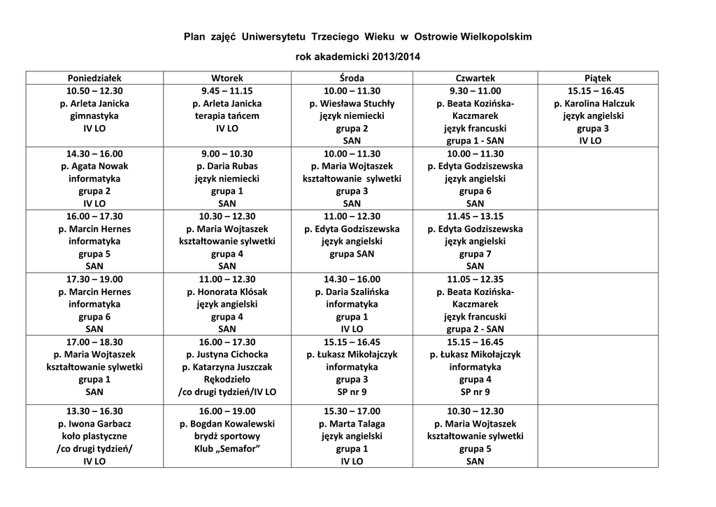 Plan zajęć Uniwersytetu Trzeciego Wieku w Ostrowie Wielkopolskim rok akademicki 2013/2014 Poniedziałek 10.50 – 12.30 p. Arleta Janicka gimnastyka IV LO Wtorek 9.45 – 11.15 p. Arleta Janicka terapia tańcem IV LO 14.30 – 16.00 p. Agata Nowak informatyka grupa 2 IV LO 16.00 – 17.30 p. Marcin Hernes informatyka grupa 5 SAN 17.30 – 19.00 p. Marcin Hernes informatyka grupa 6 SAN 17.00 – 18.30 p. Maria Wojtaszek kształtowanie sylwetki grupa 1 SAN 9.00 – 10.30 p. Daria Rubas język niemiecki grupa 1 SAN 10.30 – 12.30 p. Maria Wojtaszek kształtowanie sylwetki grupa 4 SAN 11.00 – 12.30 p. Honorata Klósak język angielski grupa 4 SAN 16.00 – 17.30 p. Justyna Cichocka p. Katarzyna Juszczak Rękodzieło /co drugi tydzień/IV LO 13.30 – 16.30 p. Iwona Garbacz koło plastyczne /co drugi tydzień/ IV LO 16.00 – 19.00 p. Bogdan Kowalewski brydż sportowy Klub „Semafor” Środa 10.00 – 11.30 p. Wiesława Stuchły język niemiecki grupa 2 SAN 10.00 – 11.30 p. Maria Wojtaszek kształtowanie sylwetki grupa 3 SAN 11.00 – 12.30 p. Edyta Godziszewska język angielski grupa SAN 14.30 – 16.00 p. Daria Szalińska informatyka grupa 1 IV LO 15.15 – 16.45 p. Łukasz Mikołajczyk informatyka grupa 3 SP nr 9 Czwartek 9.30 – 11.00 p. Beata KozińskaKaczmarek język francuski grupa 1 - SAN 10.00 – 11.30 p. Edyta Godziszewska język angielski grupa 6 SAN 11.45 – 13.15 p. Edyta Godziszewska język angielski grupa 7 SAN 11.05 – 12.35 p. Beata KozińskaKaczmarek język francuski grupa 2 - SAN 15.15 – 16.45 p. Łukasz Mikołajczyk informatyka grupa 4 SP nr 9 15.30 – 17.00 p. Marta Talaga język angielski grupa 1 IV LO 10.30 – 12.30 p. Maria Wojtaszek kształtowanie sylwetki grupa 5 SAN Piątek 15.15 – 16.45 p. Karolina Halczuk język angielski grupa 3 IV LO 17.30 – 19.00 17.00 – 18.30 p. Marta Talaga p. Maria Wojtaszek język angielski kształtowanie sylwetki grupa 2 grupa 2 IV LO SAN ------------------------------------ ------------------------------------16.00 -17.30 16.00 – 17.00 p. Krzysztof Ogórkiewicz p. Maria Wojtaszek koło żywego słowa koło taneczne n-Klub SAN ------------------------------------ ------------------------------------16.30 – 17.30 p. Zenona Kędziora pływanie, grupa 2 pływalnia „Delfin” ----------------------------------19.30 – 20.30 p. Zenona Kędziora pływanie, grupa 1 pływalnia „Delfin” Klub „Podróżnik” – wykład- wtorek godz.16.00 /raz w miesiącu/,wycieczki /raz w miesiącu/ Wykład audytoryjny – wtorek – godz.16.00 / raz w miesiącu/